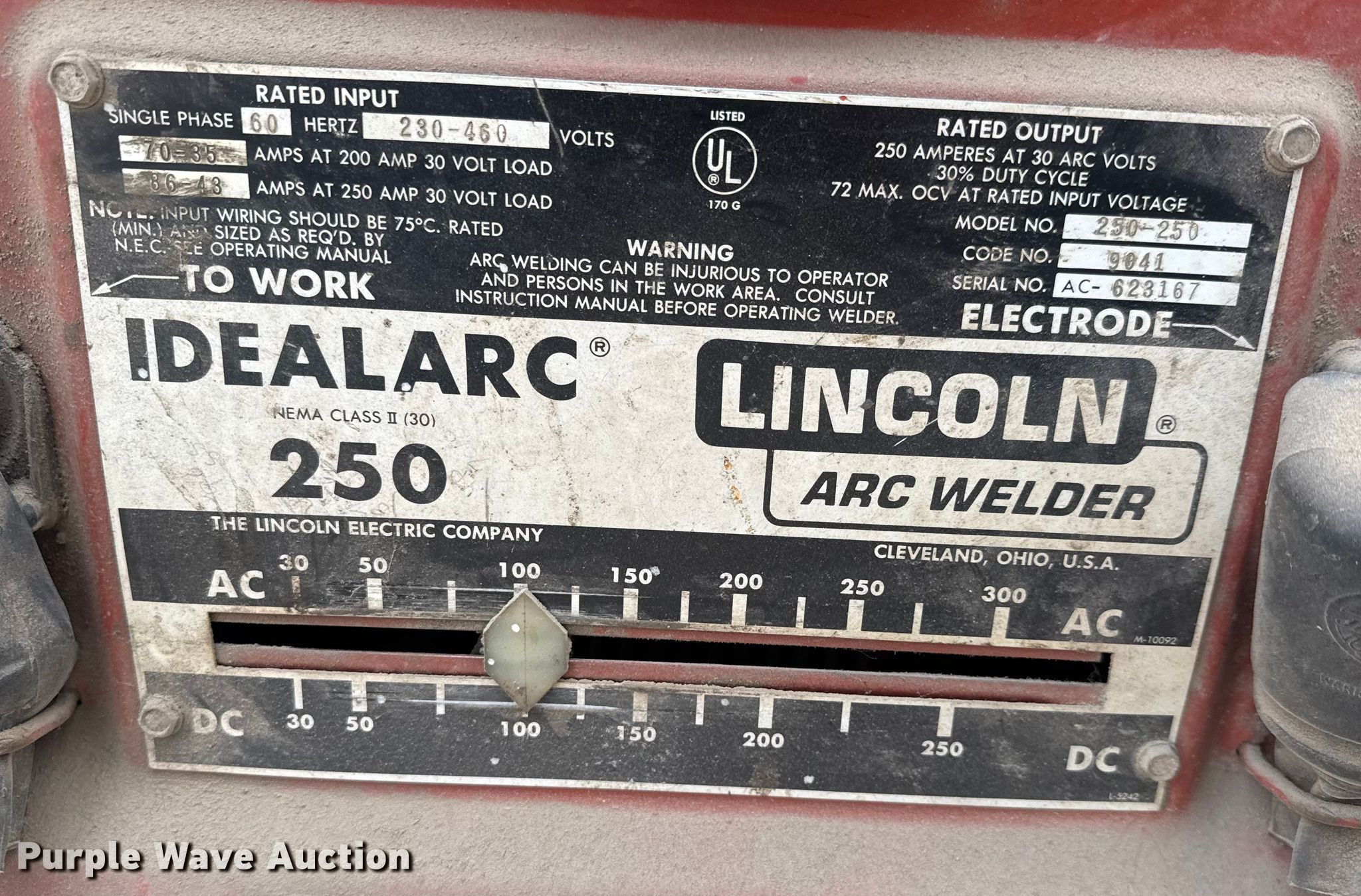 Purple Wave is selling a used Welder (Manual) in Kansas. This item is a Lincoln 250-250 welder with the following: Serial: 623167
