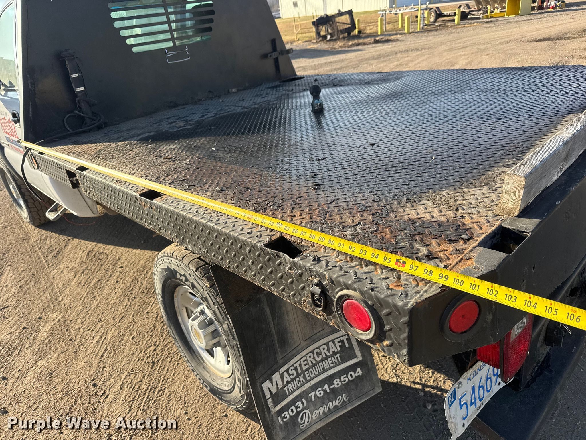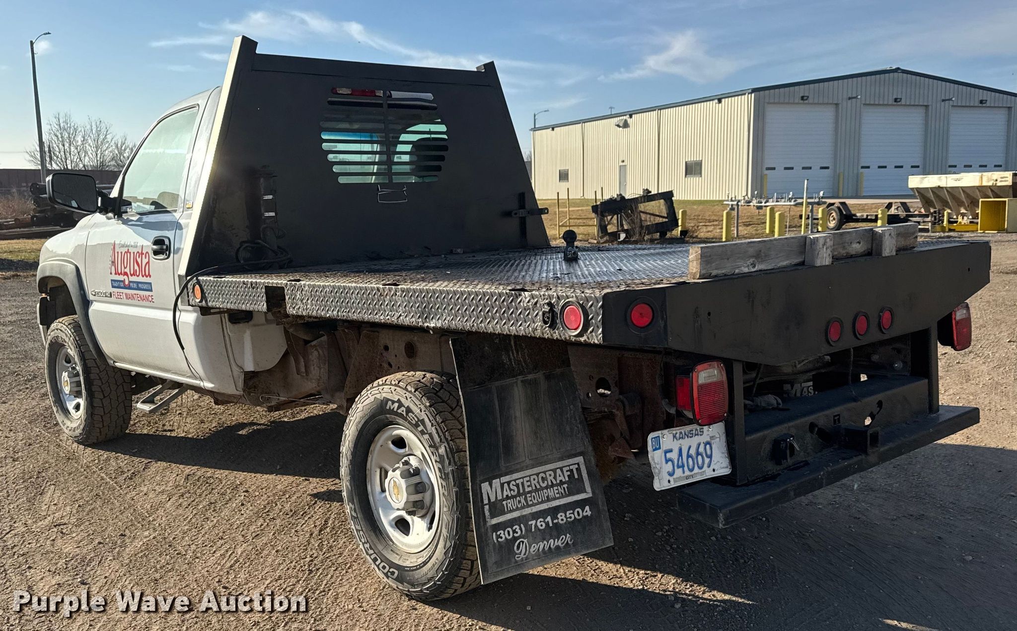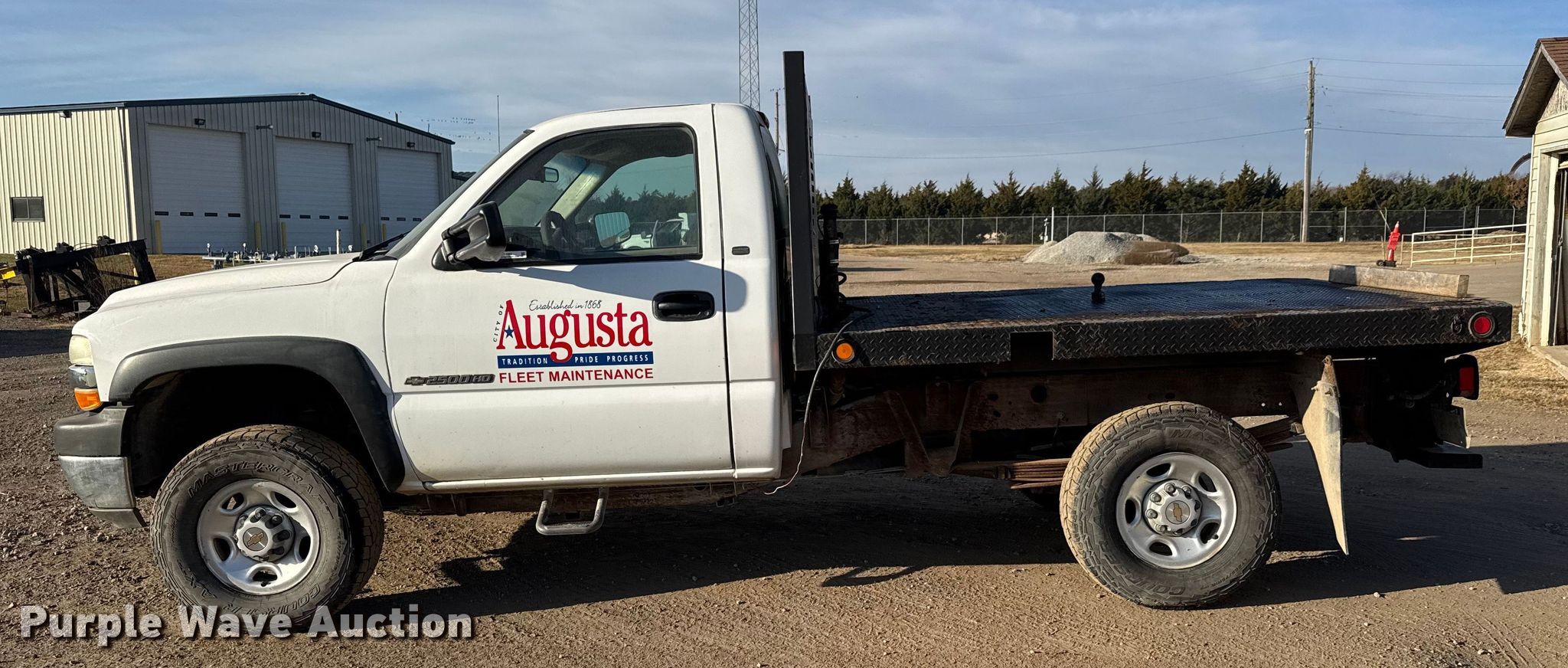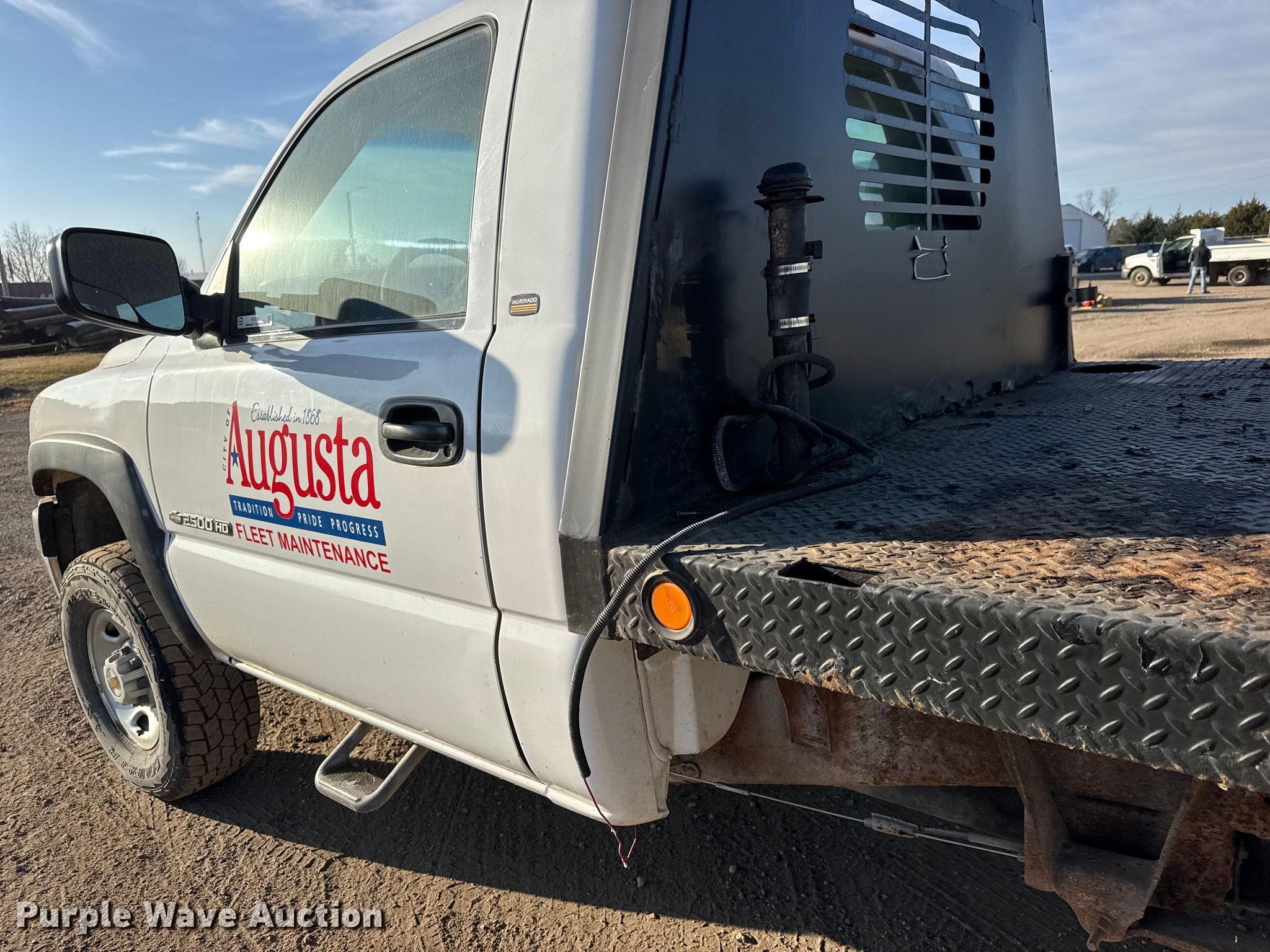 2002 Chevrolet Silverado 2500HD flatbed pickup truck. Miles: 74,840 on odometer, VIN: 1GCHK24GX2E228948. Engine Displacement: 8.1L, Cylinders: 8, Fuel type: Gas. Transmission Automatic, Four wheel drive. Interior AC, Heat. Features Bed Flatbed, Length: 8' 5", Width: 84". Tires Size: 265/75R16. Notes Battery not included. Kansas title. Title distribution may be delayed up to 14 days from verification of funds. City of Augusta. Augusta, KS 67010