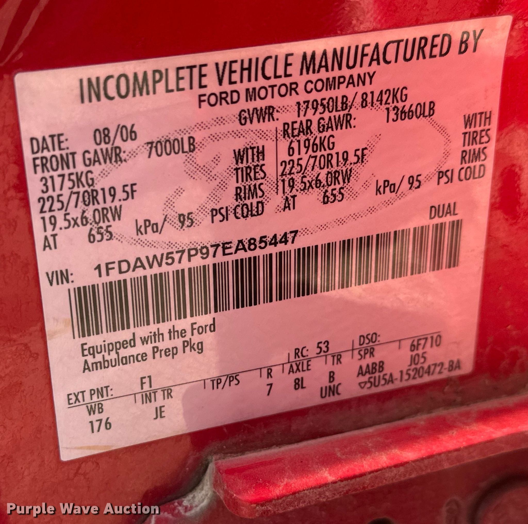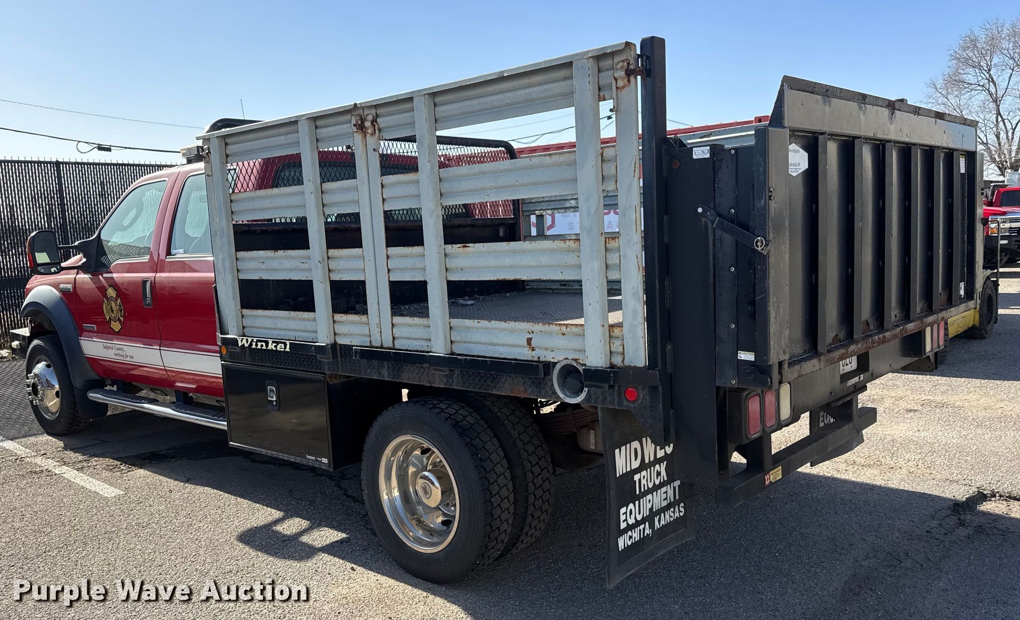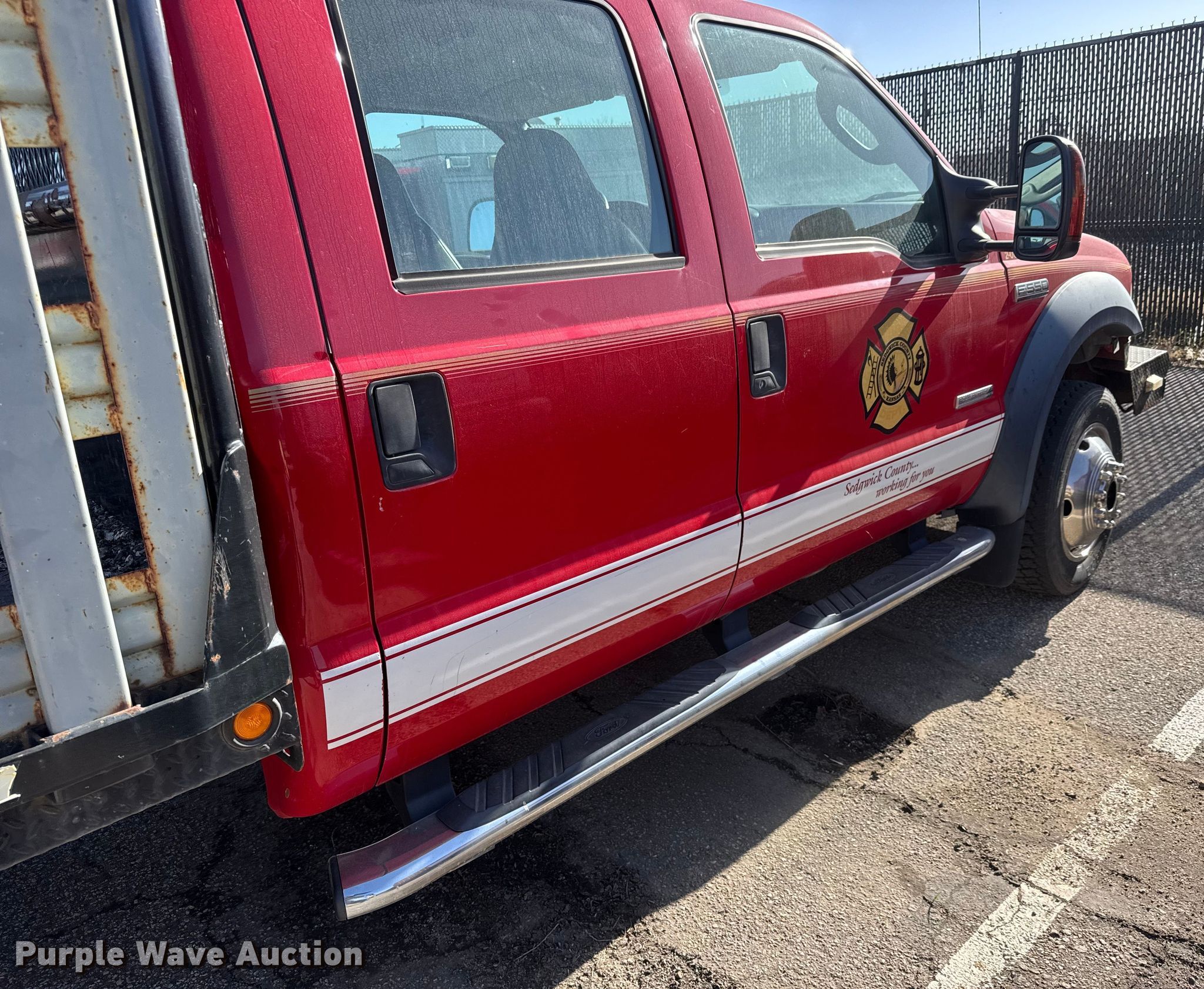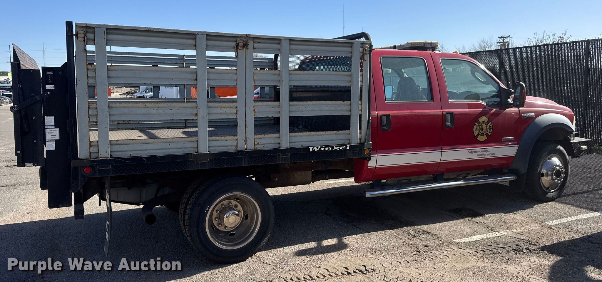 2007 Ford F550 Crew Cab flatbed pickup truck. Miles: 116,563 on odometer, Hours: 5,017 on meter, VIN: 1FDAW57P97EA85447. Engine Displacement: 6.0L, Cylinders: 8, Fuel type: Diesel. Transmission Automatic. Chassis Four wheel drive, Axles: Single, Suspension: Spring, Brakes: Hydraulic, GVWR: 17,950 lbs. Interior AC, Heat, Heated mirrors, Power windows, Power locks, Cruise control, Auxiliary controls, Brake controller. Features Bed Flatbed, Winkel, Length: 9', Width: 96" Removable sides, End gate lift Tommy Gate Tommy Lift, Capacity: 1,600 lbs, Winch. Tires Size: 225/70R19.5. Notes Fuel system issues Unit must be towed or hauled, Unknown operating condition. Kansas title. Title distribution may be delayed up to 14 days from verification of funds. Sedgwick County Fire Department. Wichita, KS 67213