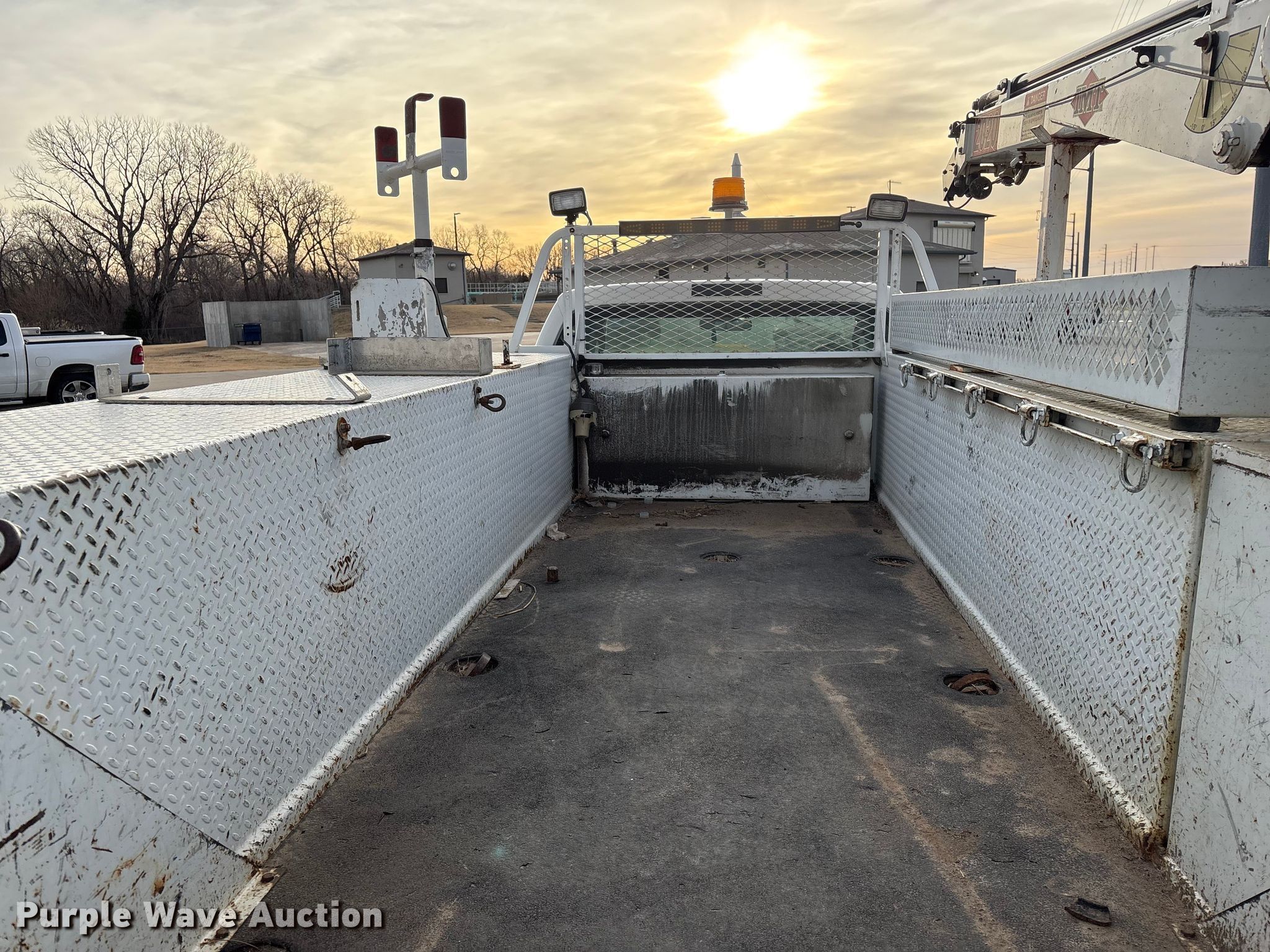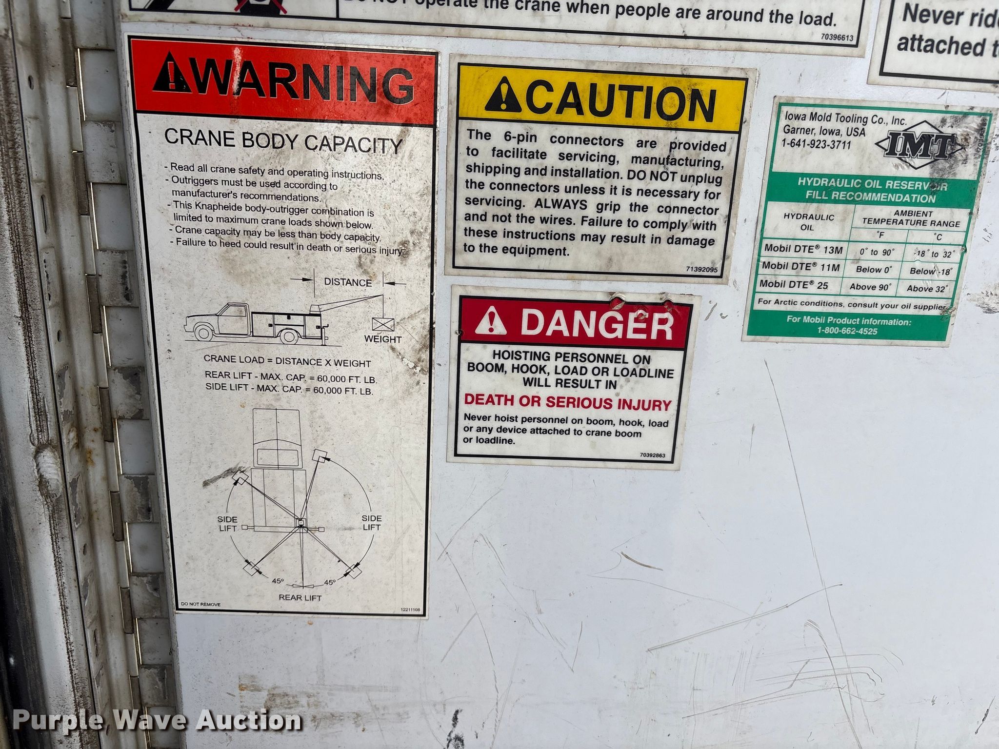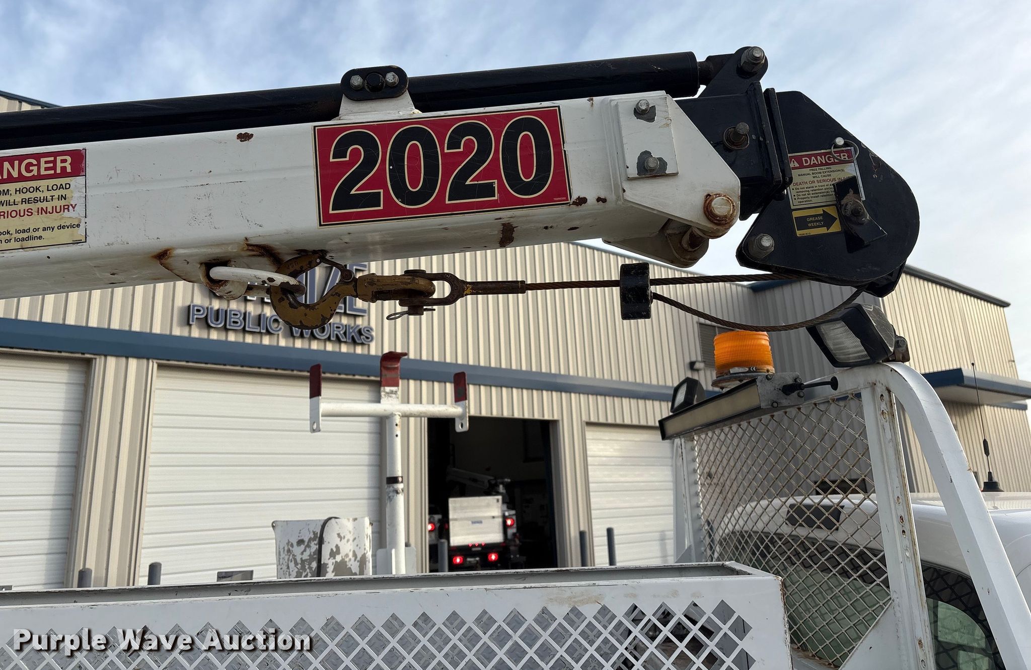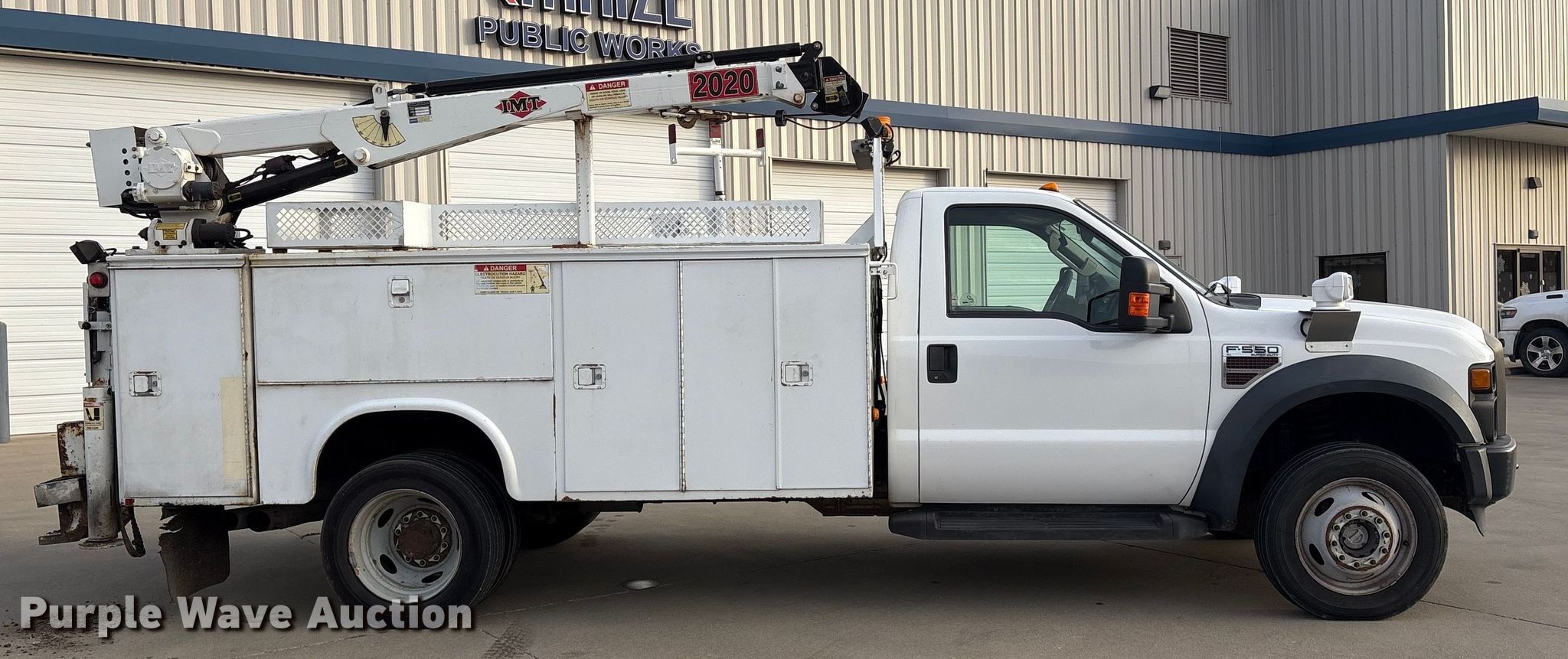 2008 Ford F550 utility / service truck. Miles: 160,484 on odometer, Hours: 8,441 on meter, VIN: 1FDAF57R88EE22483. Engine Displacement: 6.4L, Cylinders: 8, Fuel type: Diesel. Transmission Automatic. Chassis Four wheel drive, Axles: Single, Suspension: Spring, Brakes: Hydraulic, GVWR: 19,500 lbs. Interior AC, Heat, Heated mirrors, Power windows, Power locks, Cruise control, Auxiliary controls, Brake controller. Features Bed Hook lift bed, Knapheide 6132DL-38J, Serial: 20080901-0129488, Length: 11' 5", Width: 94", Crane Iowa Mold Tooling 2020 J610144, Maximum boom length: 20' Maximum lift capacity: 5,000 lbs, End gate lift Tommy Gate SUW54-1340S27TP00, Capacity: 1,300 lbs. Tires Size: 225/70R19.5. Notes Hydraulic leak, Oil leak, Non-operational AC. Kansas title. Title distribution may be delayed up to 14 days from verification of funds. Maize, KS 67101
