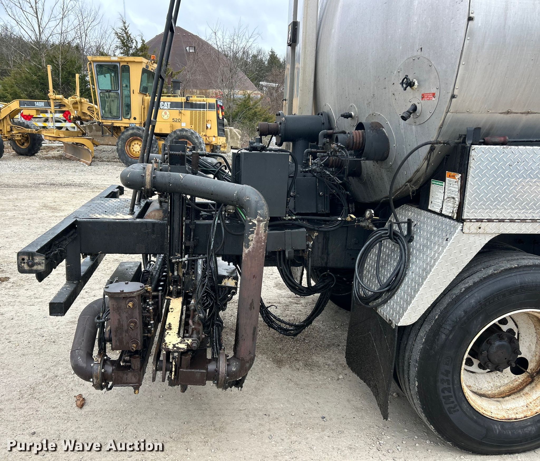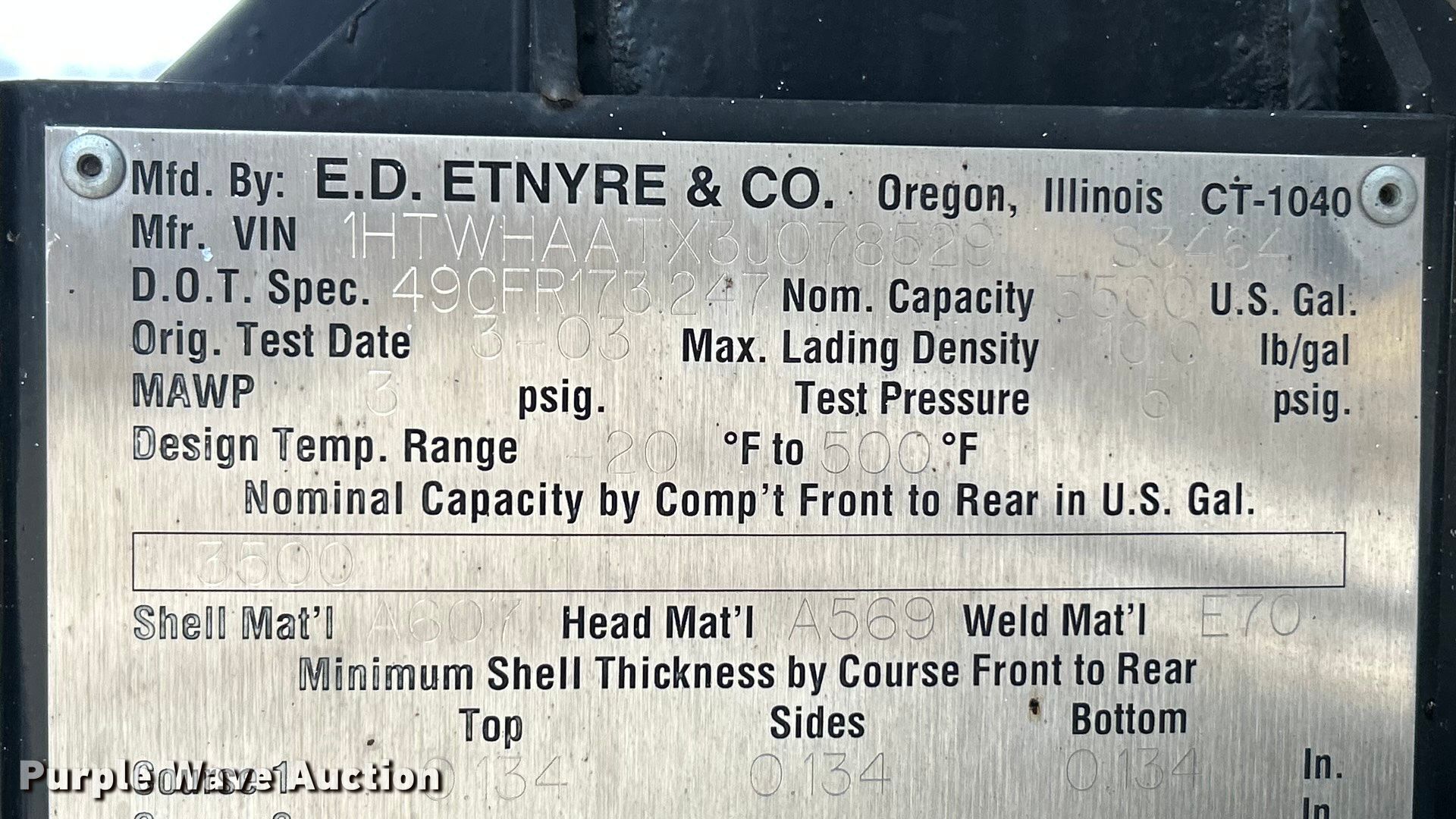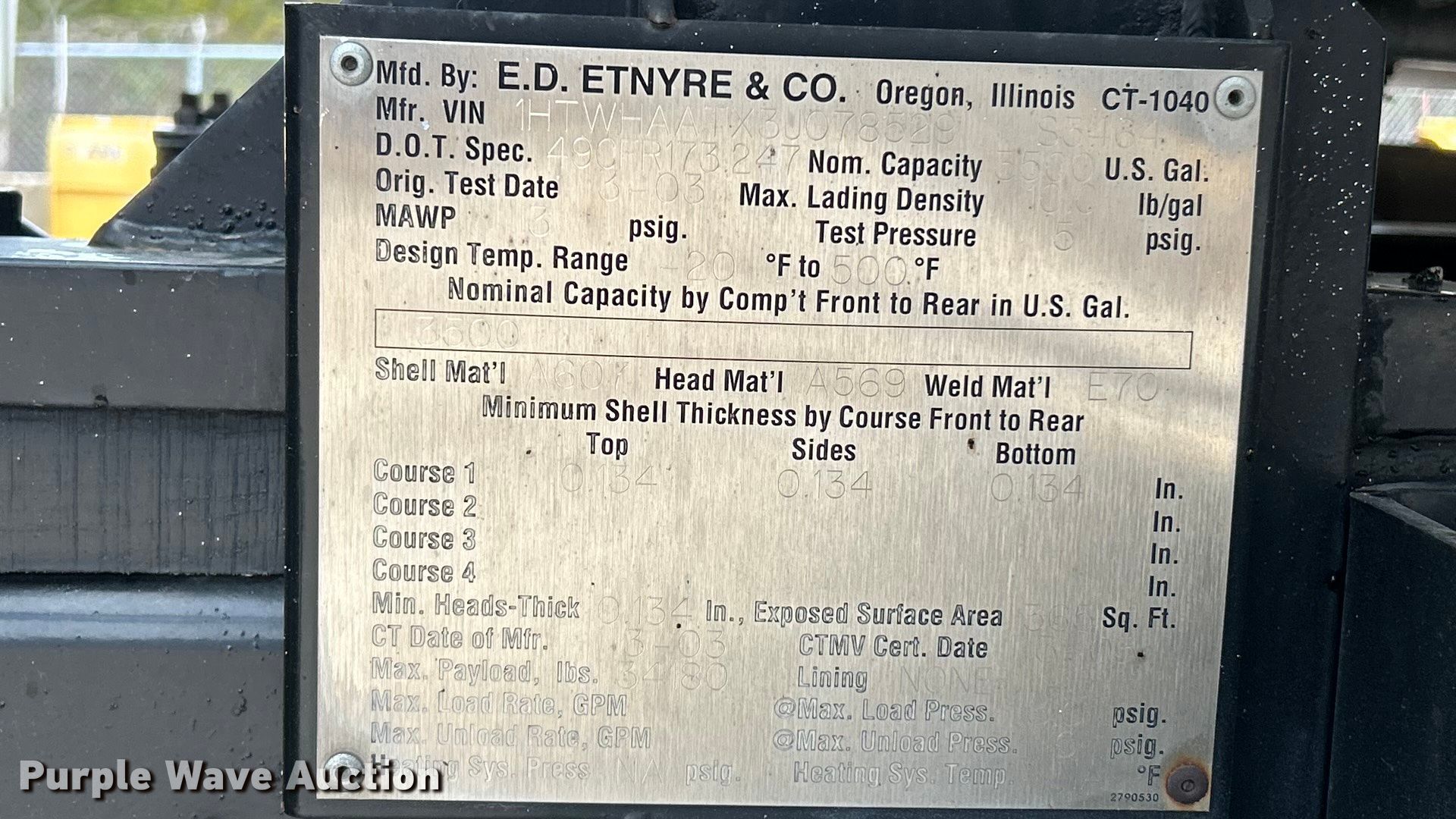 2003 International 7400 oil distributor truck. Miles: 32,155 on odometer, Hours: 5,456 on meter, VIN: 1HTWHAATX3J078529. Engine International CH250, Displacement: 7.6L, Cylinders: 6, Fuel type: Diesel. Transmission Eaton Fuller 8 Speed Lo & Lo-Lo, Manual. Chassis Axles: Tandem, Differential lock: Inter-axle, Suspension: Spring over walking beam, Brakes: Air, PTO, GVWR: 58,000 lbs. Interior AC, Heat, Heated mirrors, Cruise control, Auxiliary controls. Features Bed Tank bed, Etnyre Black - Topper Centennial, Serial: S3464, Length: 15', Capacity: 3,500 gallons, Burner: LPG, In-cab controls, Spray boom Width: 18', Folding, Nozzles: 54.. Tires Front: 315/80r22.5, Rear: 11R22.5. Notes Spare tire included, Windshield chipped or cracked. Missouri title. Title distribution may be delayed up to 14 days from verification of funds. Jefferson County Public Works. Hillsboro, MO 63050