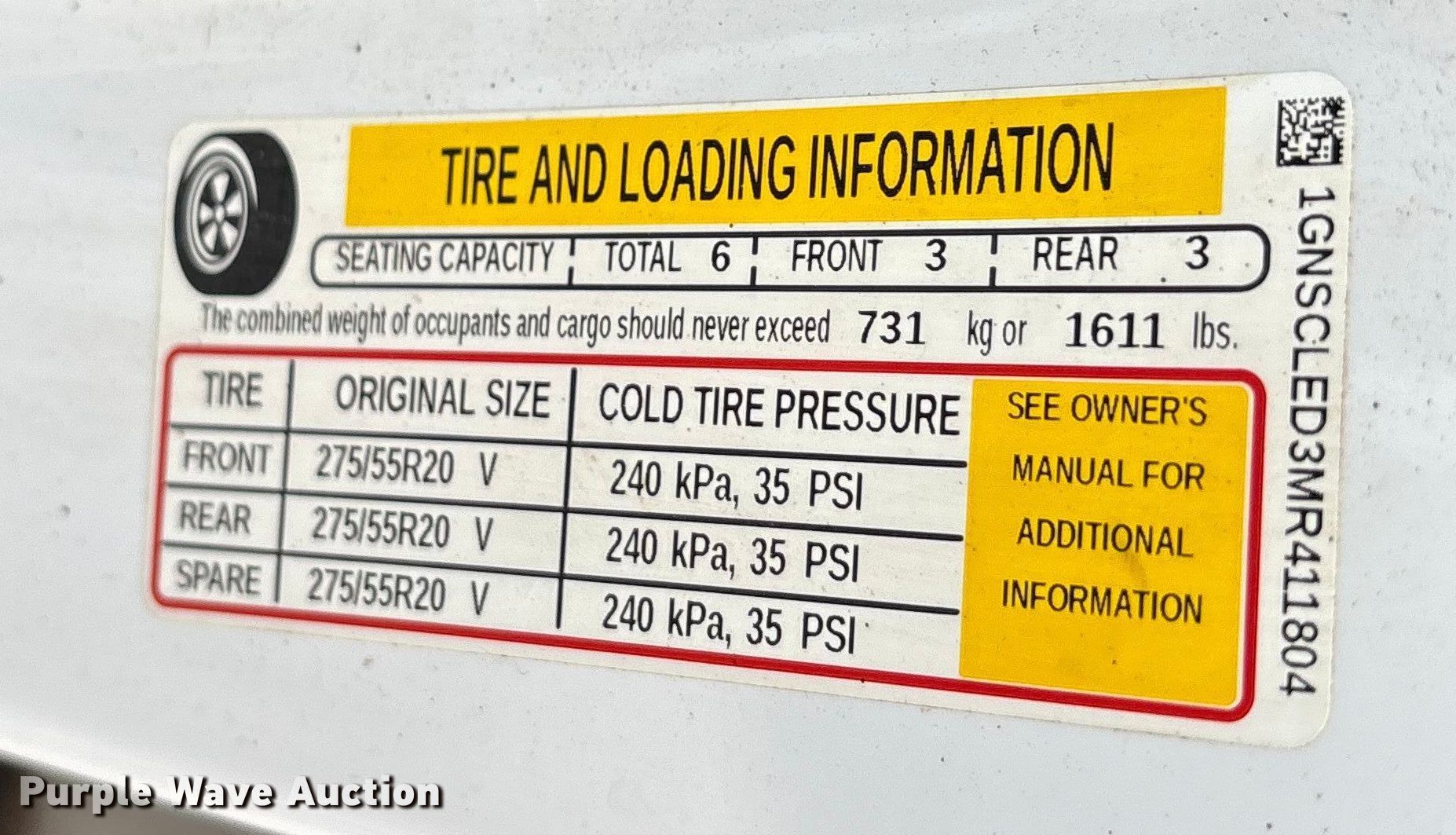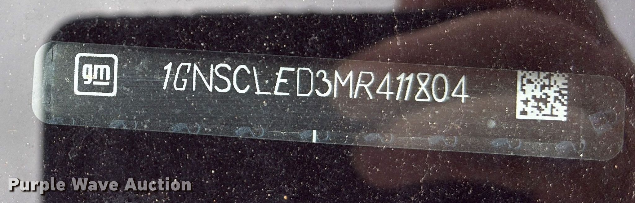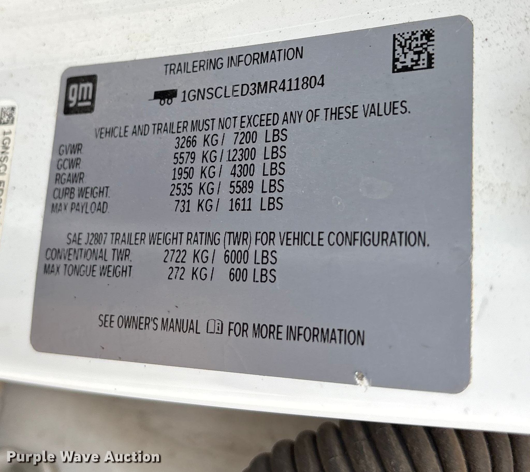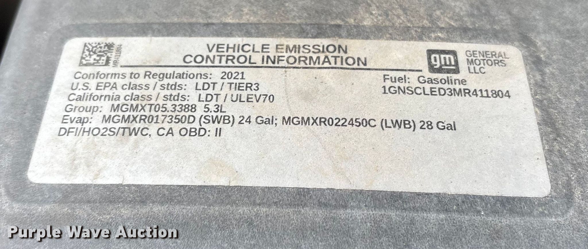 2021 Chevrolet Tahoe SUV. Miles: 123,483 on odometer, VIN: 1GNSCLED3MR411804, Unit #: 2104. Engine Displacement: 5.3L, Cylinders: 8, Fuel type: Gas. Transmission Automatic. Interior AC, Heat, Seat: Power driver, Power passenger, Power windows, Power locks, Cruise control, Backup camera. Tires Size: 275/55R20. Notes Jump start required during on-site data collection. Texas title. Title distribution may be delayed up to 14 days from verification of funds. Rusk County, TX. Henderson, TX 75652