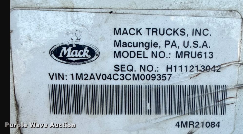 Purple Wave is selling a used Refuse Truck in Texas. This item is a 2012 Mack MRU613 refuse truck with the following: Miles: 183,842 on odometer, Hours: 12,692 on meter, VIN: 1M2AV04C3CM009357