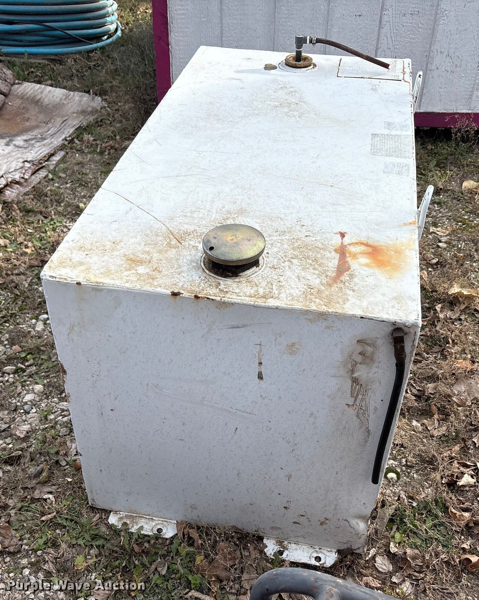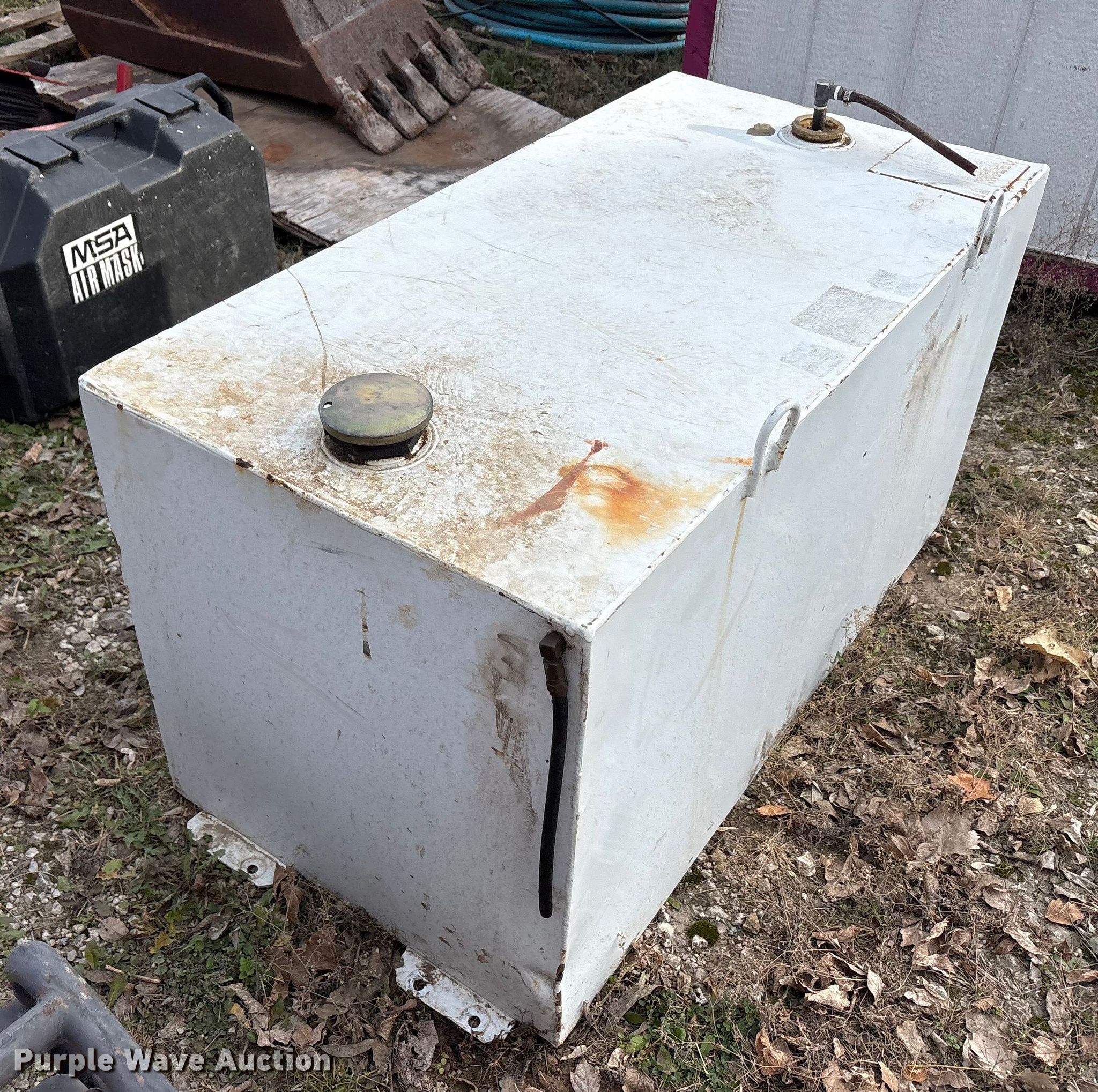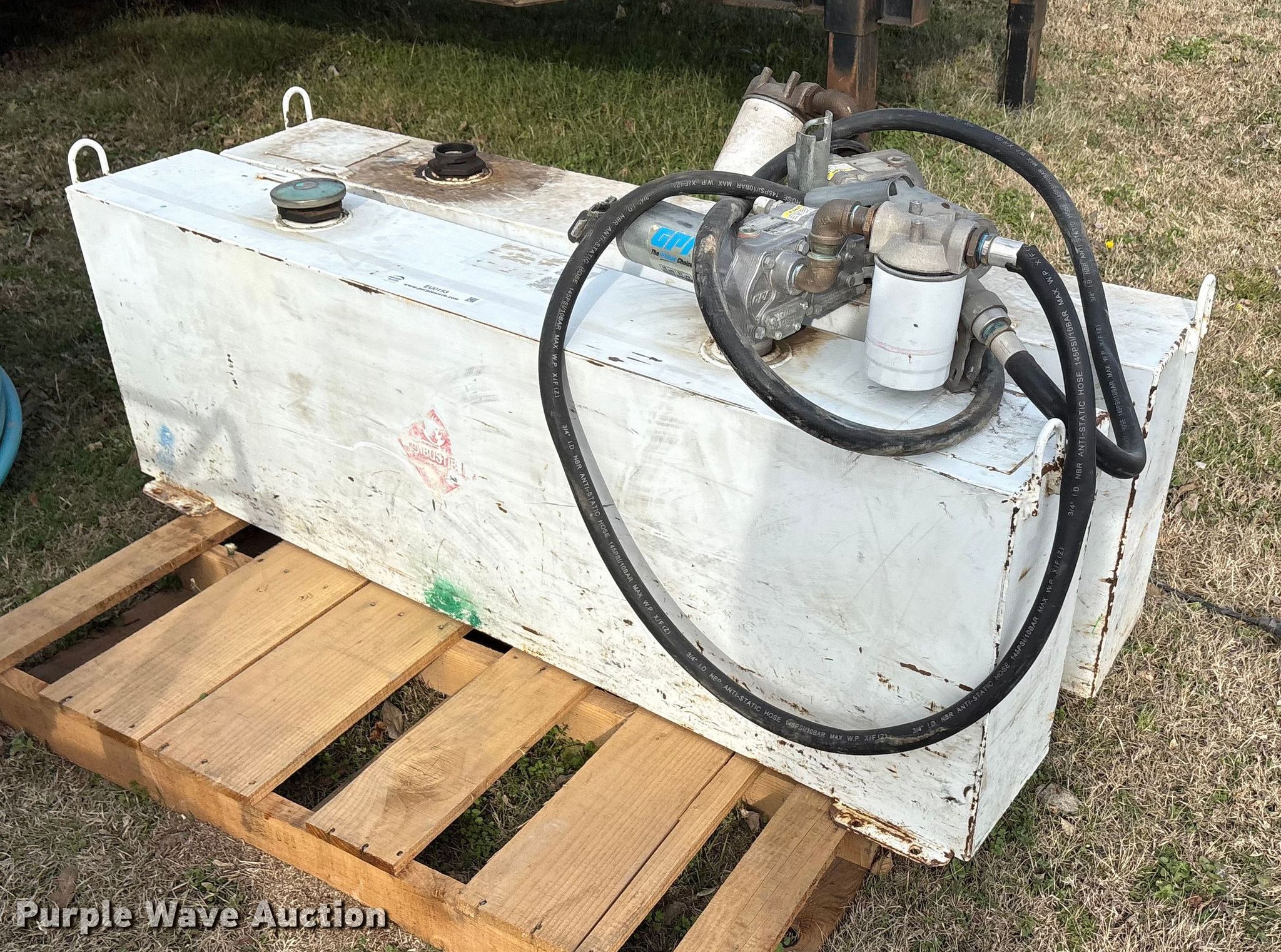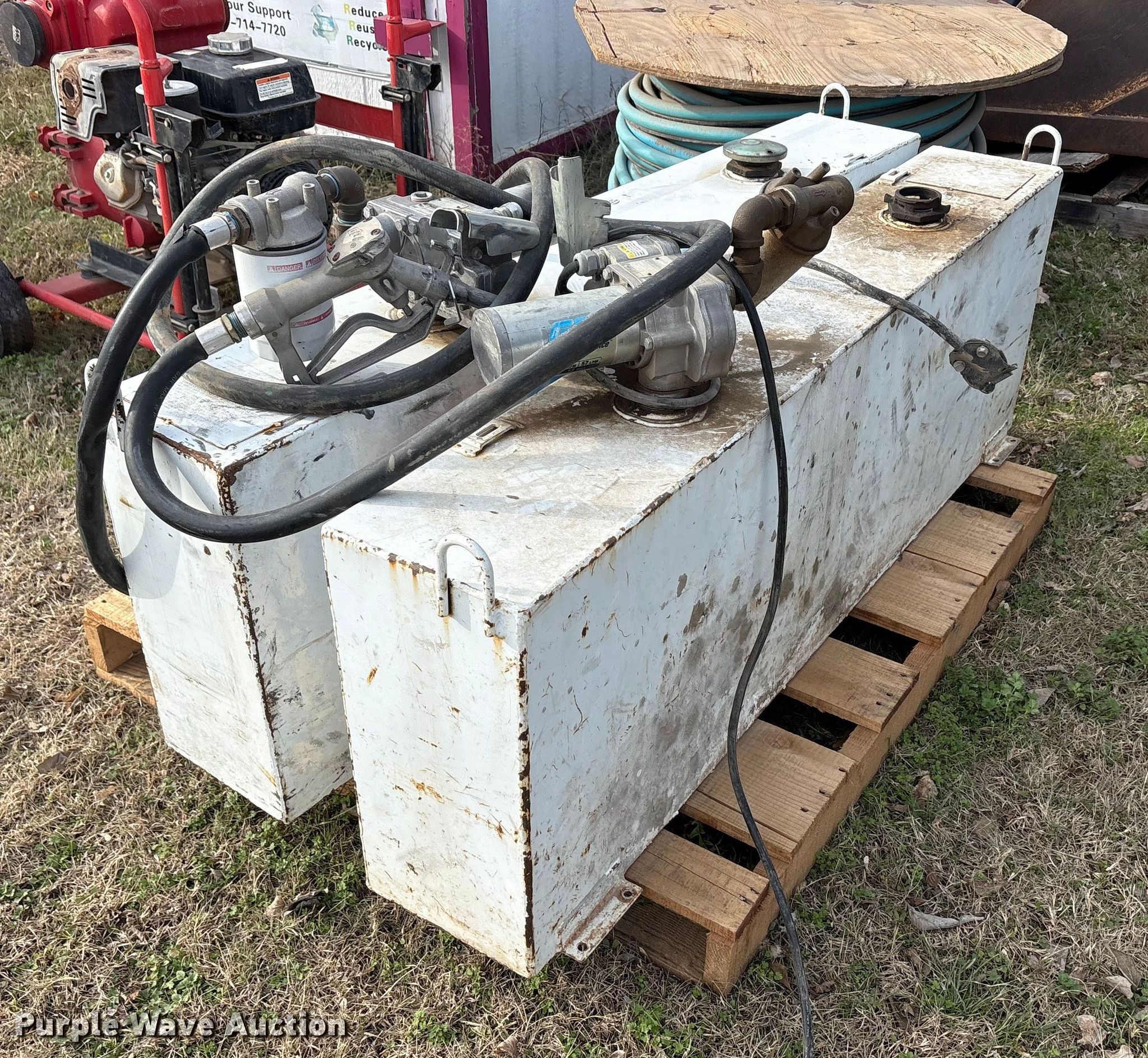 Purple Wave is selling a used Fuel and Lube in Texas. This item is a (3) fuel tanks with the following: (2) tanks, 9" x 60" x 19", Top fill, GPI electric pump, Volts: 12, Capacity: 36 gallons each, Tank, 45" x 23" x 24", Capacity: 100 gallons