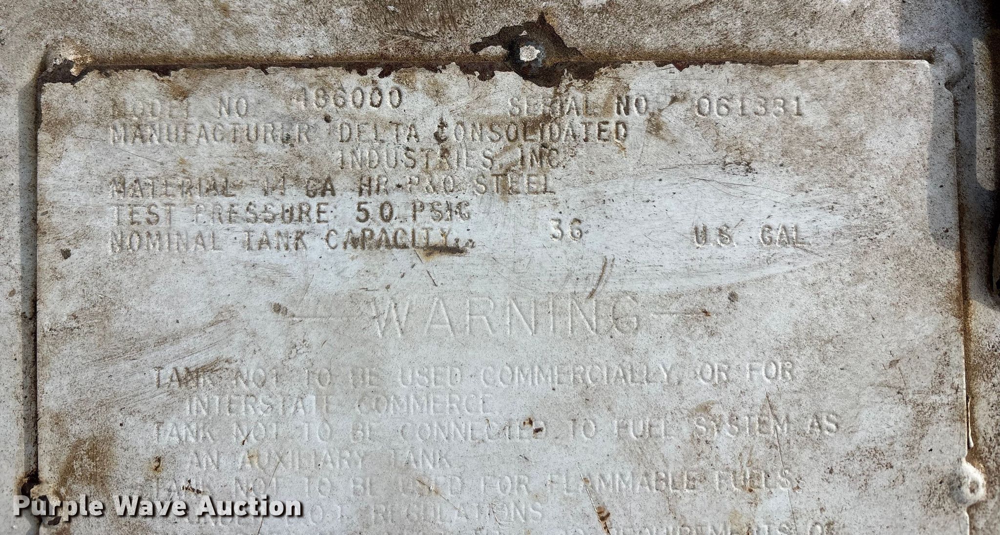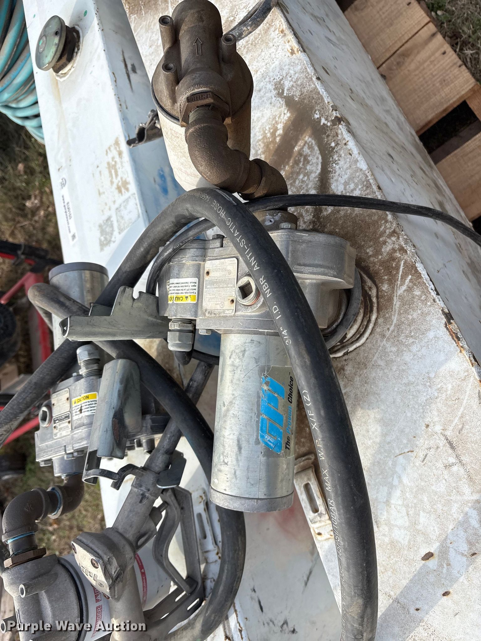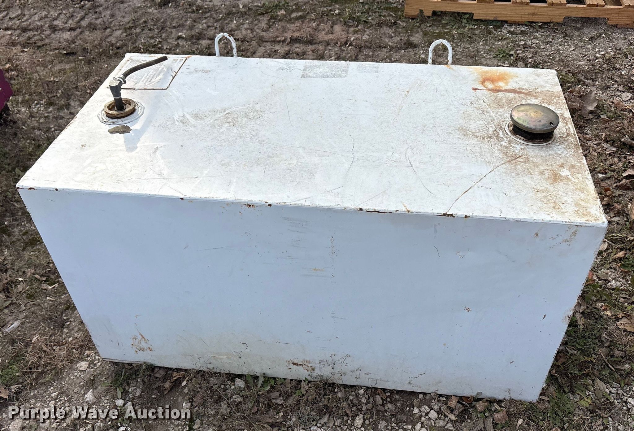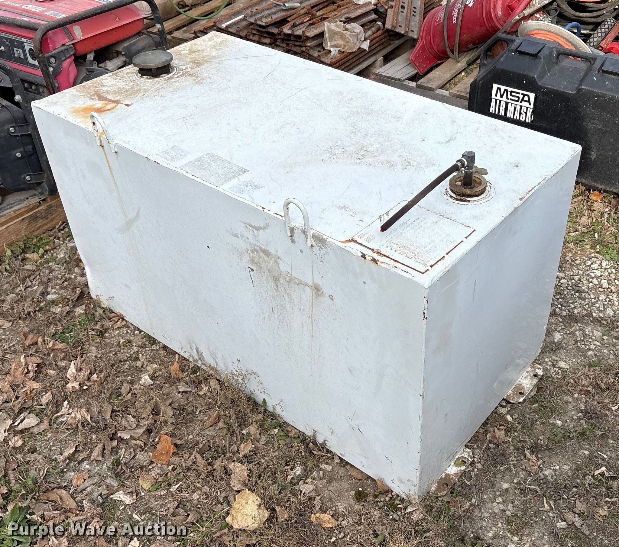 Purple Wave is selling a used Fuel and Lube in Texas. This item is a (3) fuel tanks with the following: (2) tanks, 9" x 60" x 19", Top fill, GPI electric pump, Volts: 12, Capacity: 36 gallons each, Tank, 45" x 23" x 24", Capacity: 100 gallons