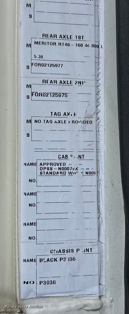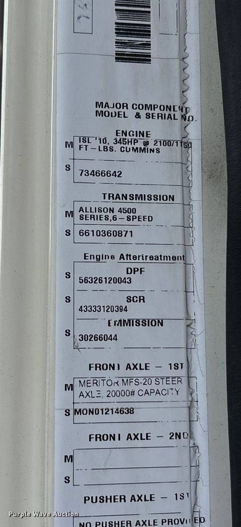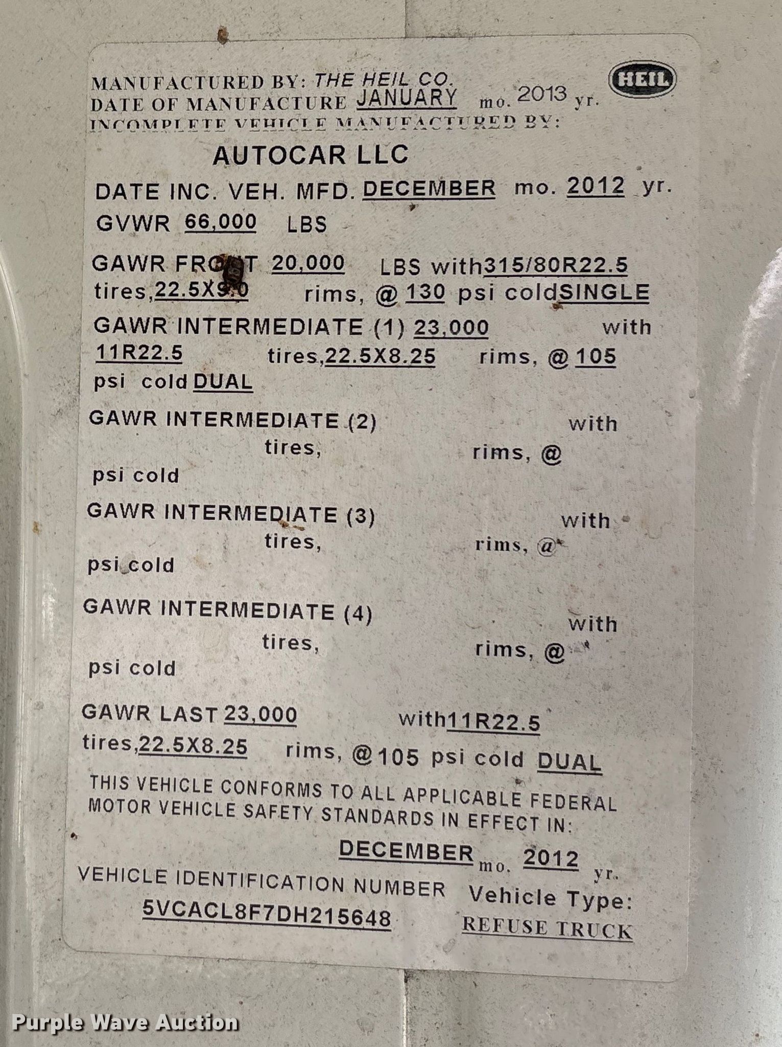 2013 Autocar ACX Xpeditor refuse truck. Miles: 75,349 on odometer, Hours: 14,745 on meter, VIN: 5VCACL8F7DH215648. Engine Cummins ISL SCR, Displacement: 8.9L, Cylinders: 6, Fuel type: Diesel. Transmission Automatic. Chassis Axles: Tandem, Suspension: Spring, Brakes: Air, PTO, GVWR: 66,000 lbs. Interior AC, Heat, Heated mirrors, Power passenger window, Cruise control, Backup camera. Features Refuse bed Heil 612-3611, Serial: 7S7304349, Capacity: 28 cu.yd., Load: Side, Cart tipper. Tires Front: 315/80R22.5, Rear: 11R22.5, Brand: Firestone. Notes Dash warning indicator: Check engine, Packer cylinders leak. Texas title. Seller is a government entity who will be assigning and distributing the title. Please contact the seller for distribution questions. City Of Sherman. Sherman, TX 75090
