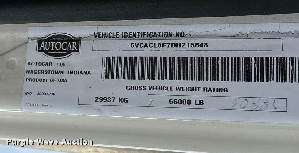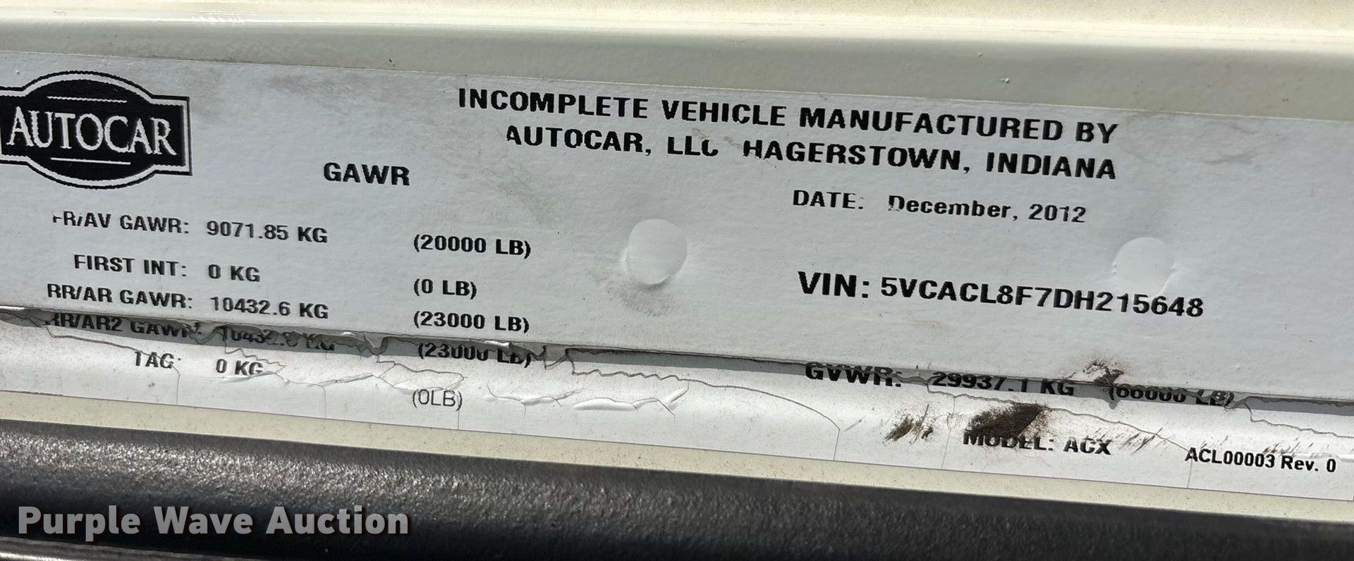 Purple Wave is selling a used Refuse Truck in Texas. This item is a 2013 Autocar ACX Xpeditor refuse truck with the following: Miles: 75,349 on odometer, Hours: 14,745 on meter, VIN: 5VCACL8F7DH215648