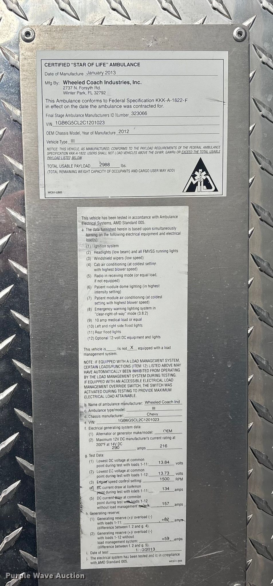 2012 Chevrolet 4500 Express ambulance. Miles: 194,316 on odometer, VIN: 1GB6G5CL2C1201023. Engine Displacement: 6.6L, Cylinders: 8, Fuel type: Diesel. Transmission Automatic. Chassis Axles: Single, Suspension: Spring, Brakes: Hydraulic, GVWR: 14,200 lbs. Interior AC, Heat, Power windows, Power locks, Cruise control. Features Ambulance body Wheeled Coach Industries Type III. Tires Size: 225/75R16. Notes Windshield chipped or cracked, Batteries missing, Unit must be towed or hauled , Non-operational unit. Oklahoma title. Title distribution may be delayed up to 14 days from verification of funds. City of Checotah. Checotah, OK 74426