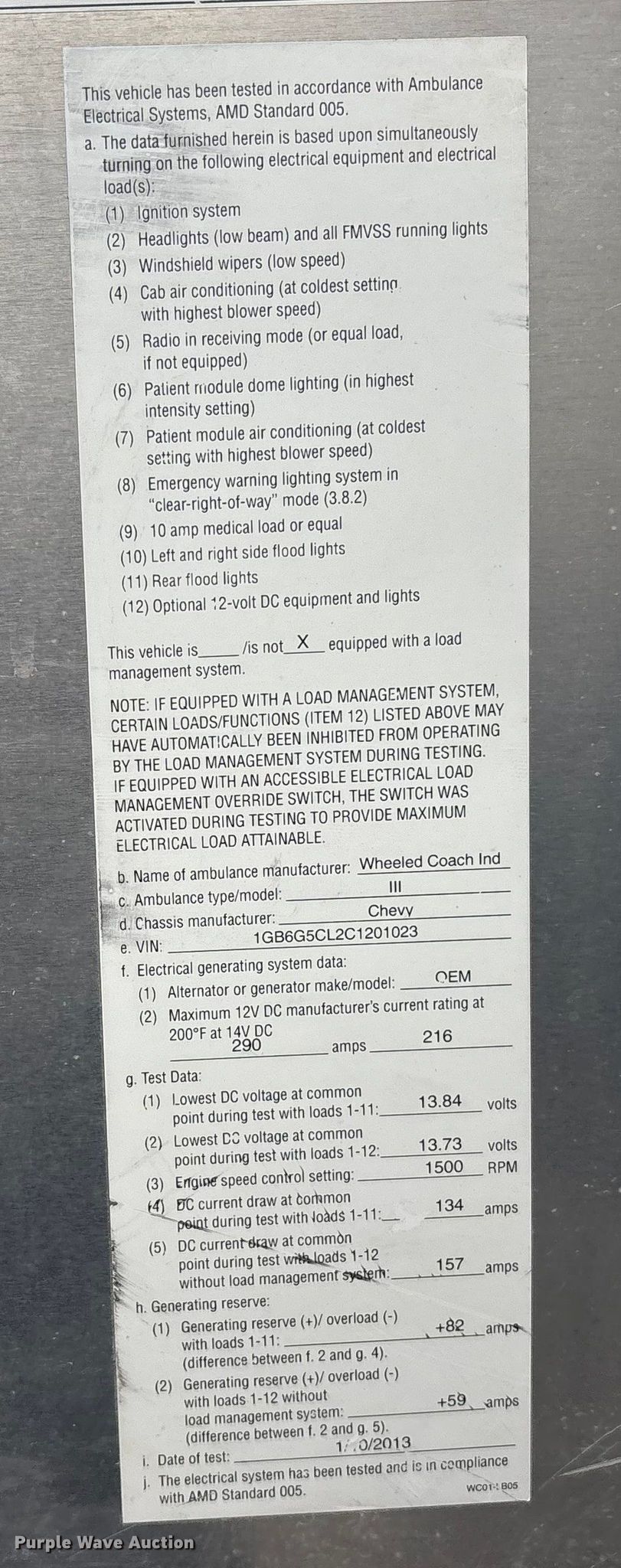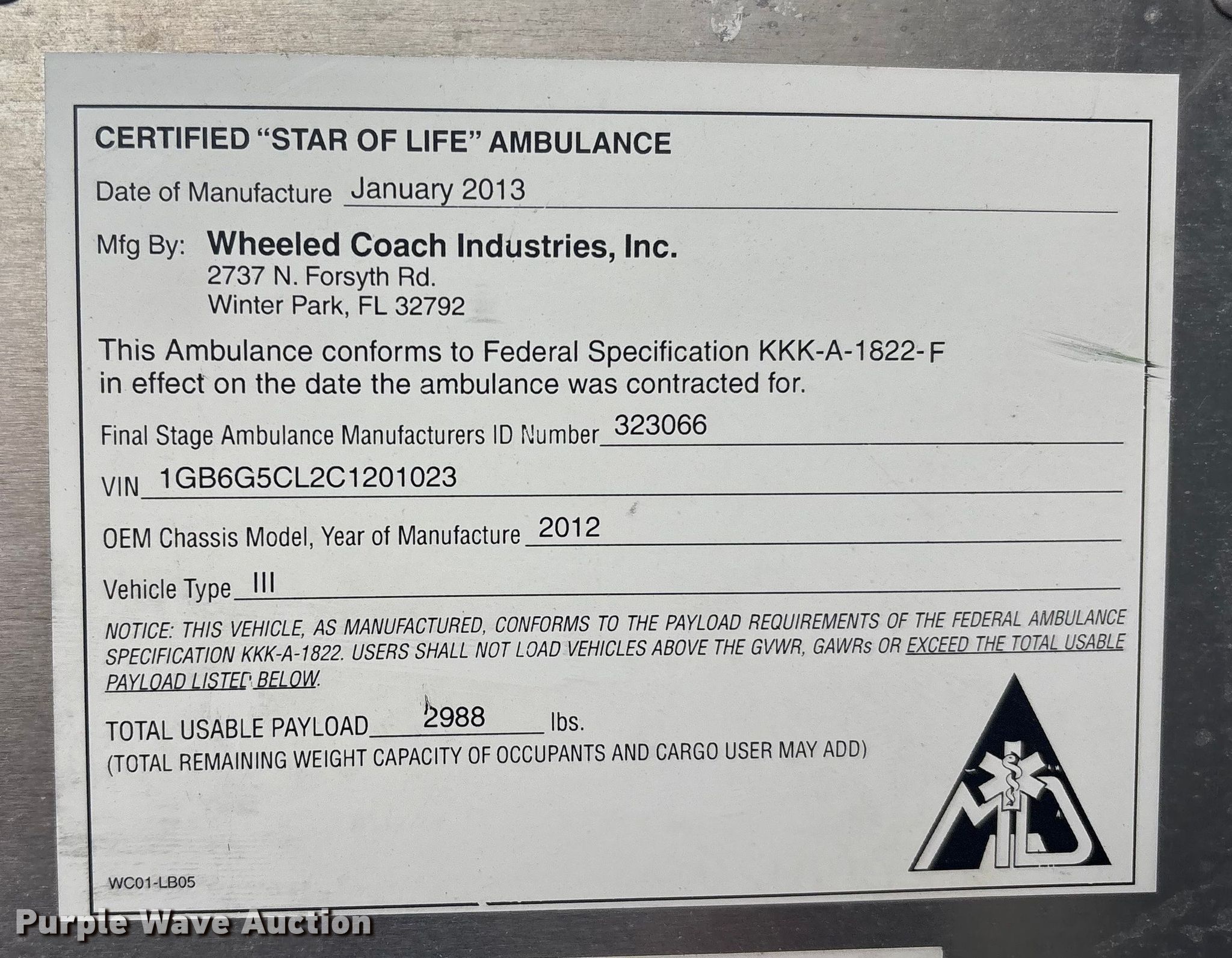 Purple Wave is selling a used Fire Truck or Emergency Vehicle in Oklahoma. This item is a 2012 Chevrolet 4500 Express ambulance with the following: Miles: 194,316 on odometer, VIN: 1GB6G5CL2C1201023