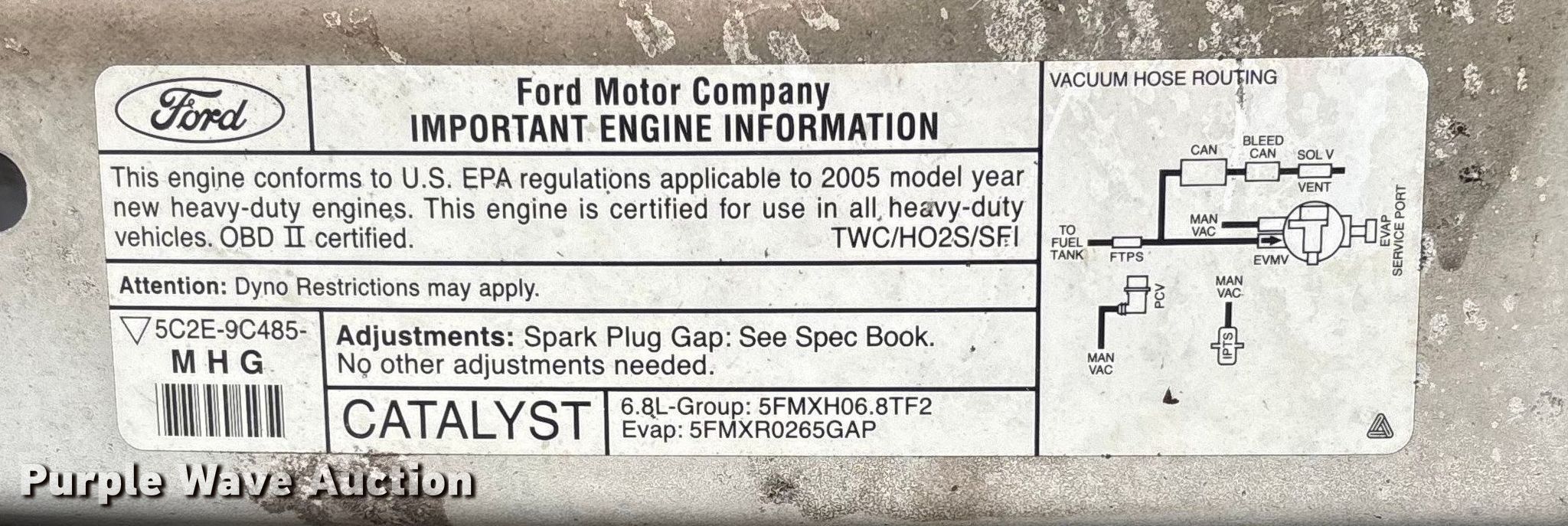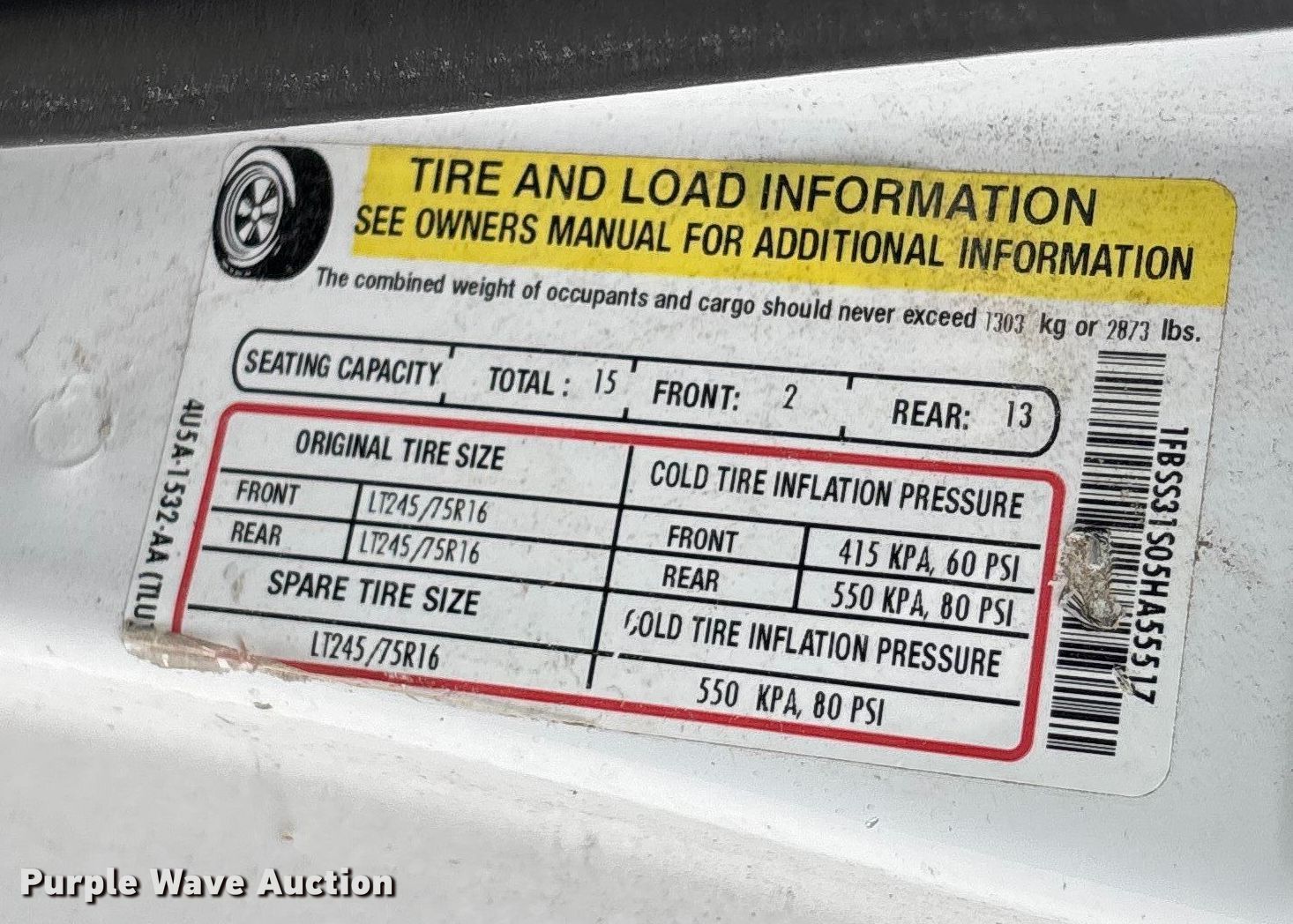 2005 Ford E350 van. Miles: 164,820 on odometer, VIN: 1FBSS31S05HA55517. Engine Displacement: 6.8L, Cylinders: 10, Fuel type: Gas. Transmission Automatic. Interior AC, Heat, Cruise control. Tires Size: 245/75R16. Notes Unit must be towed or hauled, Windshield chipped or cracked, Jump start required during on-site data collection, Missing battery. Oklahoma title. Title distribution may be delayed up to 14 days from verification of funds. NE Oklahoma A&M. Miami, OK 74354