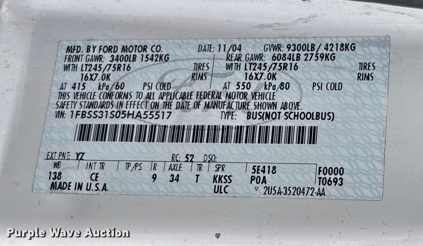 Purple Wave is selling a used Passenger Vehicle in Oklahoma. This item is a 2005 Ford E350 van with the following: Miles: 164,820 on odometer, VIN: 1FBSS31S05HA55517