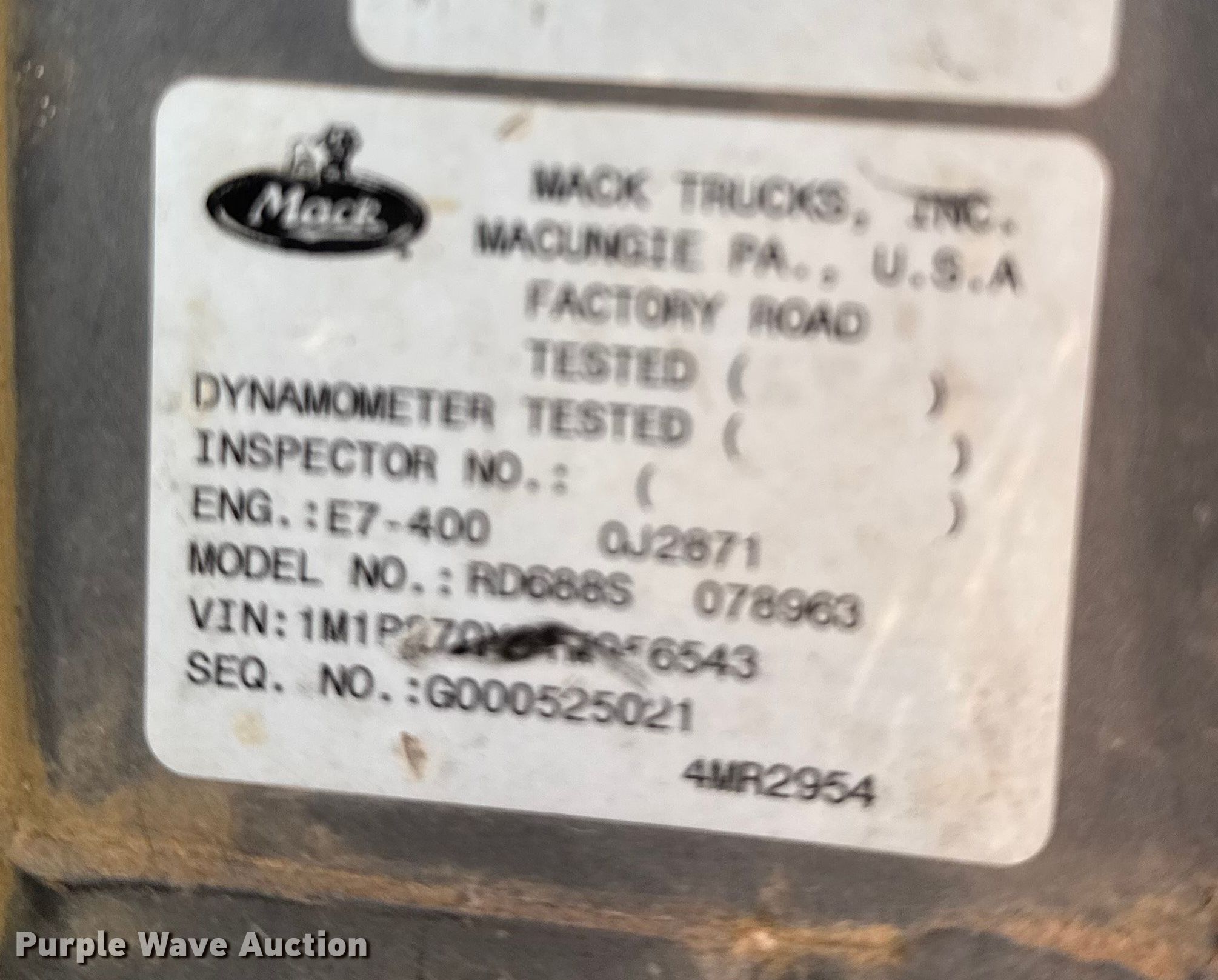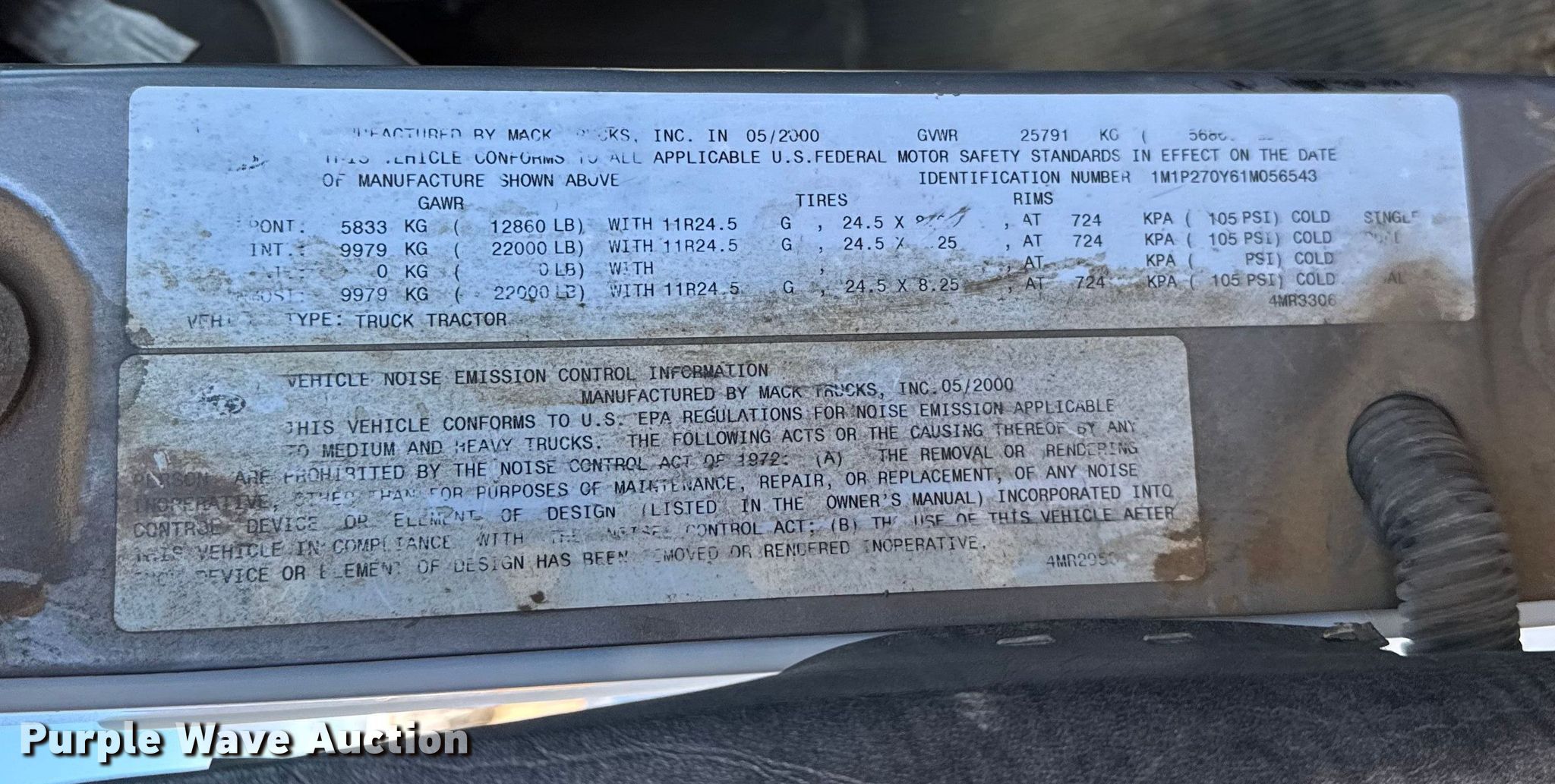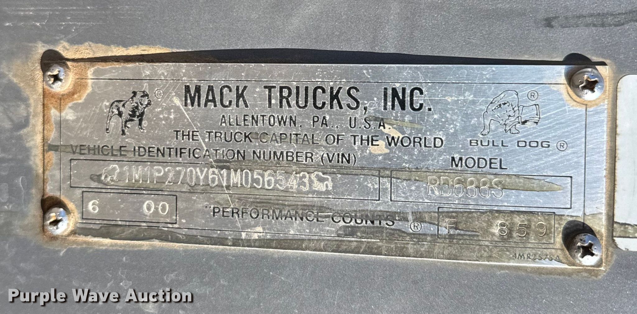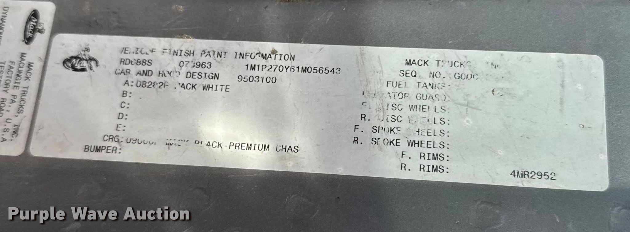 Purple Wave is selling a used Truck Tractor in Kansas. This item is a 2001 Mack RD semi truck with the following: Miles: 424,726 on odometer, Hours: 15,600 on meter, VIN: 1M1P270Y61M056543