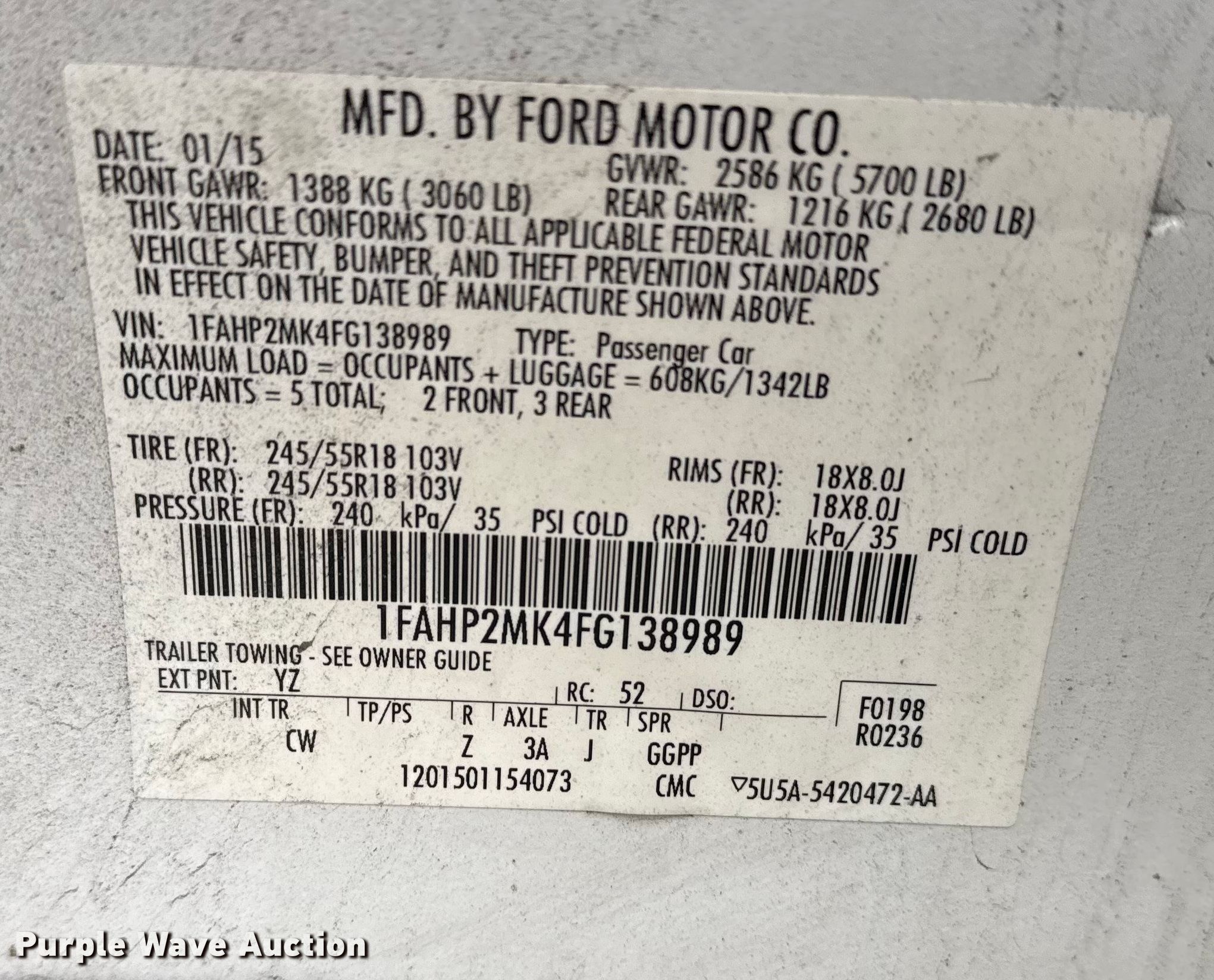 2015 Ford Taurus Police Interceptor. Miles: 107,361 on odometer, VIN: 1FAHP2MK4FG138989, Unit #: 213. Engine Displacement: 2.7L, Cylinders: 6. Transmission Automatic, All wheel drive. Interior AC, Heat, Seat: Power driver, Power windows, Power locks, Cruise control. Tires Size: 245/55R18. Notes Dash warning indicator: Check engine, TPMS, Windshield chipped or cracked, Dead battery, Possible suspension issues. Oklahoma title. Seller is a government entity who will be assigning and distributing the title. Please contact the seller for distribution questions. Title distribution may be delayed up to 30 days from verification of funds. City of Tulsa. 108 N Trenton Ave. Tulsa, OK 74120