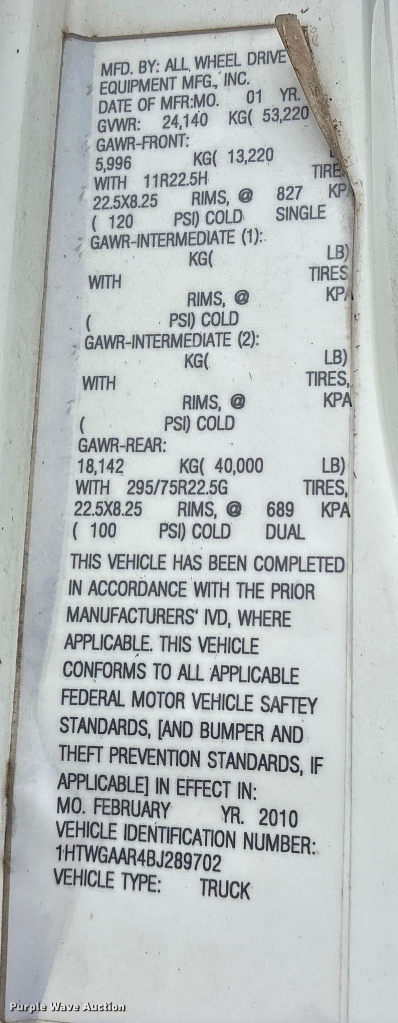 - VIN: 1HTWGAAR4BJ289702