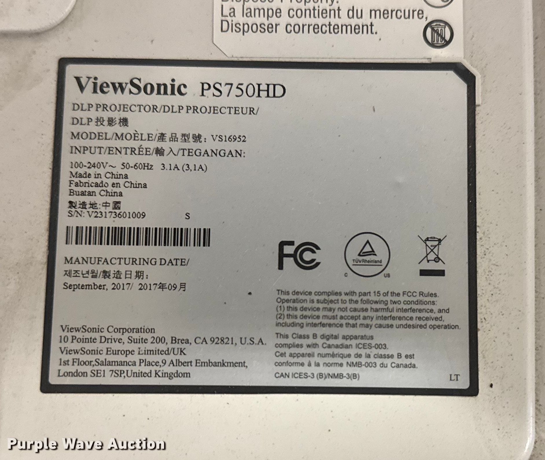 Purple Wave is selling a used Electronics in Oklahoma. This item is a (2) ViewSonic PS750HD projectors with remotes with the following: Unit #: 2018