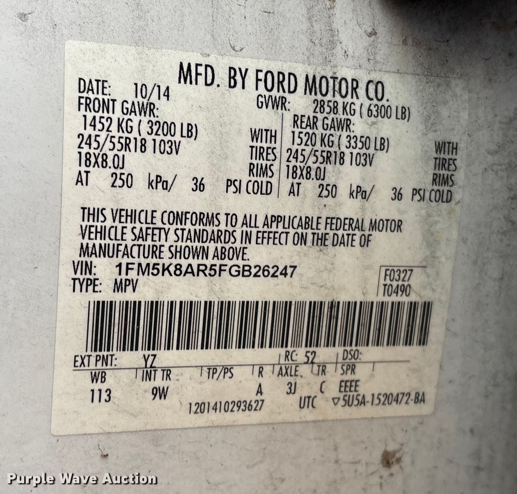 2015 Ford Explorer Police Interceptor SUV. Miles: Unknown, VIN: 1FM5K8AR5FGB26247, Unit #: 108. Engine Displacement: 3.7L, Cylinders: 6, Fuel type: Gas. Transmission Automatic, Four wheel drive. Interior AC, Heat, Seat: Power driver, Power windows, Power locks, Cruise control. Tires Size: 245/55R18. Notes Flat tires, Center console missing, Collision damage, Unknown operating condition. Oklahoma title. Seller is a government entity who will be assigning and distributing the title. Please contact the seller for distribution questions. Title distribution may be delayed up to 30 days from verification of funds. City of Tulsa. 108 N Trenton Ave. Tulsa, OK 74120