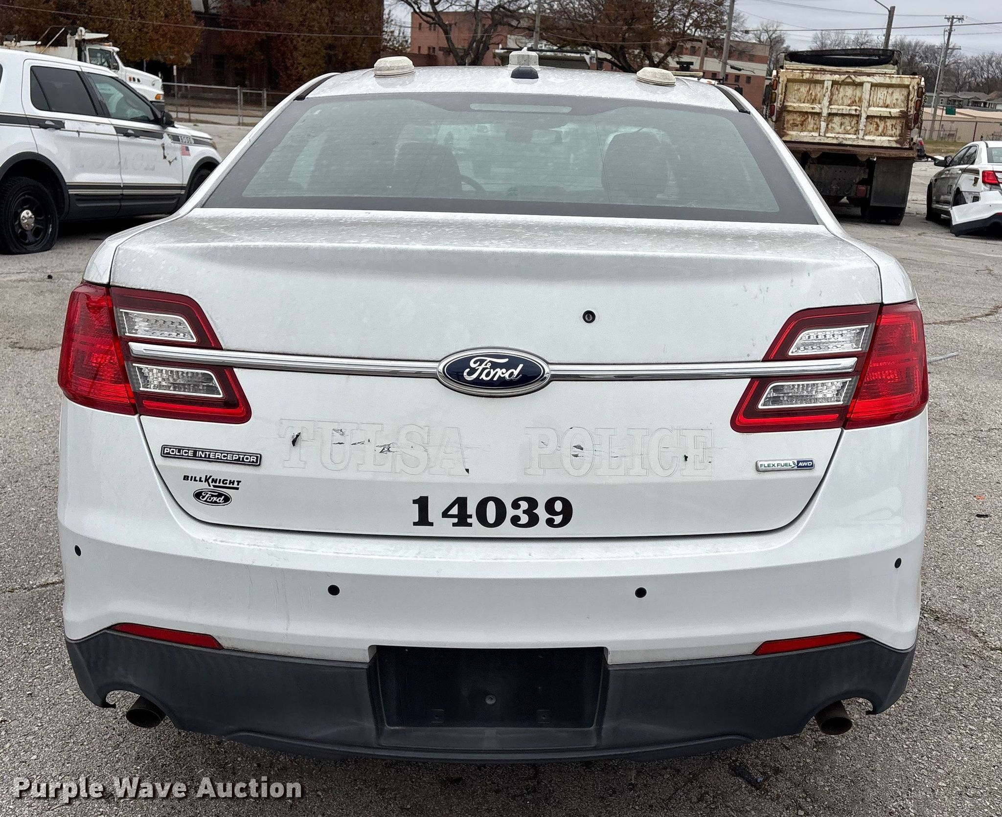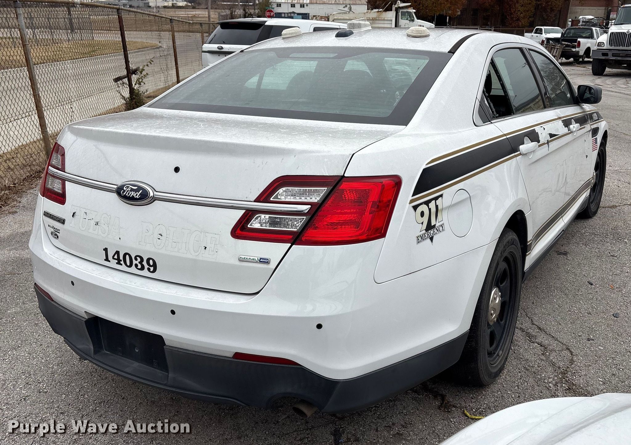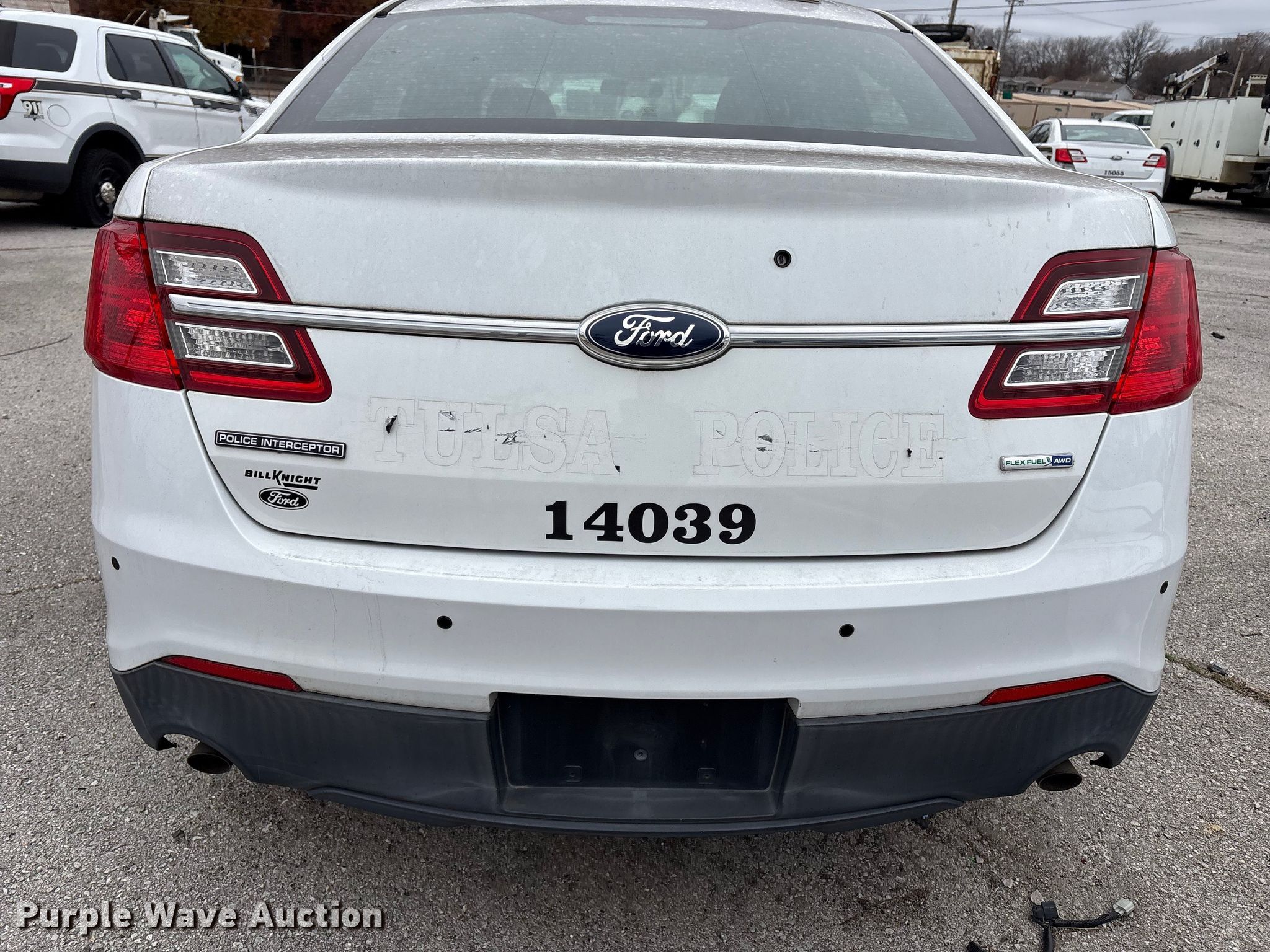 2014 Ford Taurus Police Interceptor. Miles: 117,856 on odometer, VIN: 1FAHP2MK8EG131767, Unit #: 110. Engine Displacement: 3.7L, Cylinders: 6, Fuel type: Gas. Transmission Automatic, All wheel drive. Interior AC, Heat, Seat: Power driver, Power windows, Power locks, Cruise control. Tires Size: 245/55R18. Notes Dash warning indicator: Traction control, Airbag, Dead battery, Flat tire, Rear glass broken, Center console missing, Front suspension issues. Oklahoma title. Seller is a government entity who will be assigning and distributing the title. Please contact the seller for distribution questions. Title distribution may be delayed up to 30 days from verification of funds. City of Tulsa. 108 N Trenton Ave. Tulsa, OK 74120