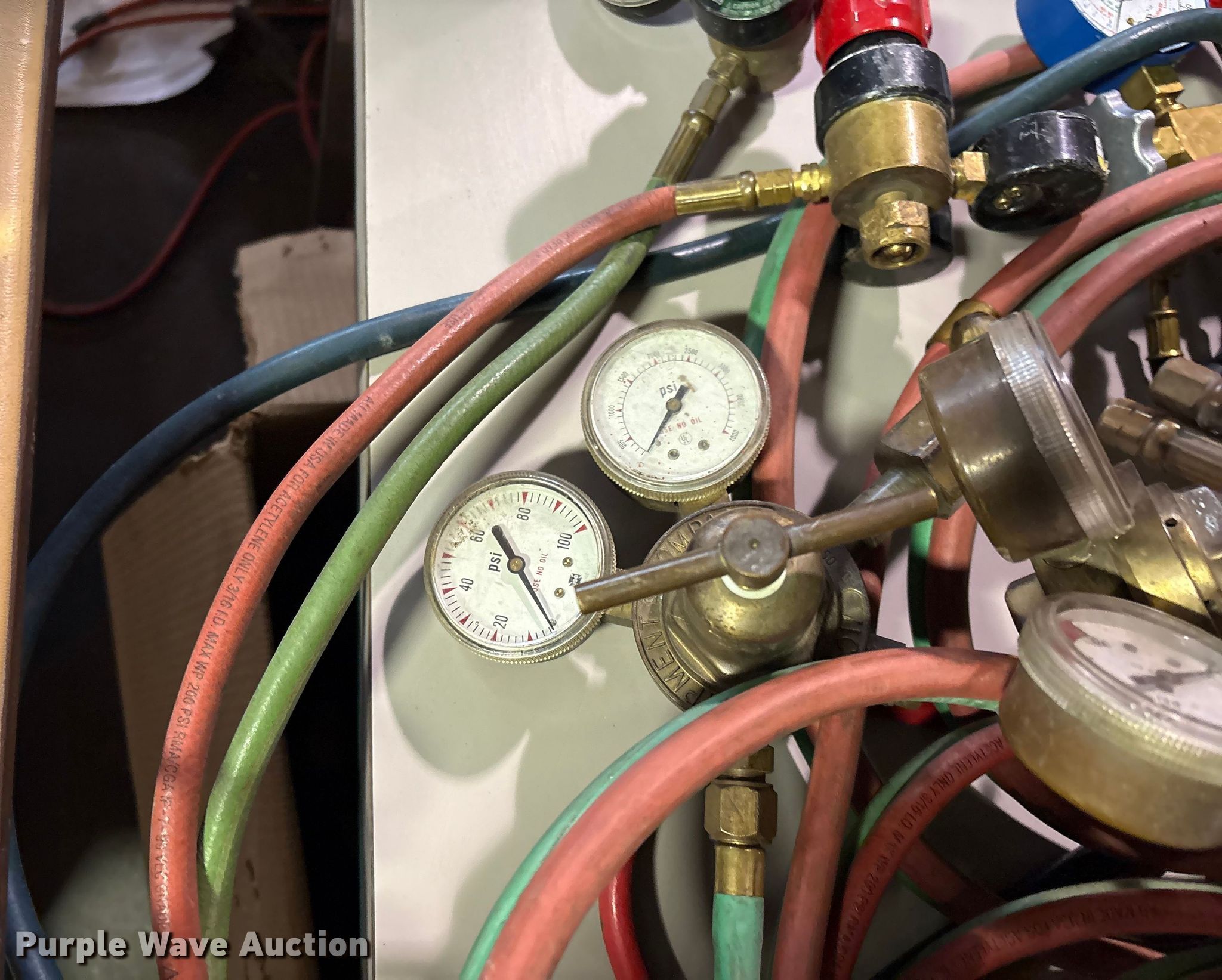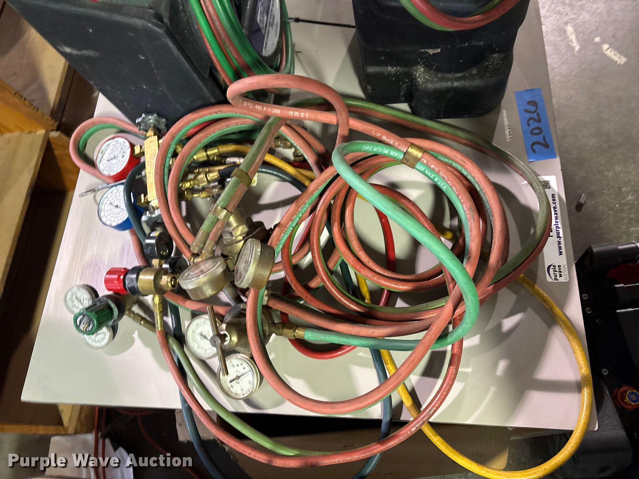 Purple Wave is selling a used Tools in Oklahoma. This item is a (2) acetylene tanks with stands with the following: Regulators, Unit #: 2026