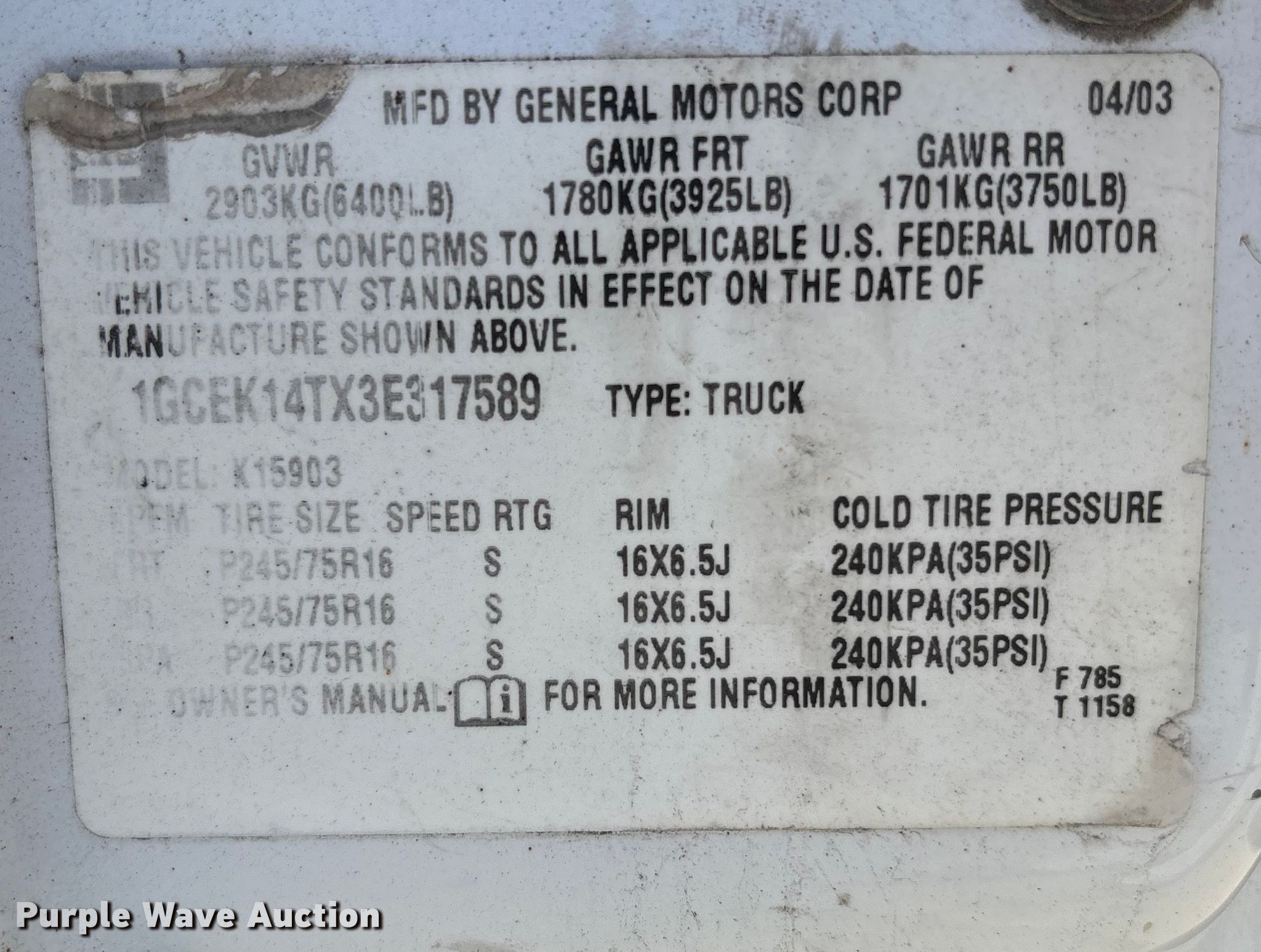 Purple Wave is selling a used 1/2 Ton Pickup or Van in Kansas. This item is a 2003 Chevrolet Silverado 1500 pickup truck with the following: Miles: 142,060 on odometer, VIN: 1GCEK14TX3E317589