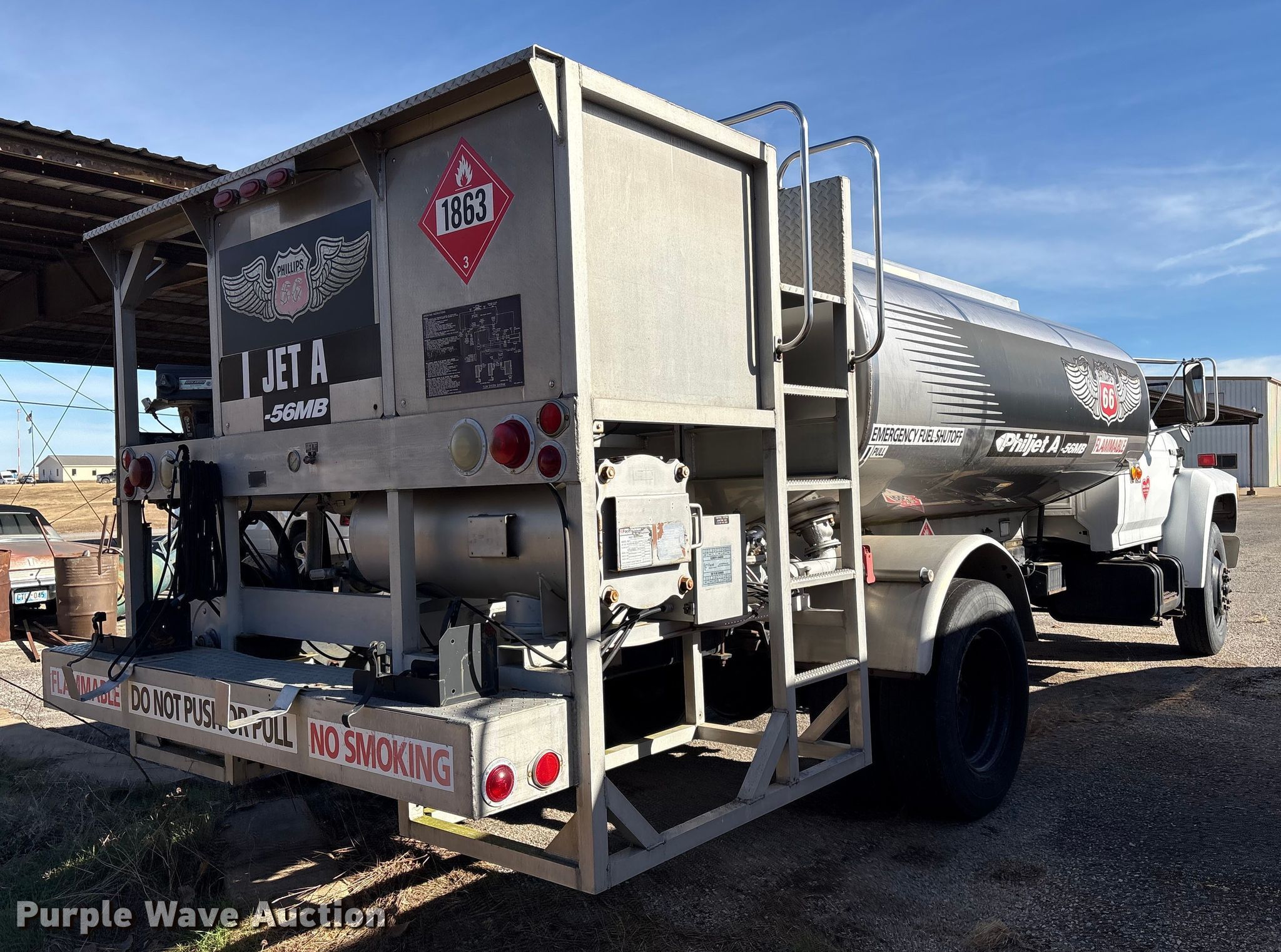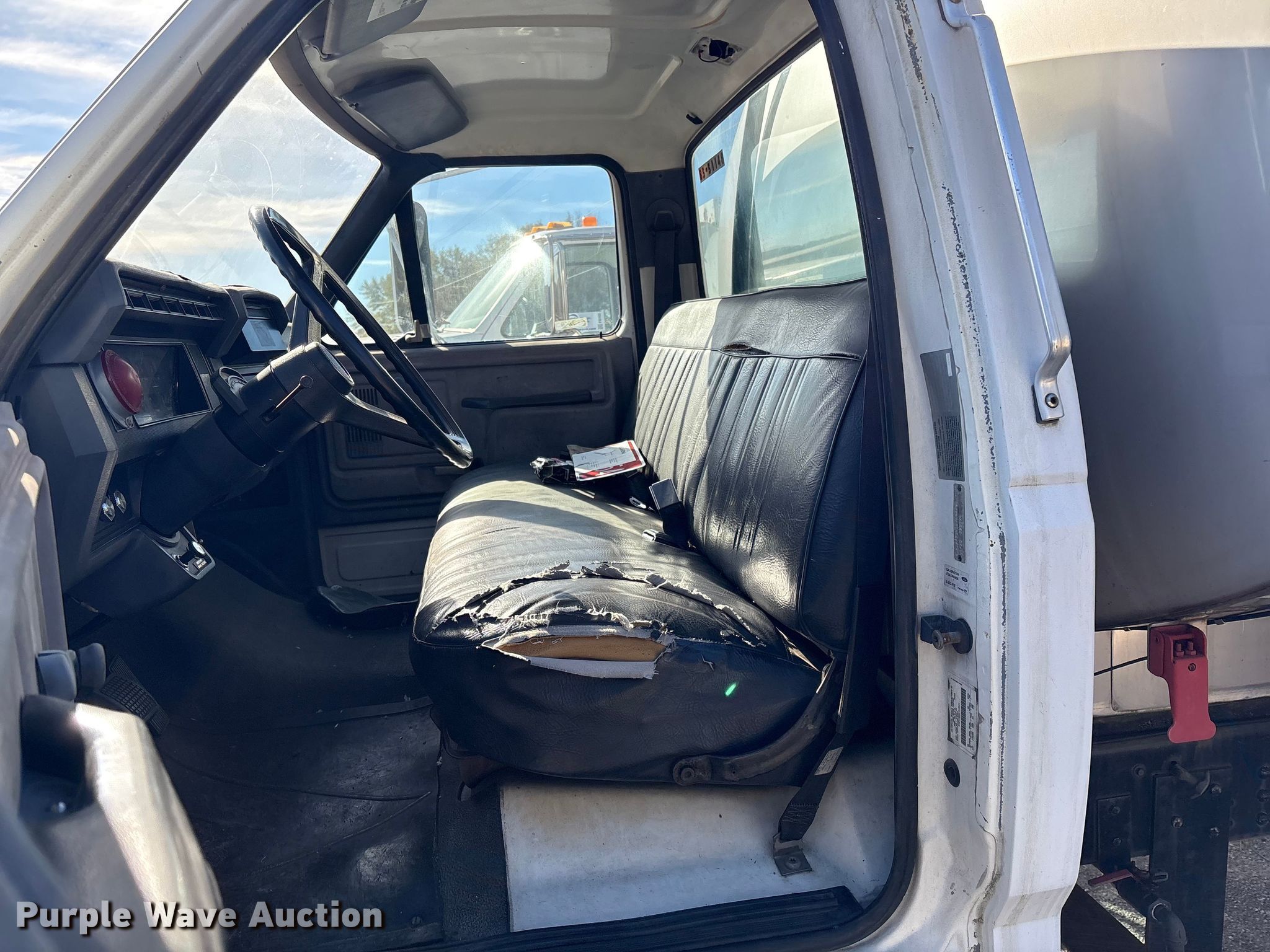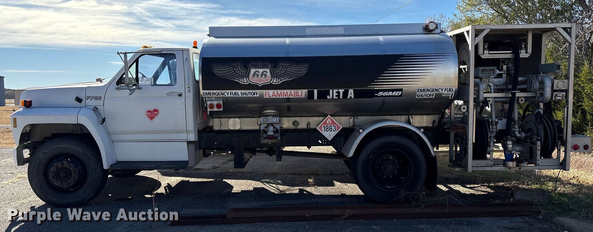 1990 Ford F700 fuel truck. Miles: 17,415 on odometer, VIN: 1FDPF70H0LVA45521. Engine Displacement: 6.1L, Cylinders: 8, Fuel type: Gas. Transmission Automatic. Chassis Axles: Single, Suspension: Spring, Brakes: Hydraulic, PTO, Wheelbase: 178". Interior AC, Heat. Features Bed Tank bed, Brownie Tank MFG, Length: 18', Width: 96", Capacity: 200 gallons, Hose reel. Tires Size: 295/75R22.5. Oklahoma classic title. Title distribution may be delayed up to 30 days from verification of funds. City of McAlester, OK. McAlester, OK 74501