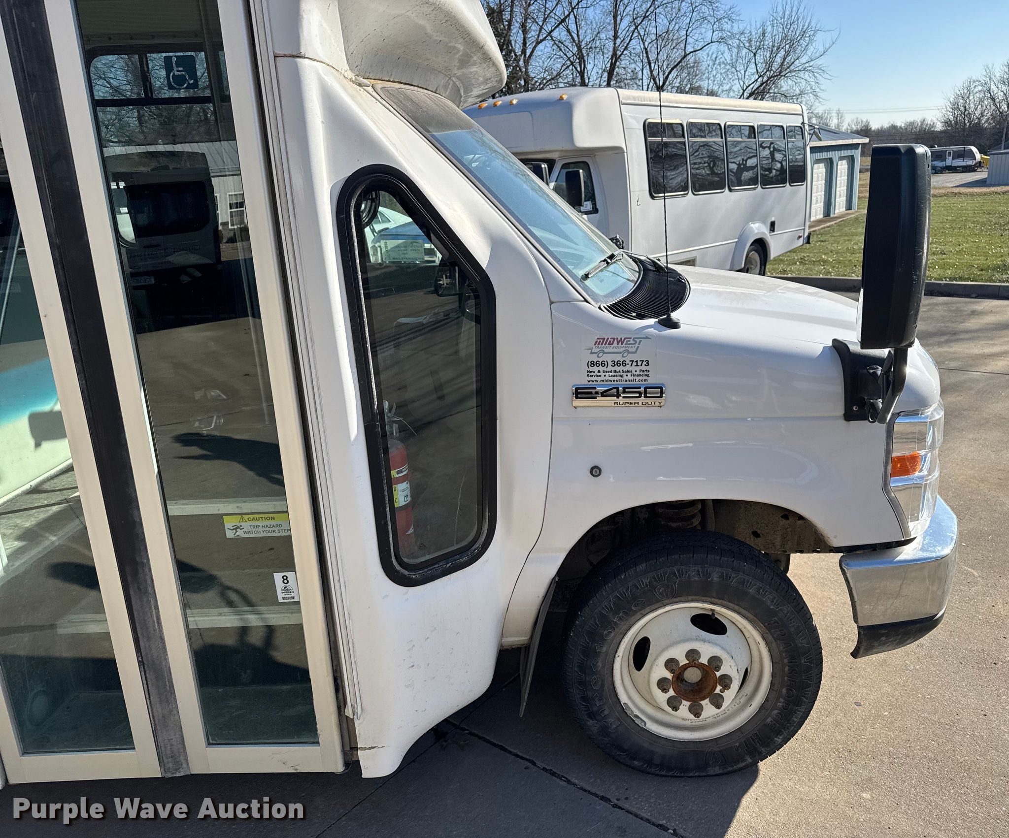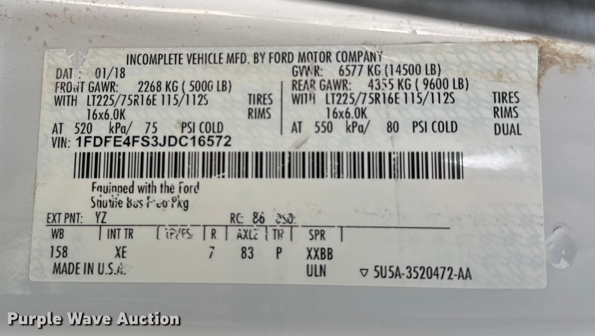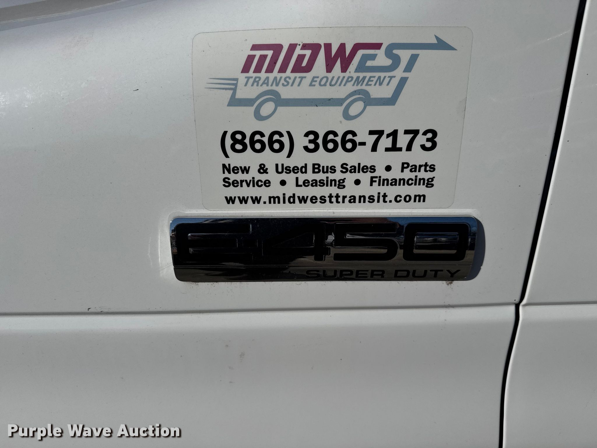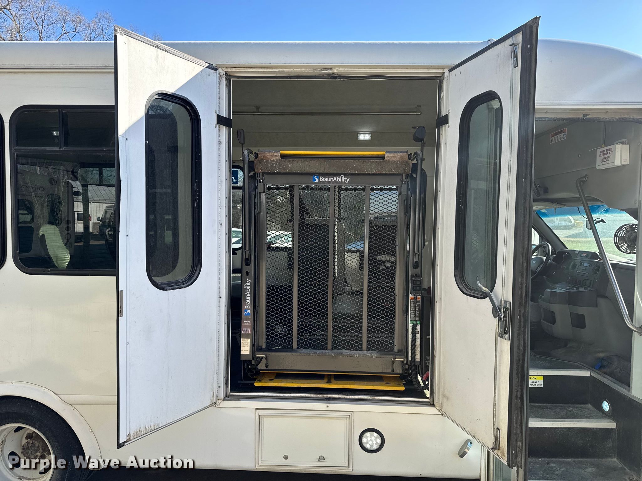 2018 Ford E450 Super Duty shuttle bus. Miles: 146,969 on odometer, VIN: 1FDFE4FS3JDC16572. Engine Displacement: 6.8L, Cylinders: 10, Fuel type: Gas. Transmission Automatic. Chassis Axles: Single, Suspension: Spring, Brakes: Hydraulic, GVWR: 14,500 lbs, Wheelbase: 159". Interior AC, Heat, Cruise control, Wheelchair lift. Tires Size: 225/75R16. Notes Windshield chipped or cracked. Missouri title. Title distribution may be delayed up to 14 days from verification of funds. Ray County Transportation, Inc.. Richmond, MO 64085