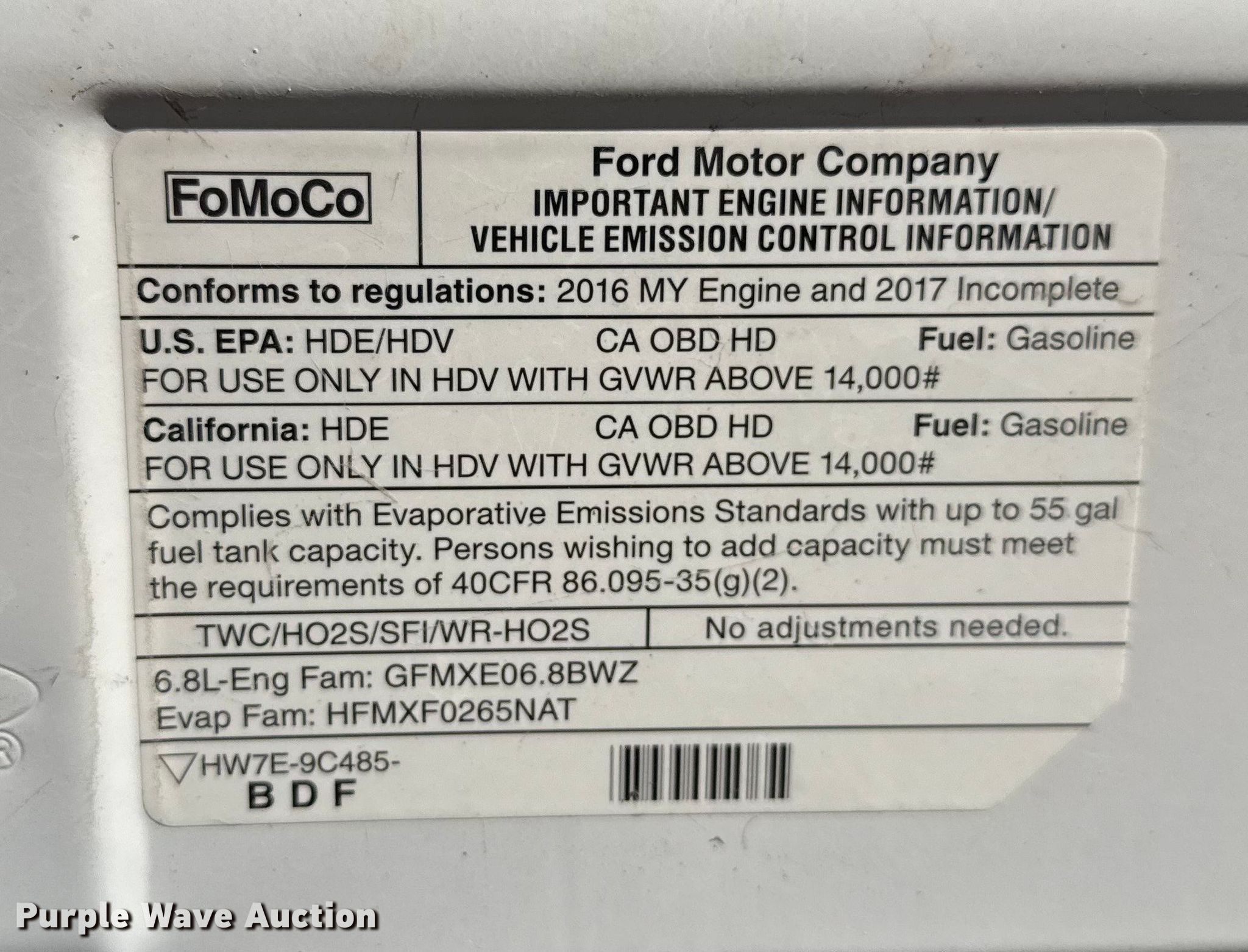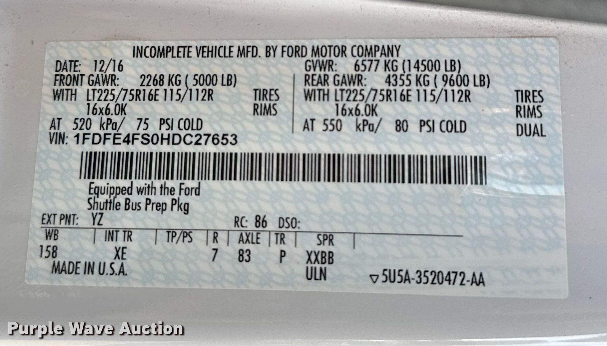 2017 Ford E450 Super Duty shuttle bus. Miles: 91,568 on odometer, VIN: 1FDFE4FS0HDC27653. Engine Displacement: 6.8L, Cylinders: 10, Fuel type: Gas. Transmission Automatic. Chassis Axles: Single, Suspension: Spring, Brakes: Hydraulic, GVWR: 14,500 lbs, Wheelbase: 159". Interior AC, Heat, Cruise control, Passengers: 24. Tires Size: 225/75R16. Missouri title. Title distribution may be delayed up to 14 days from verification of funds. Ray County Transportation, Inc.. Richmond, MO 64085