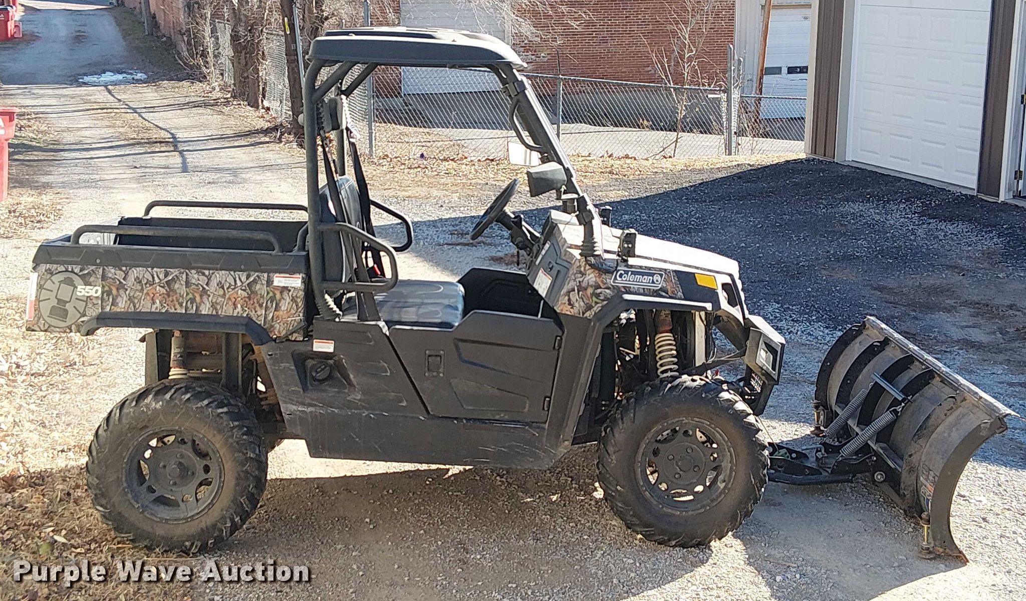 2019 Coleman Outfitter 550 utility vehicle. Miles: 2,408 on odometer, Hours: 277 on meter, VIN: LWGMDZZ09KA001805. Engine Displacement: 546 cc, Cylinders: 1, Fuel type: Gas, Electric start. Transmission Automatic. Chassis Four wheel drive/ All wheel drive. Operators station OROPS, Canopy. Features Winch, Grille guard, Receiver hitch, Dump bed 35" L x 45" W, Dump bed type: Manual, KFI Pro Poly snow plow Width: 72". Tires Front: 26x9.00-14, Rear: 26x11.00-14. Notes Unused snow plow poly included, Hitch included, Engine issues, smokes. Transfer of ownership documentation will be a bill of sale. Lafayette County, MO. Lexington, MO 64067