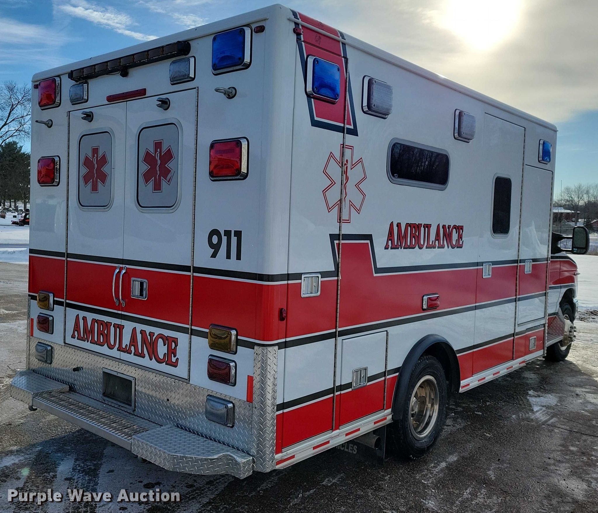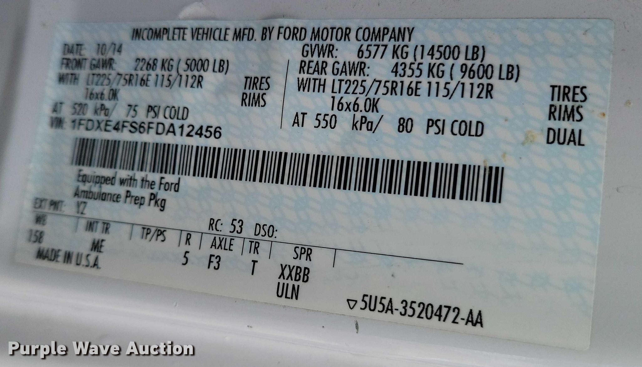 2015 Ford E450 ambulance. Miles: 109,231 on odometer, VIN: 1FDXE4FS6FDA12456. Engine Displacement: 6.8L, Cylinders: 10, Fuel type: Gas. Transmission Automatic. Chassis Axles: Single, Suspension: Spring, Brakes: Hydraulic, GVWR: 14,500 lbs, Wheelbase: 158". Interior AC, Heat, Power windows, Power locks, Cruise control, Auxiliary controls. Features Ambulance body PA/ siren controls, Oxygen hookups. Tires Size: LT225/75R16. Iowa title. Seller is a government entity who will be assigning and distributing the title. Please contact the seller for distribution questions. Title distribution may be delayed up to 14 days from verification of funds. Lisbon-Mt. Vernon Ambulance Service. Mount Vernon, IA 52314