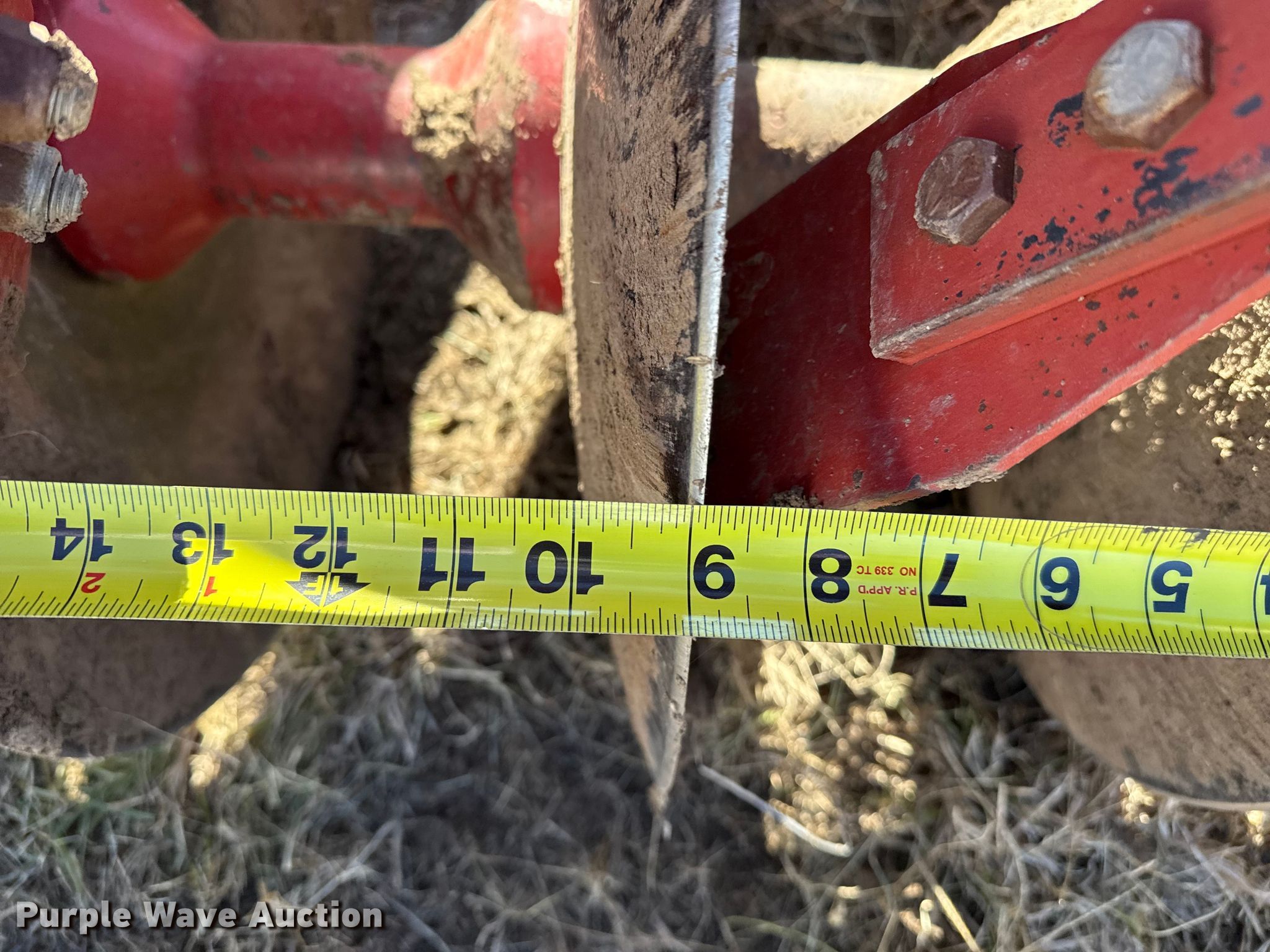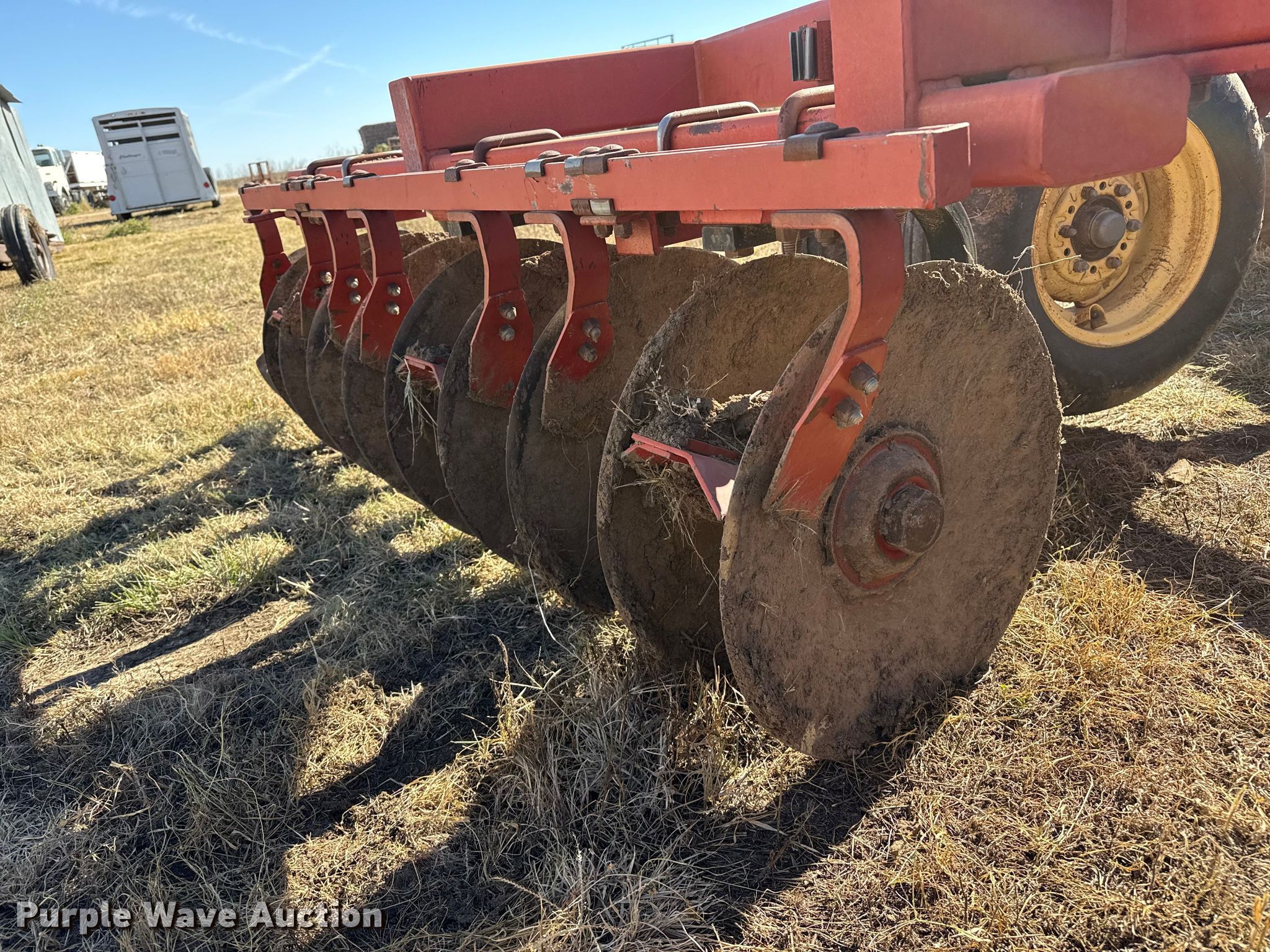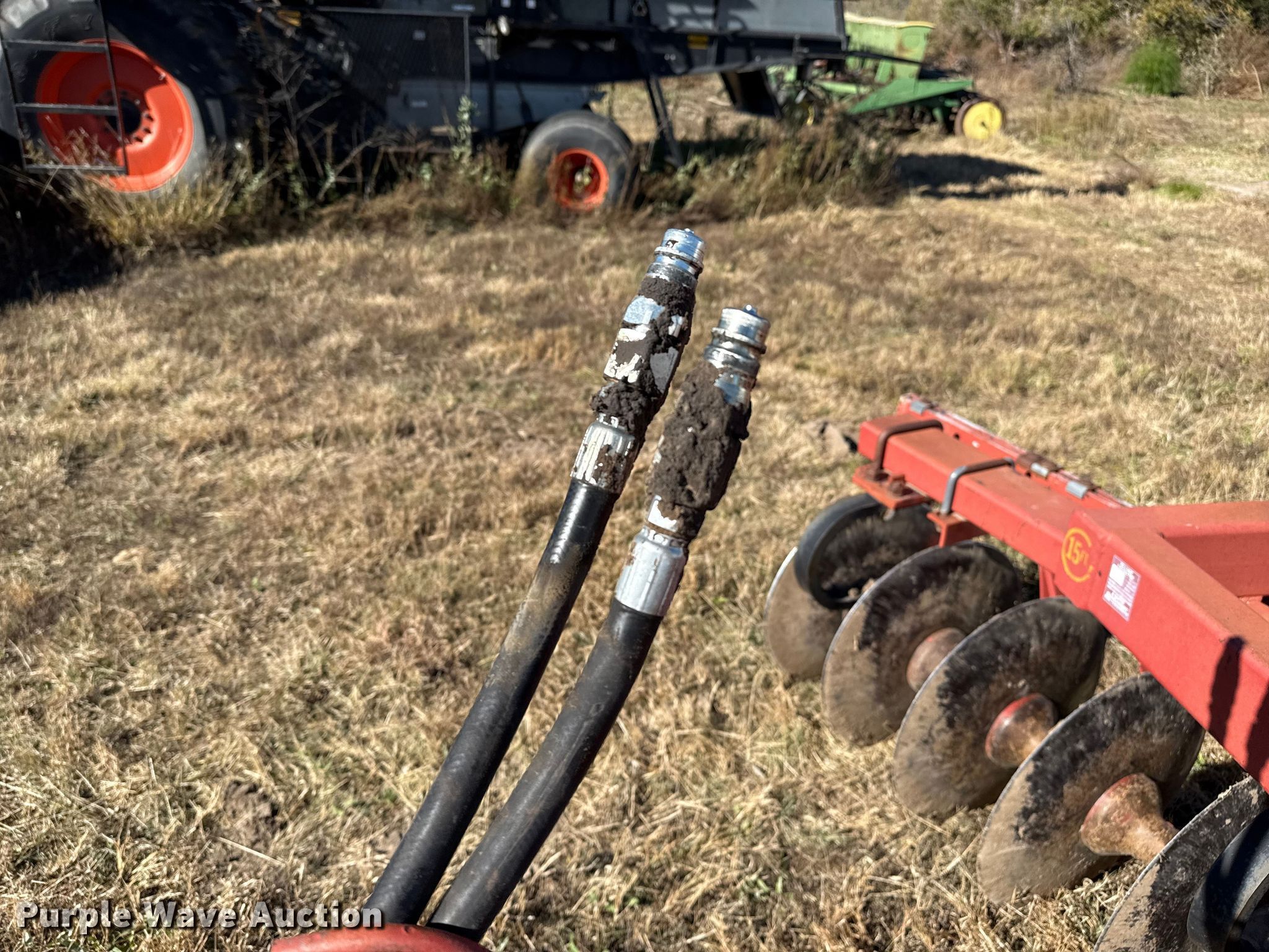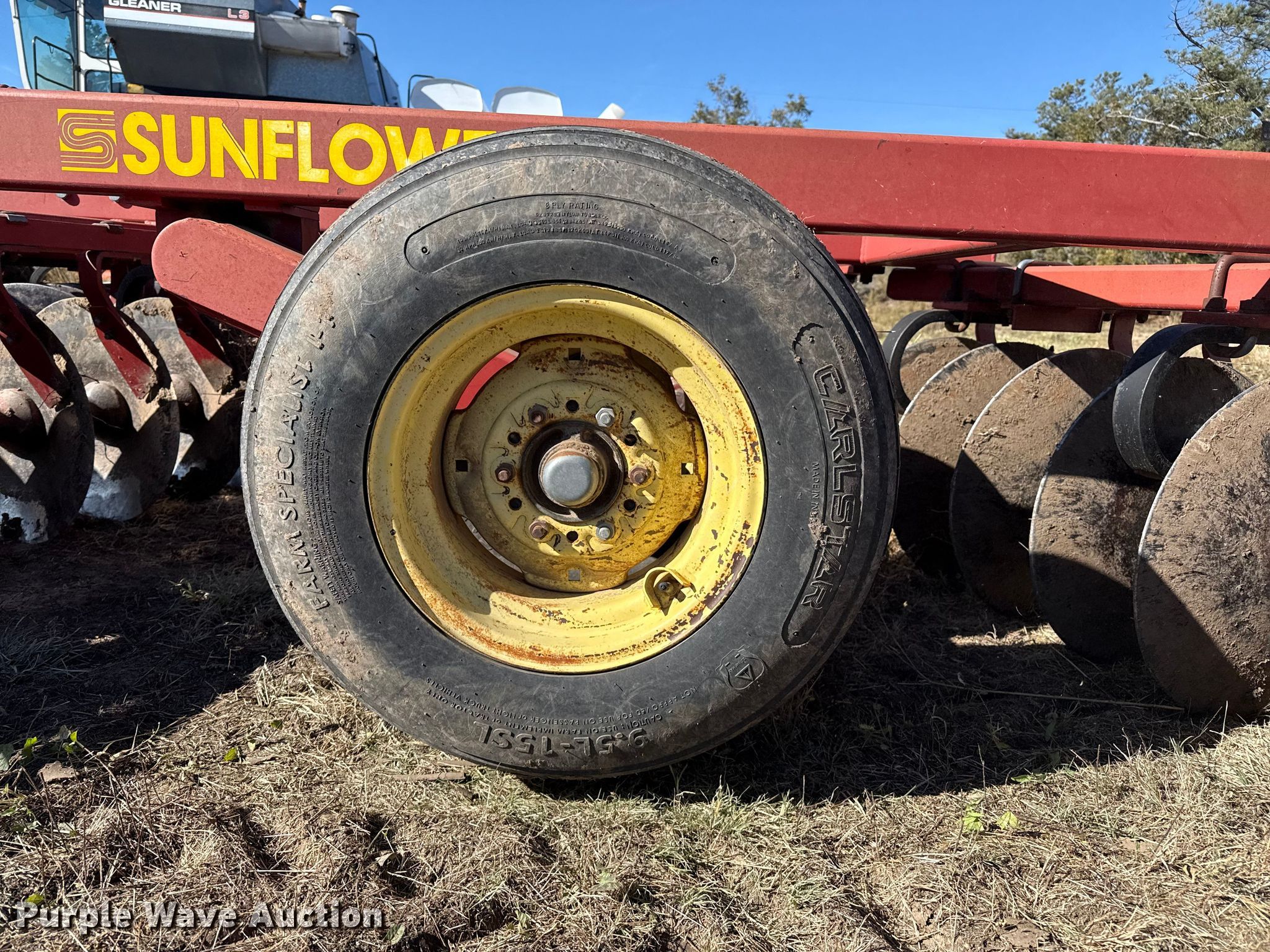 Sunflower 1211 double off-set disk. Overall width: 15', Serial: 1294-420. Features Front blades Diameter: 21", Spacing: 9", Rear blades Diameter: 22", Spacing: 9", Disk scrapers, Operation Hydraulic lift, Leveler: Manual. Tires Tire size: 9.5L-15SL. Jetmore, KS 67854