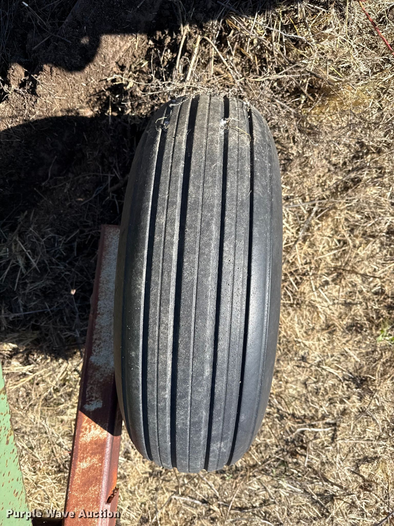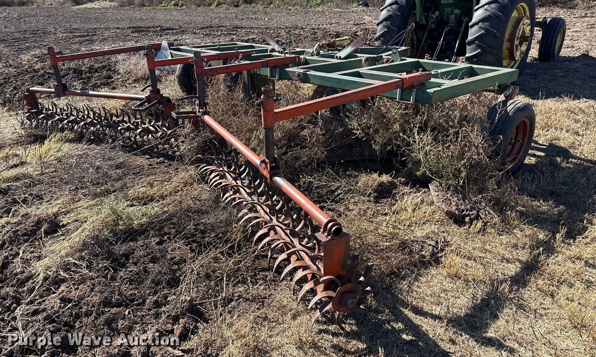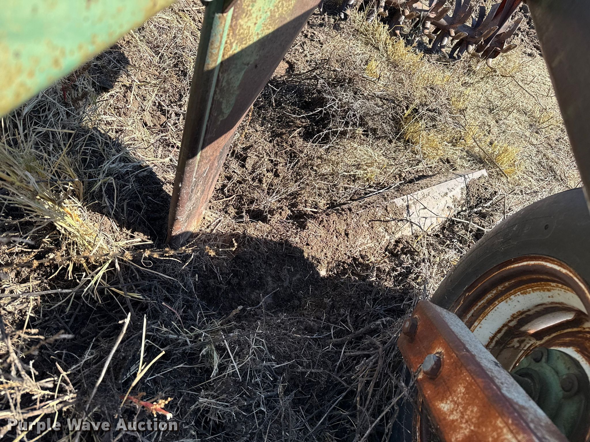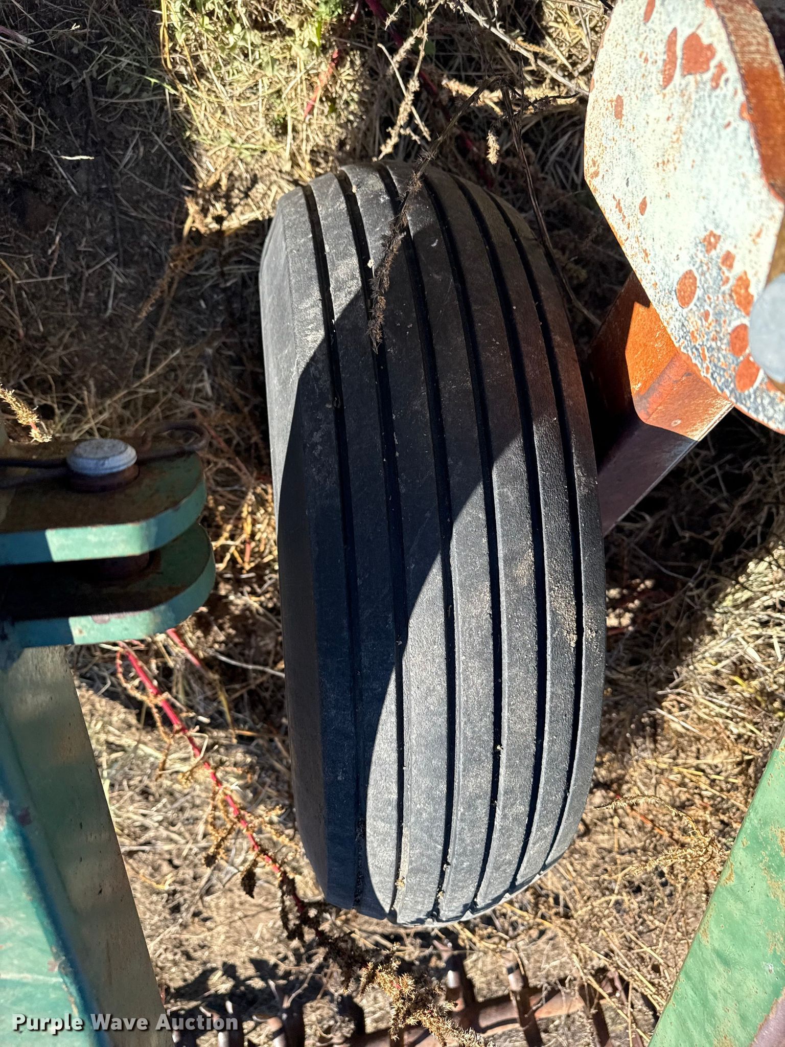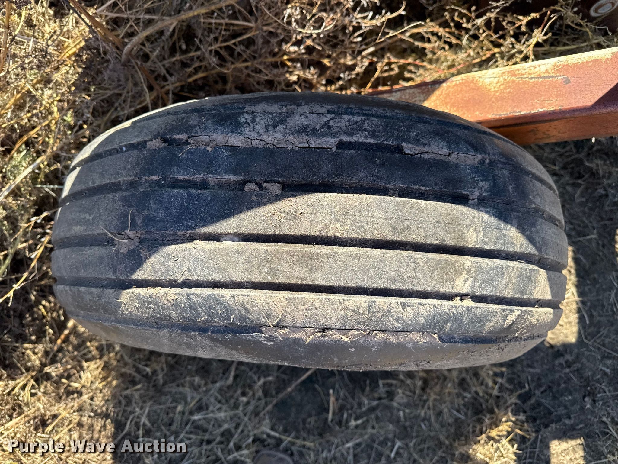 Flex King KM-17 sweep plow. Overall width: 18', Serial: 3549. Features Shanks: 3, Sweep width: 6', Operation Hydraulic lift, Attachments Rolling pickers/ treader. Tires Tire size: 9.5L-15. Notes Tractor not included. Jetmore, KS 67854