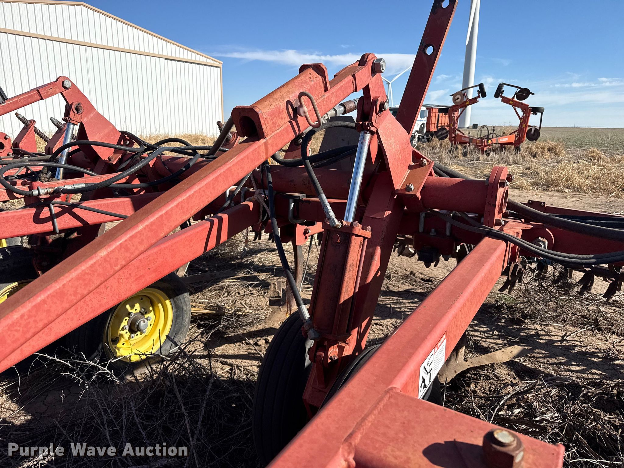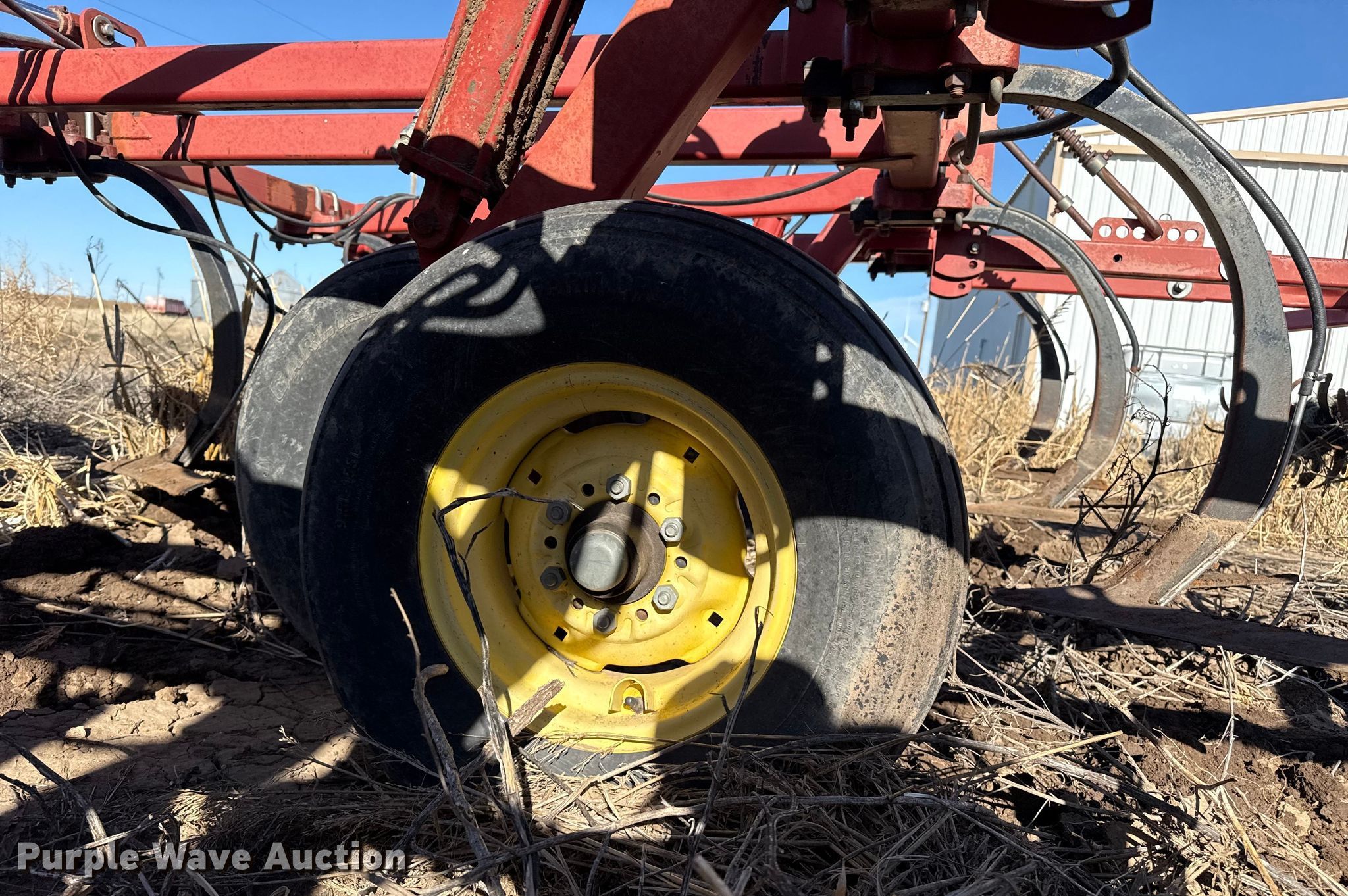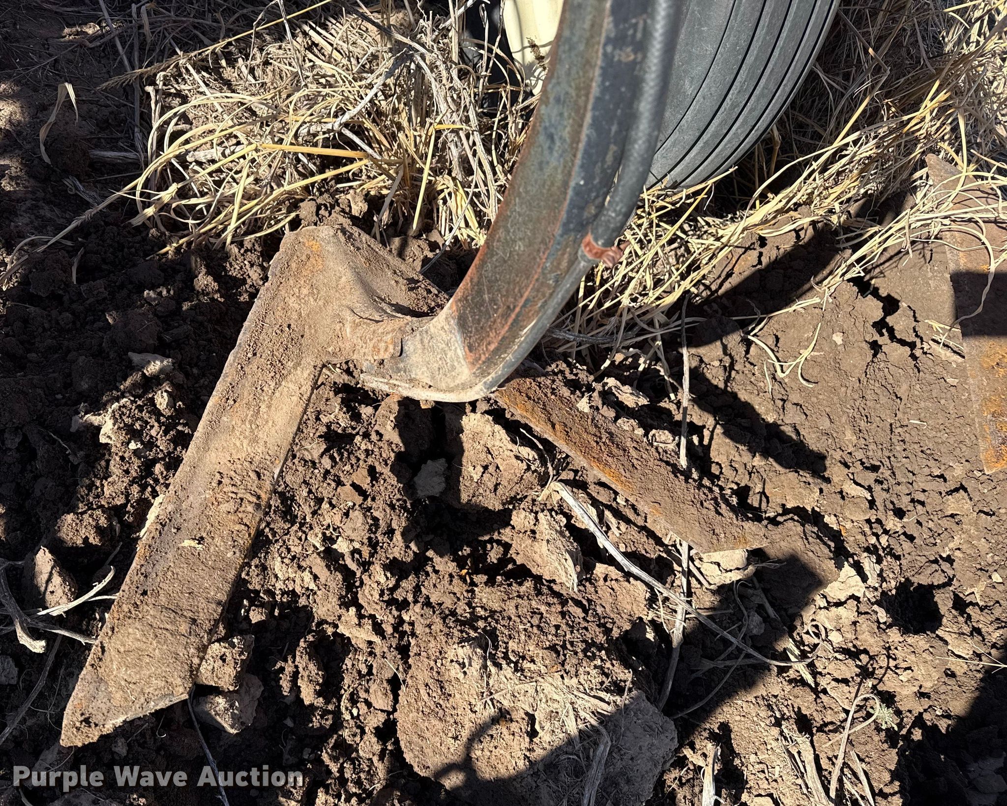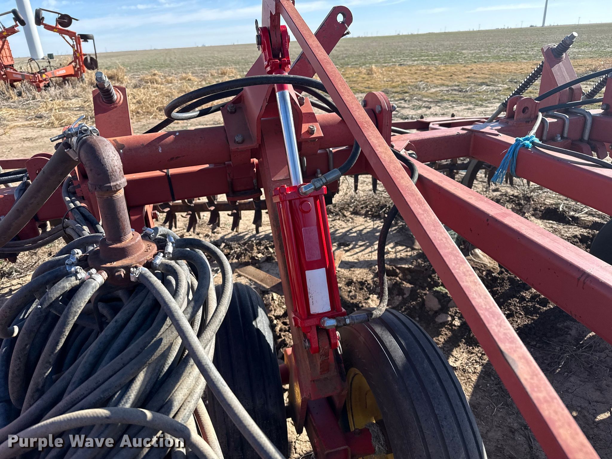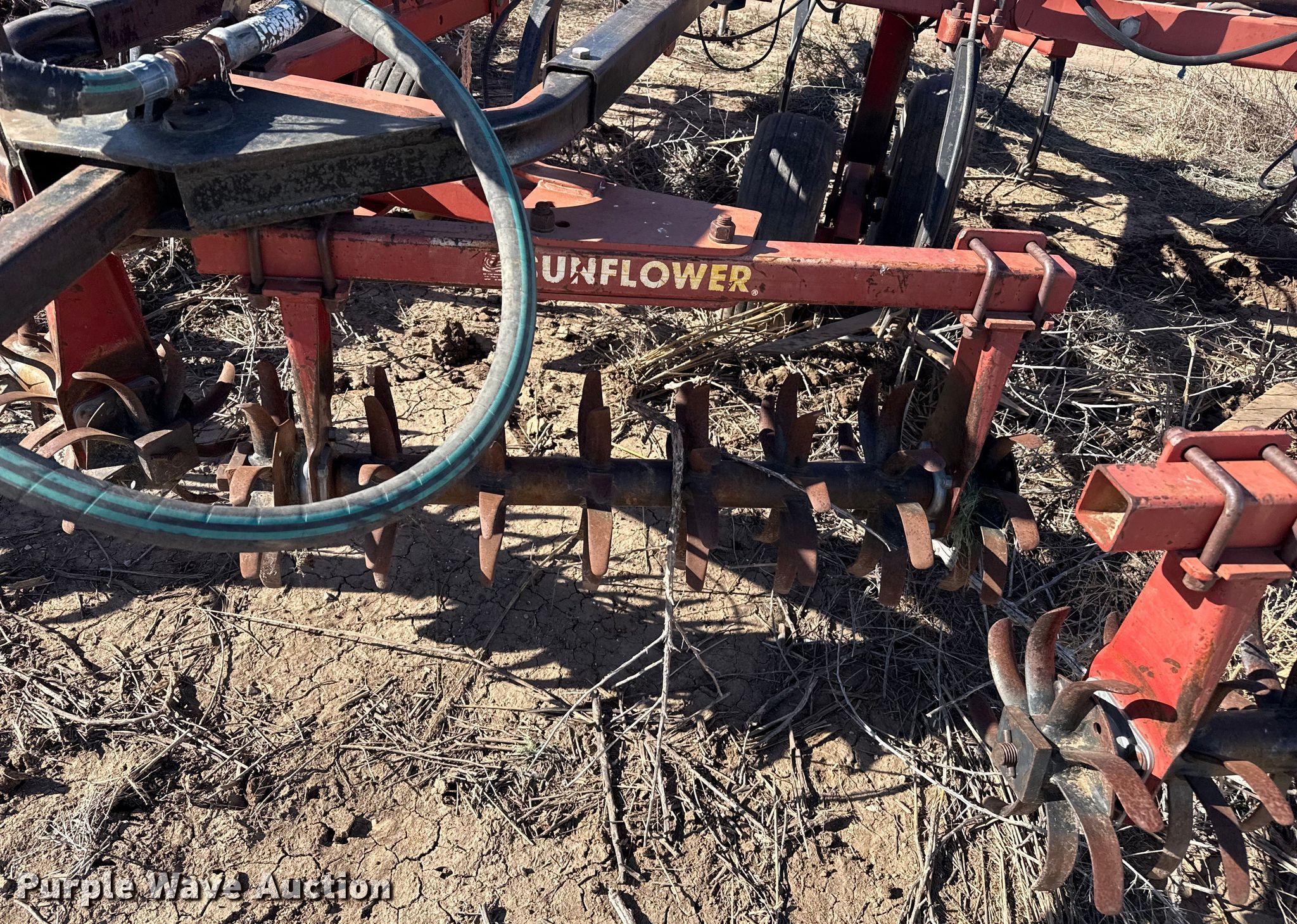 Sunflower 3050-35 field cultivator. Overall width: 35', Serial: 03050119990005. Features Shanks: 21, Sweep width: 24", Operation Hydraulic lift, Hydraulic fold, Leveler: Manual, Walking tandem axle, Attachments Rolling pickers/ treader, NH3 hookups, Rear hitch. Tires Tire size: 9.5L-15, Gauge wheels Size: 20.5x8.00-10. Anchor V ranch. Perryton, TX 79070
