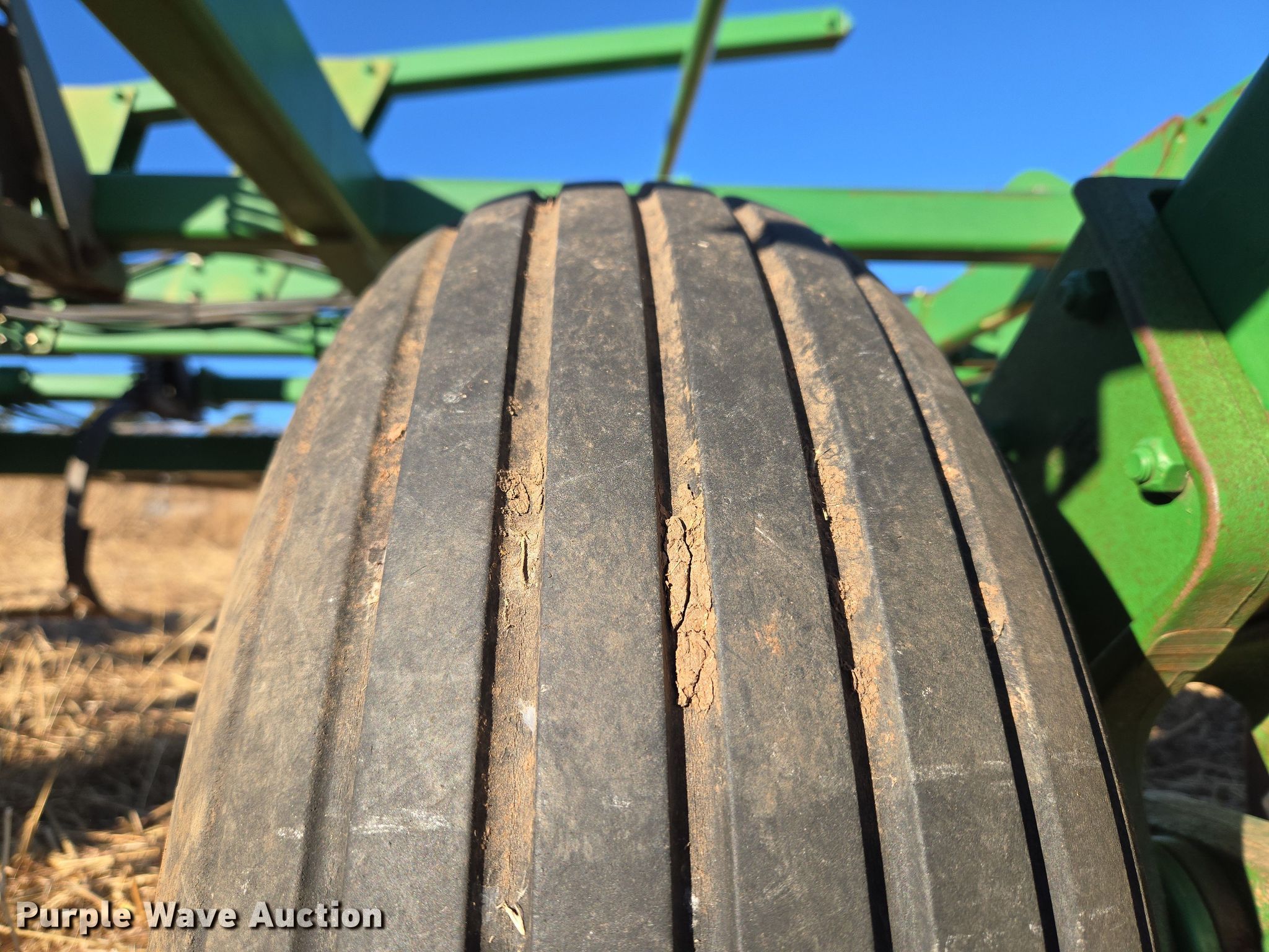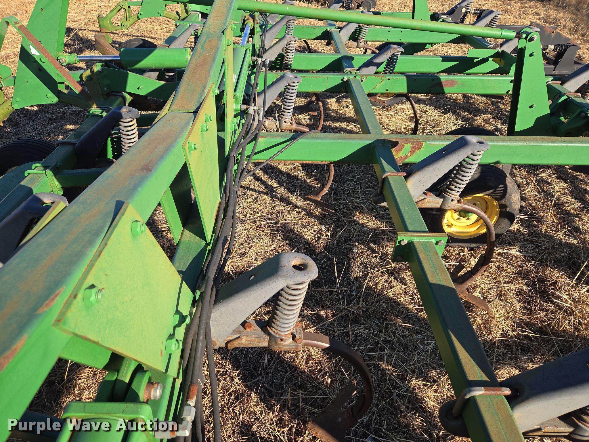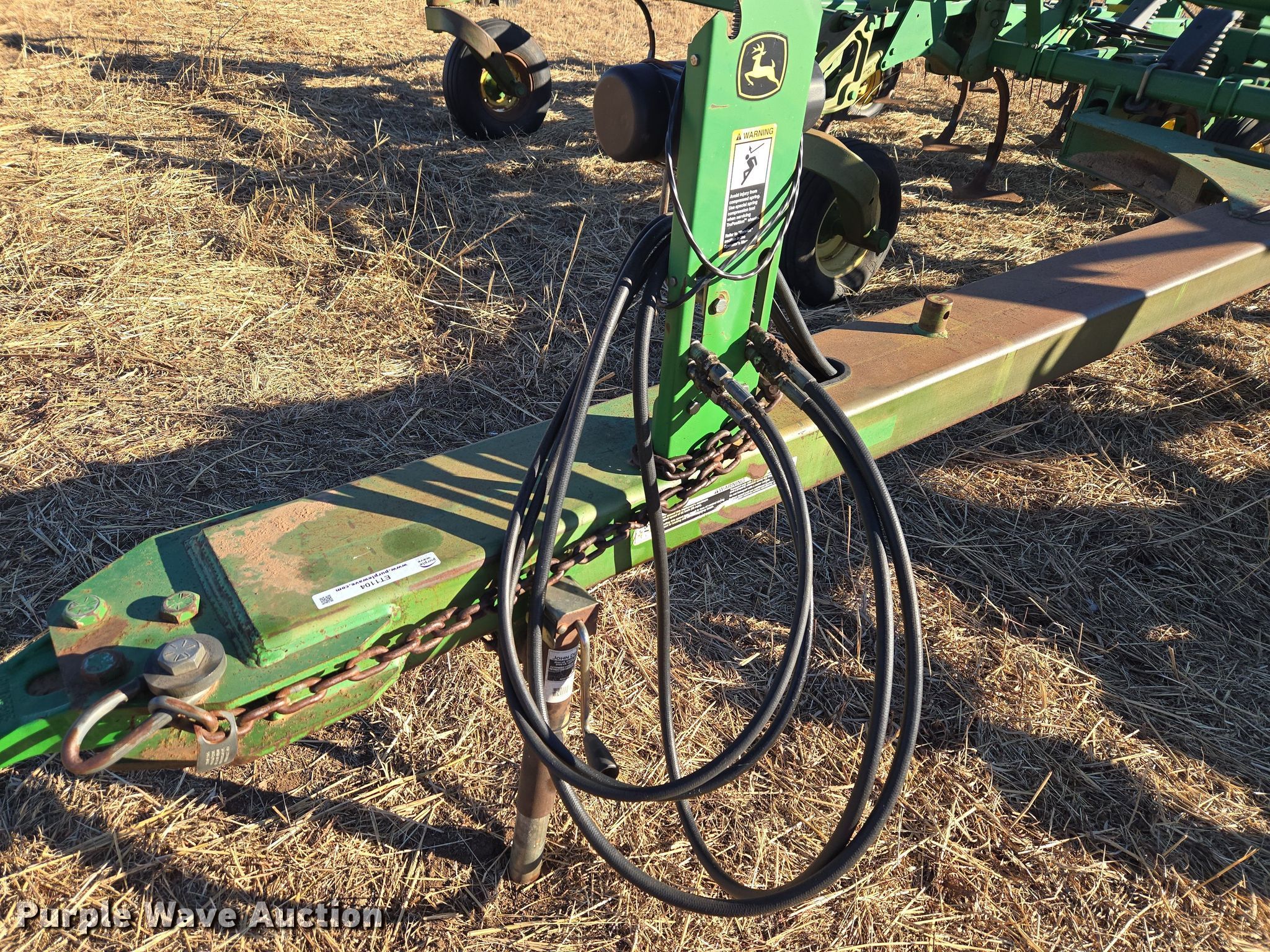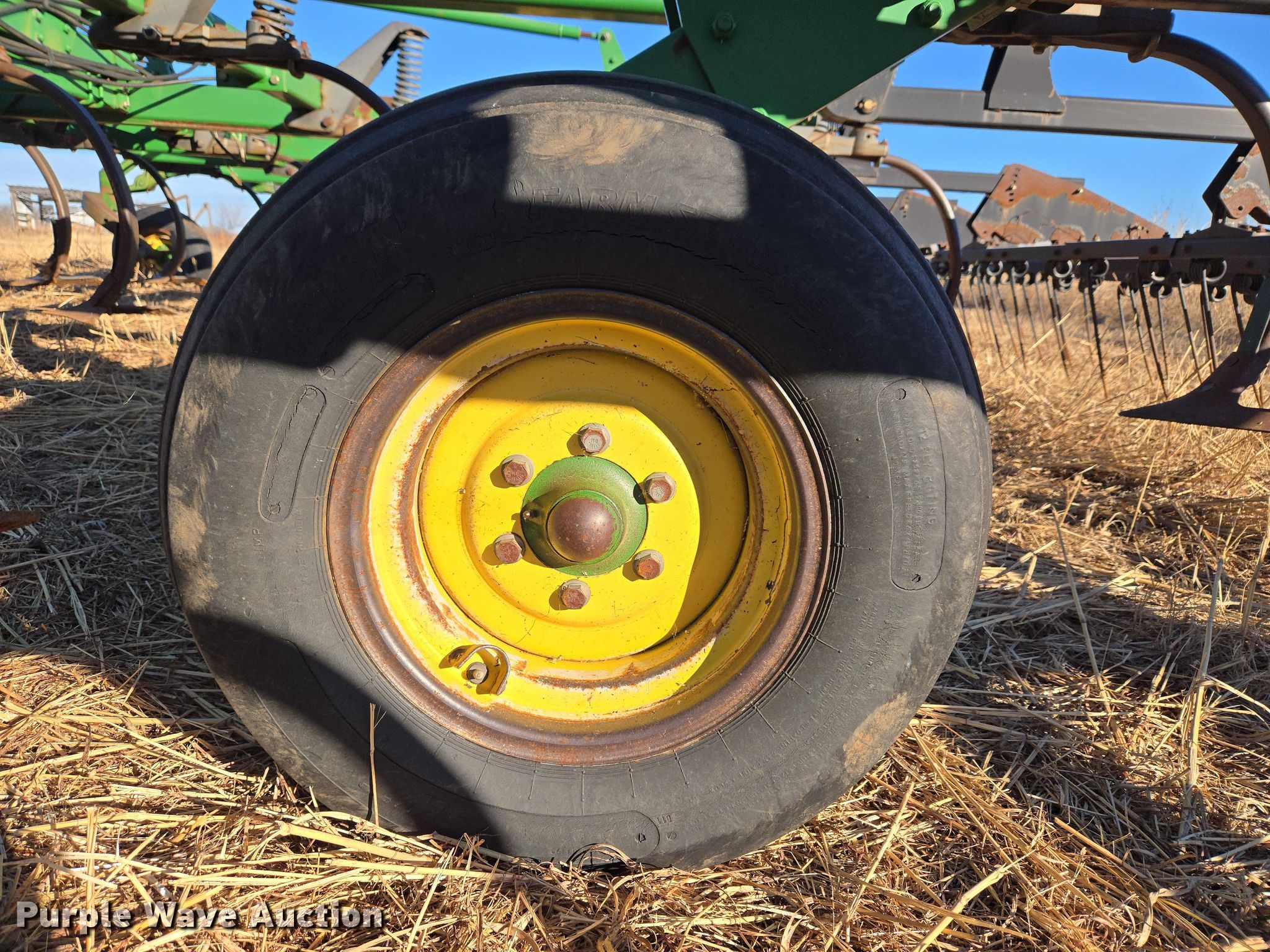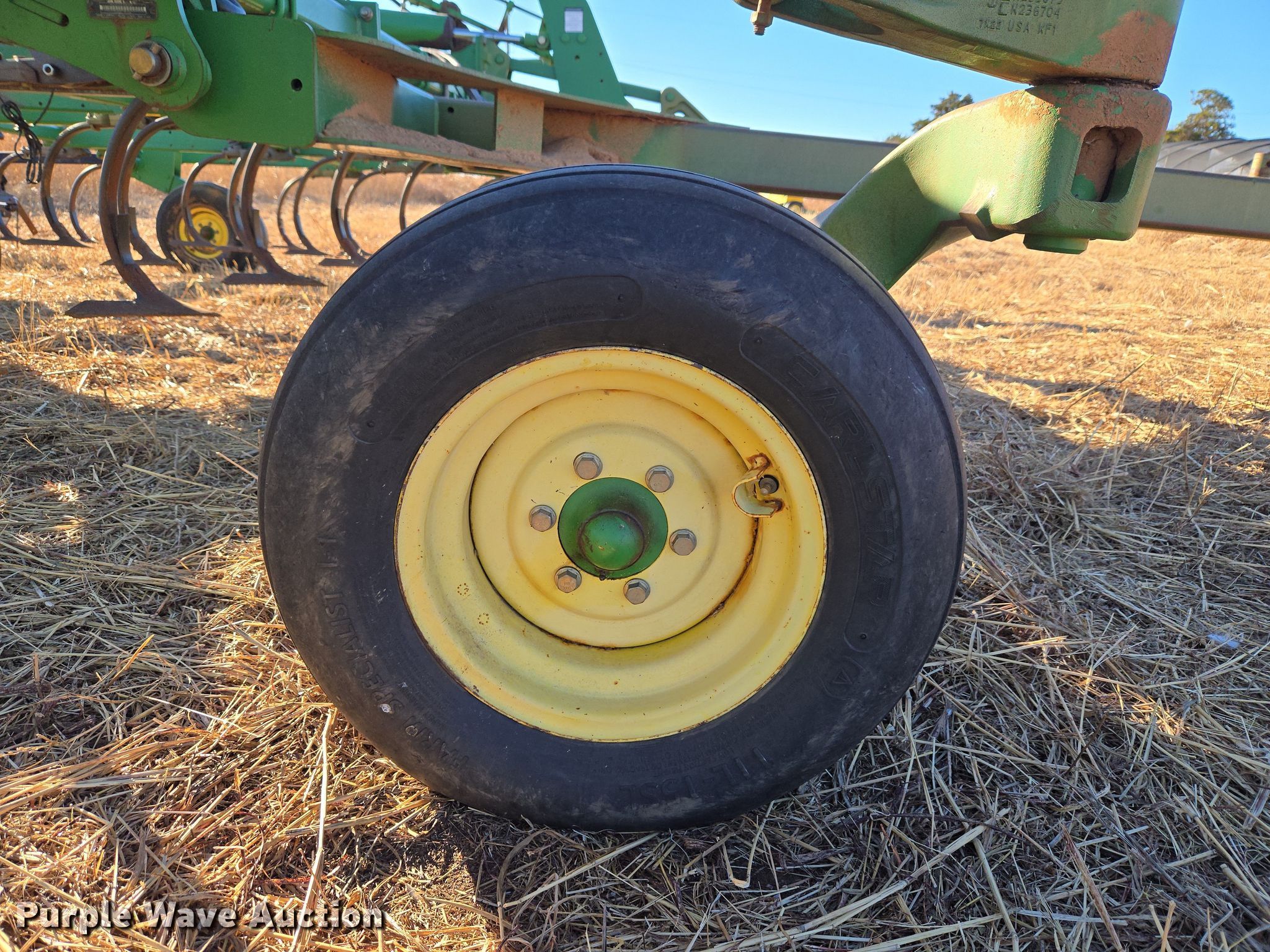 John Deere 2410 chisel. Overall width: 36' 7", Serial: N02410X008060. Features Shanks: 37, Sweep width: 16", Operation Hydraulic lift, Hydraulic fold, Walking tandem axle, Attachments Tine harrow Harrow bars: 3, Transport lights. Tires Tire size: 11L15, Gauge wheels Size: 11L15. Notes Non-operational transport lights. Hitchcock, OK 73744