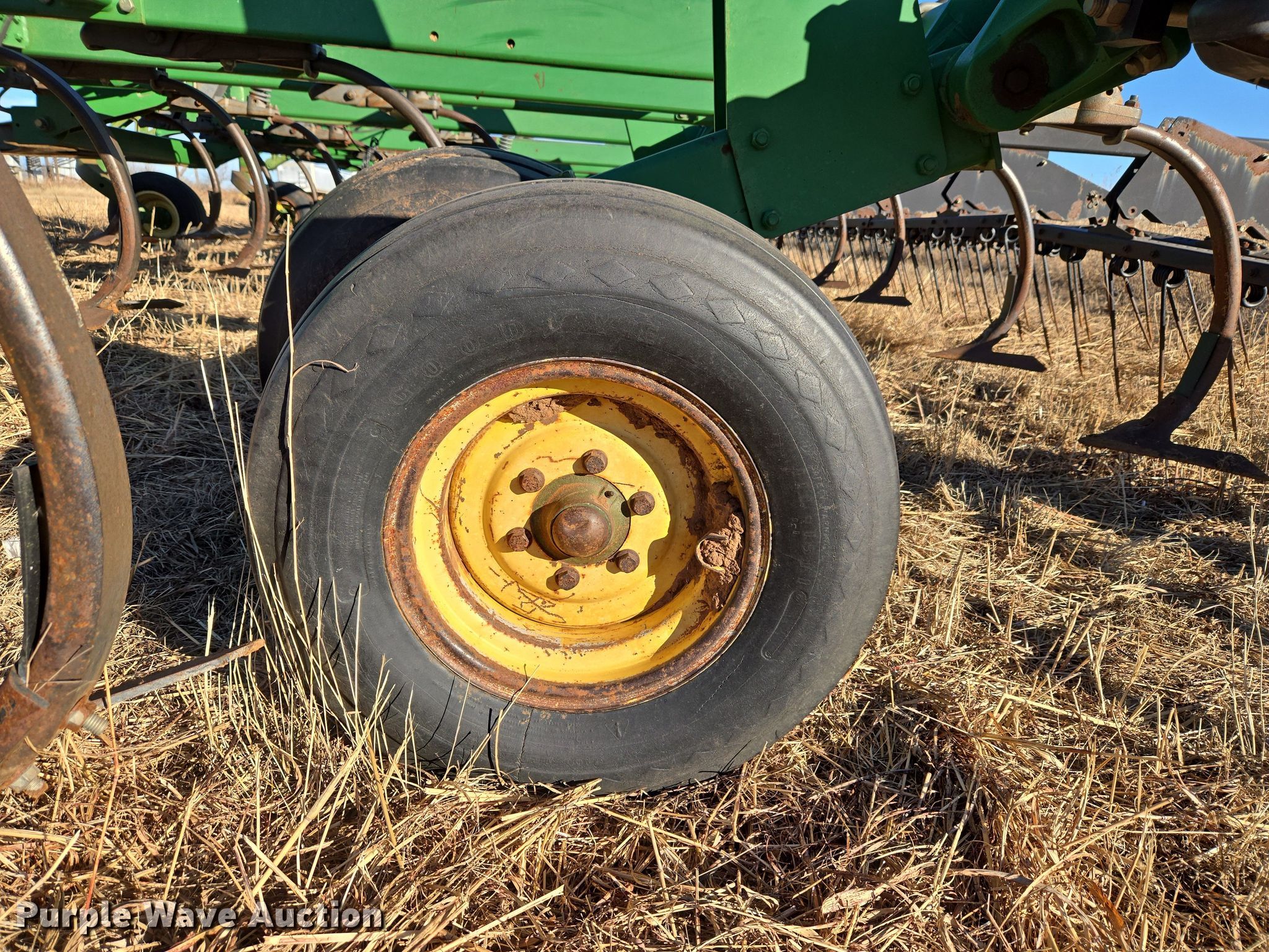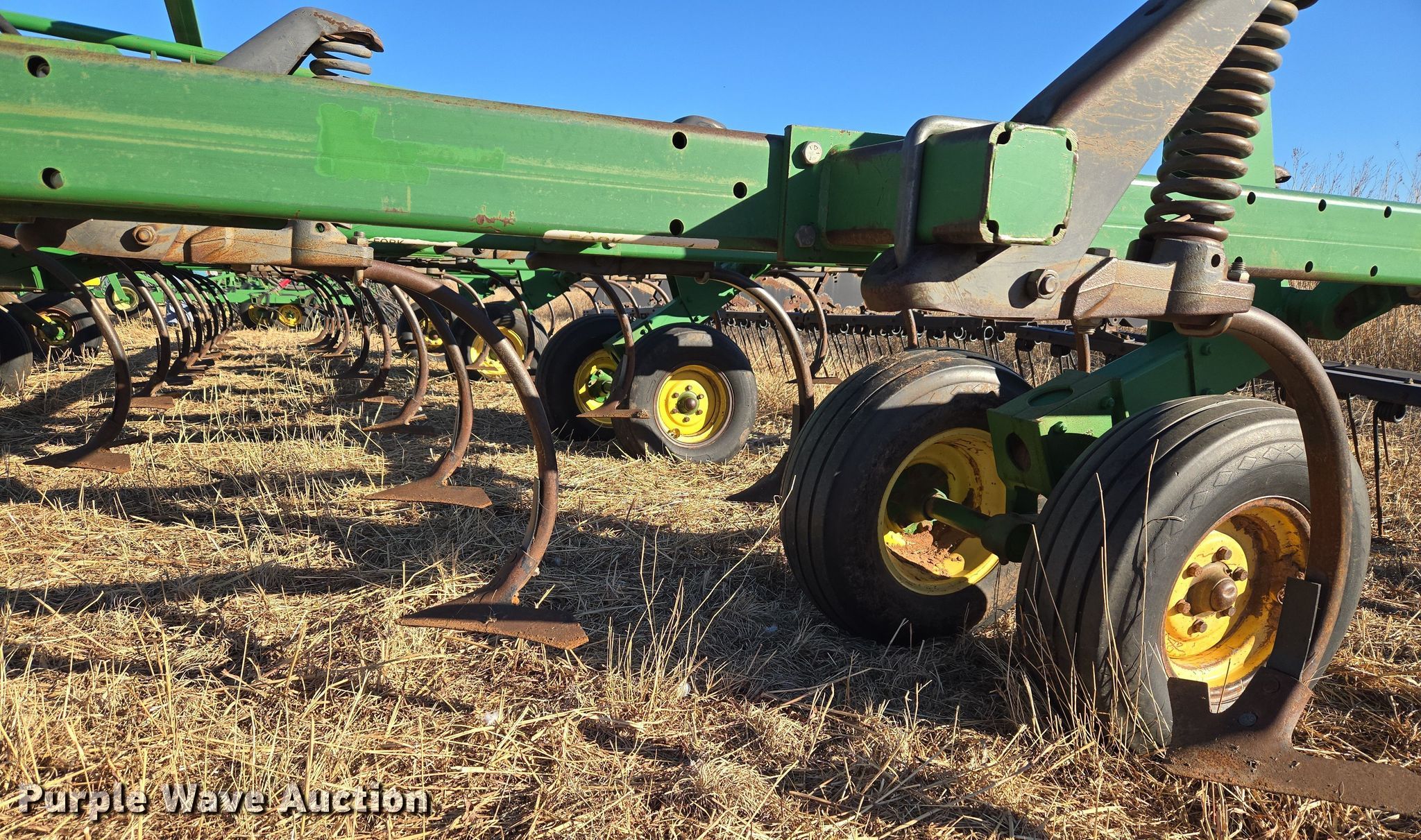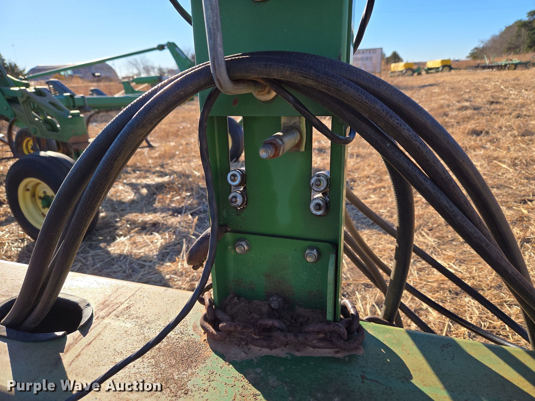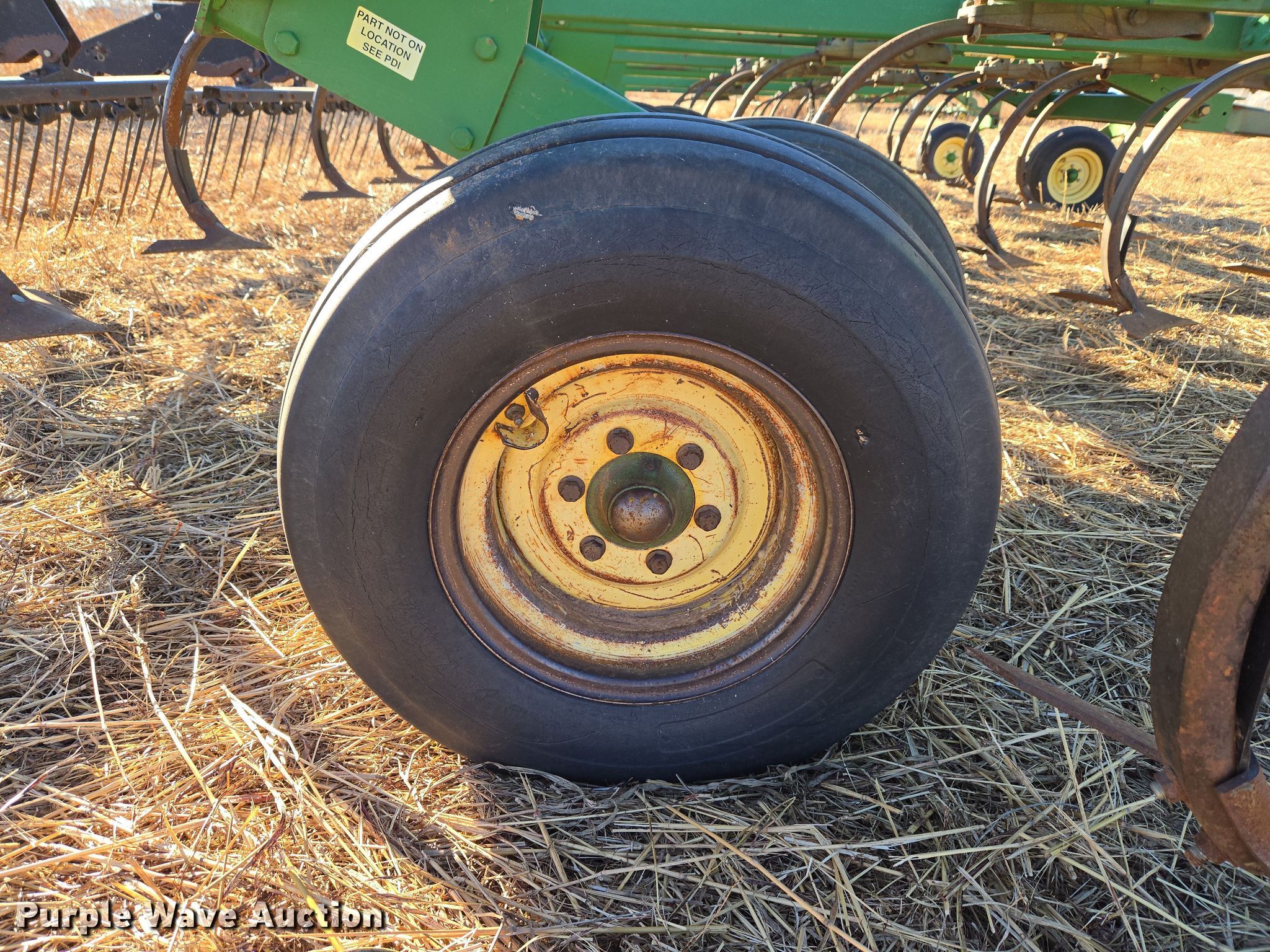 John Deere 2410 chisel. Overall width: 36' 7", Serial: N02410X008060. Features Shanks: 37, Sweep width: 16", Operation Hydraulic lift, Hydraulic fold, Walking tandem axle, Attachments Tine harrow Harrow bars: 3, Transport lights. Tires Tire size: 11L15, Gauge wheels Size: 11L15. Notes Non-operational transport lights. Hitchcock, OK 73744