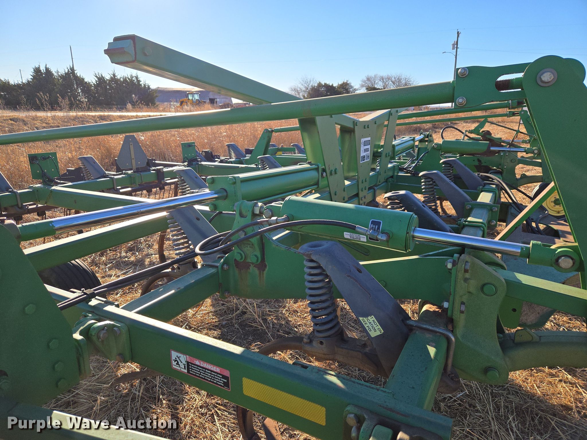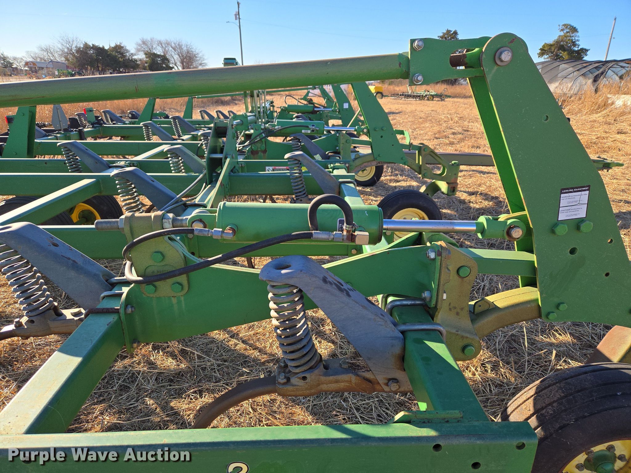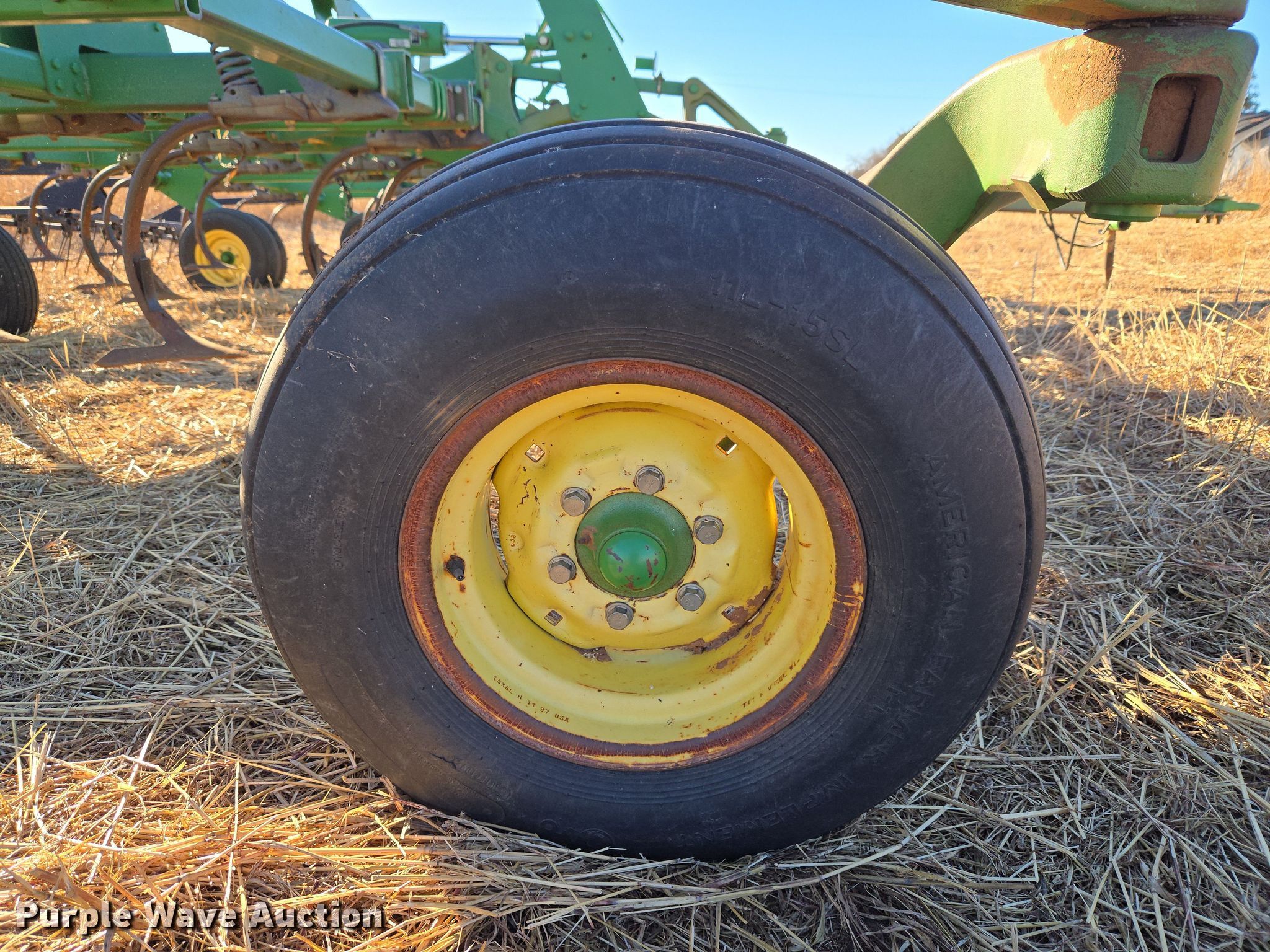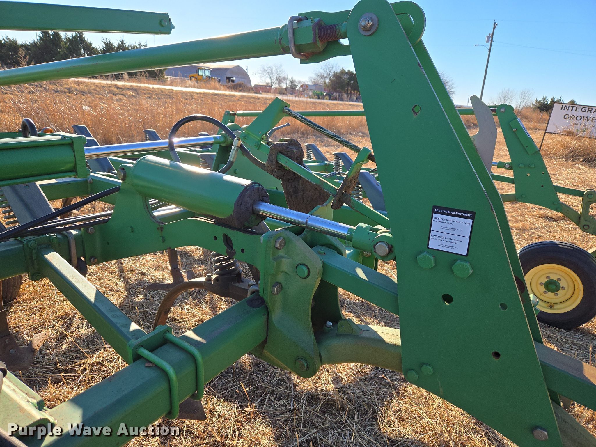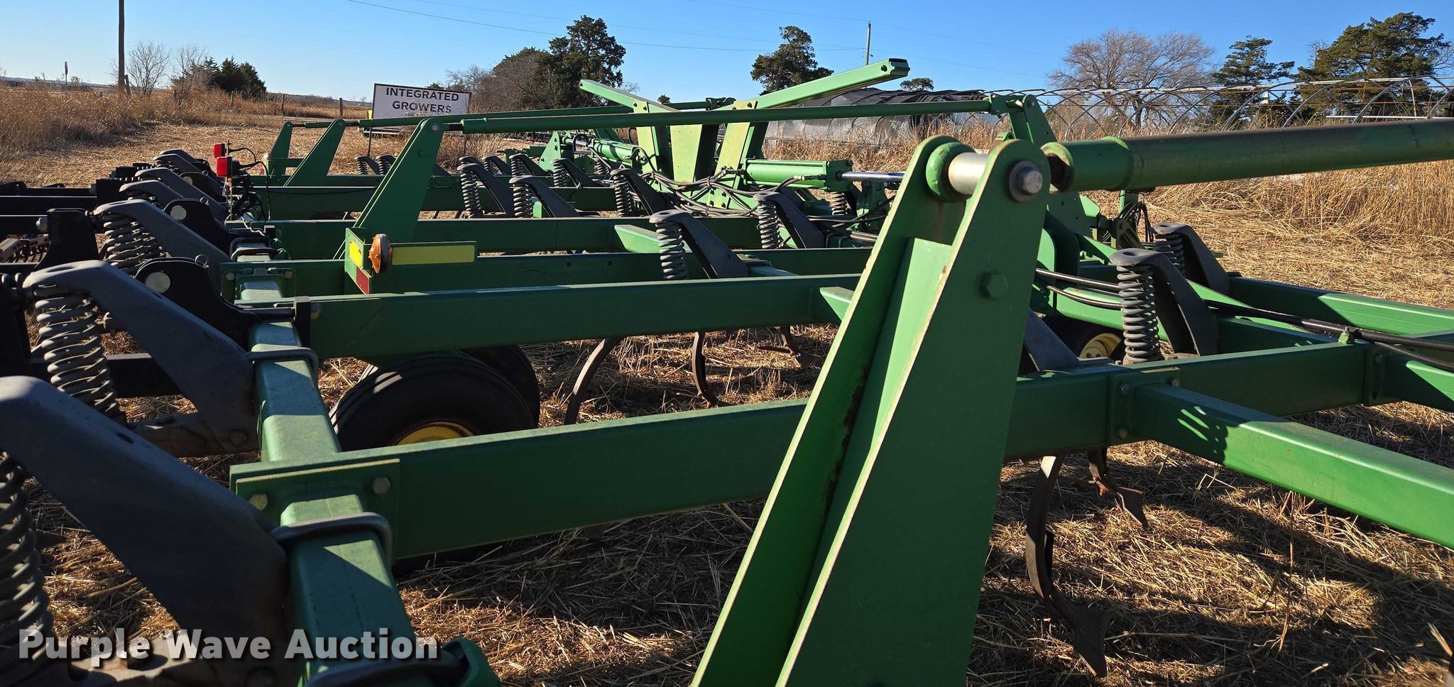 John Deere 2410 chisel. Overall width: 36' 7", Serial: N02410X008060. Features Shanks: 37, Sweep width: 16", Operation Hydraulic lift, Hydraulic fold, Walking tandem axle, Attachments Tine harrow Harrow bars: 3, Transport lights. Tires Tire size: 11L15, Gauge wheels Size: 11L15. Notes Non-operational transport lights. Hitchcock, OK 73744