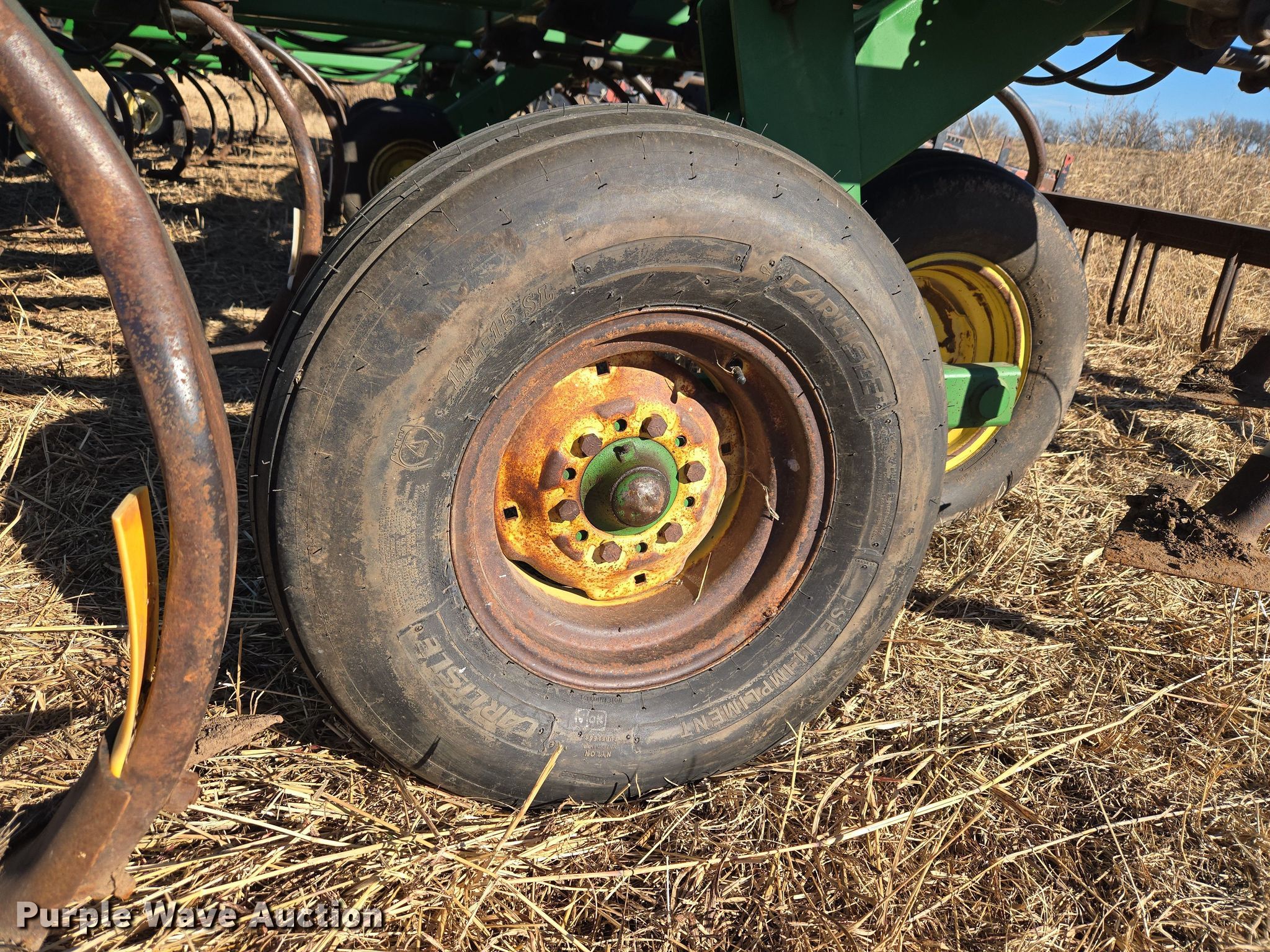 John Deere 1810 field cultivator. Overall width: 52', Serial: H01810X685151. Features Shanks: 47, Sweep width: 16", Operation Hydraulic lift, Hydraulic fold, Walking tandem axle, Attachments Spike tooth harrow Harrow bars: 3, Transport lights. Tires Tire size: 11L15, Gauge wheels Size: 11L15. Notes Non-operational transport lights, Tires flat. Hitchcock, OK 73744