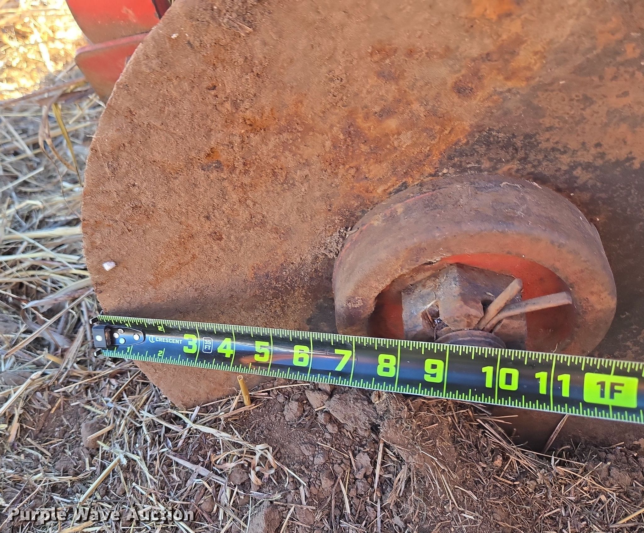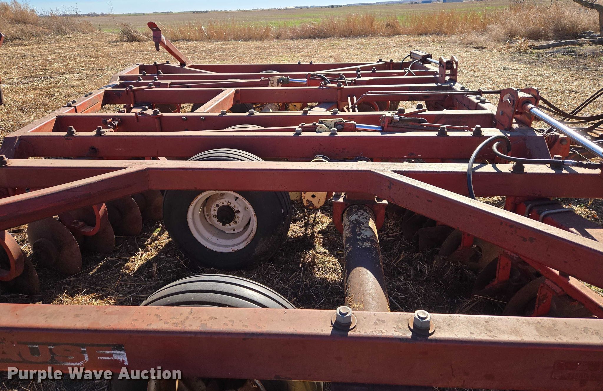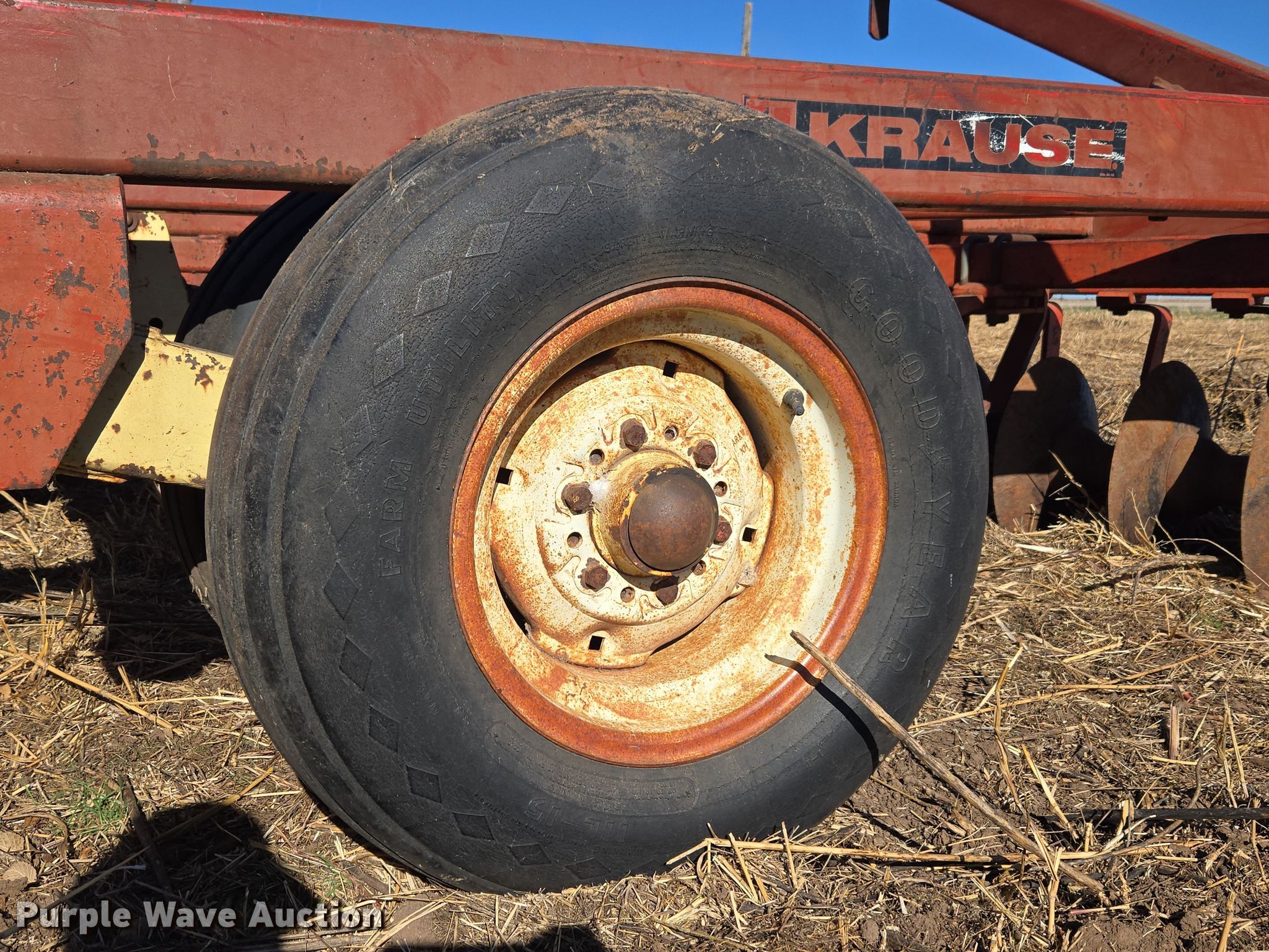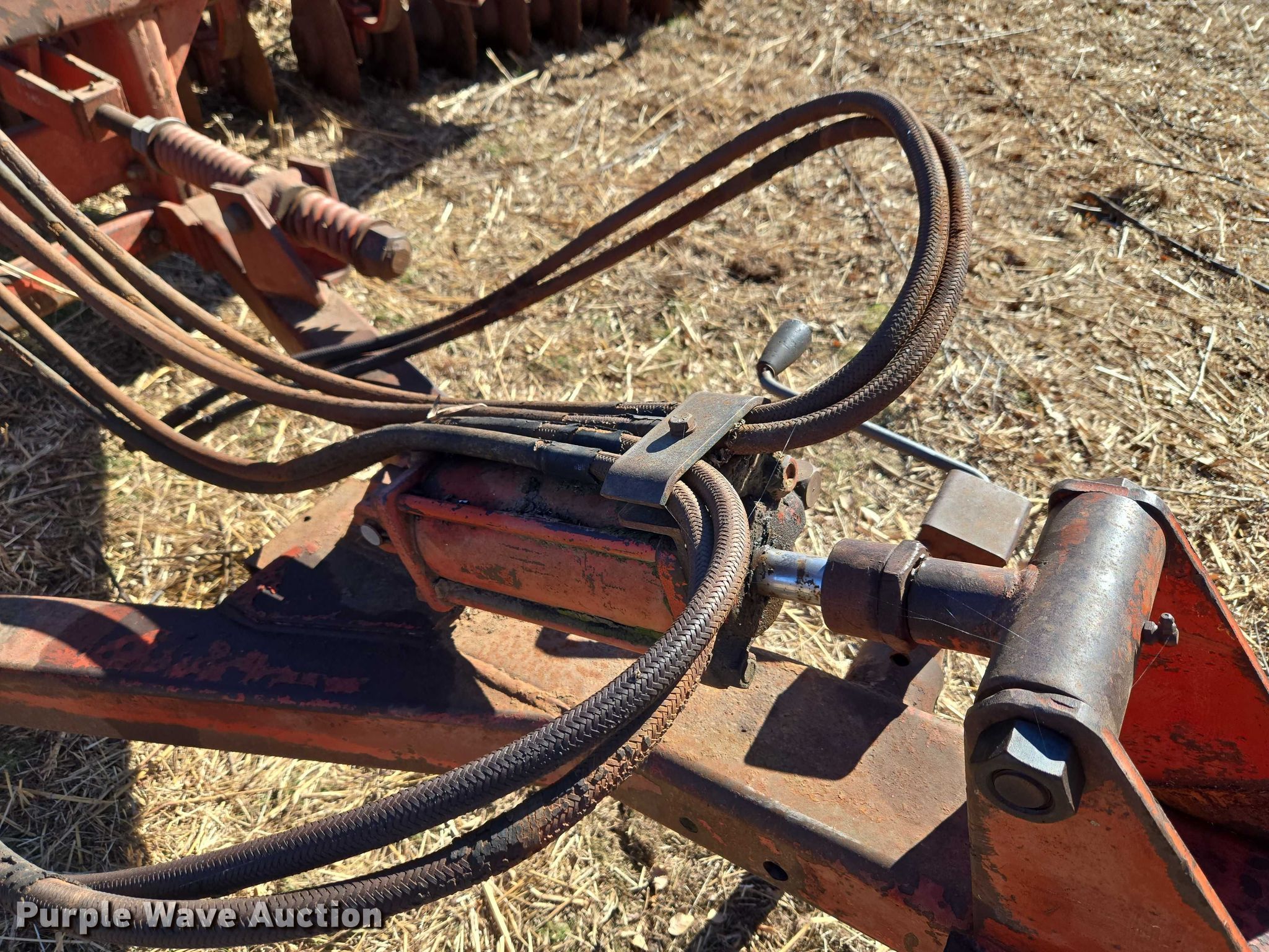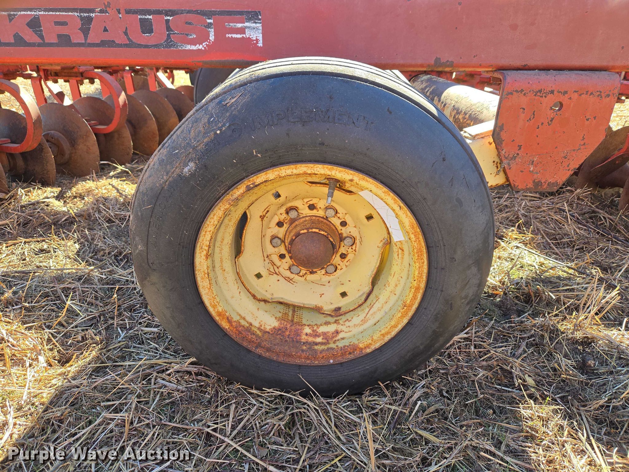 KRAUSE 2413 double off-set disk. Overall width: 25'. Features Front blades Diameter: 16", Spacing: 9", Rear blades Diameter: 16", Spacing: 10", Disk scrapers, Operation Hydraulic lift, Hydraulic fold, Leveler: Hydraulic. Tires Tire size: 11L1512.5-15. Notes Tires flat, Hydraulic leak. Hitchcock, OK 73744