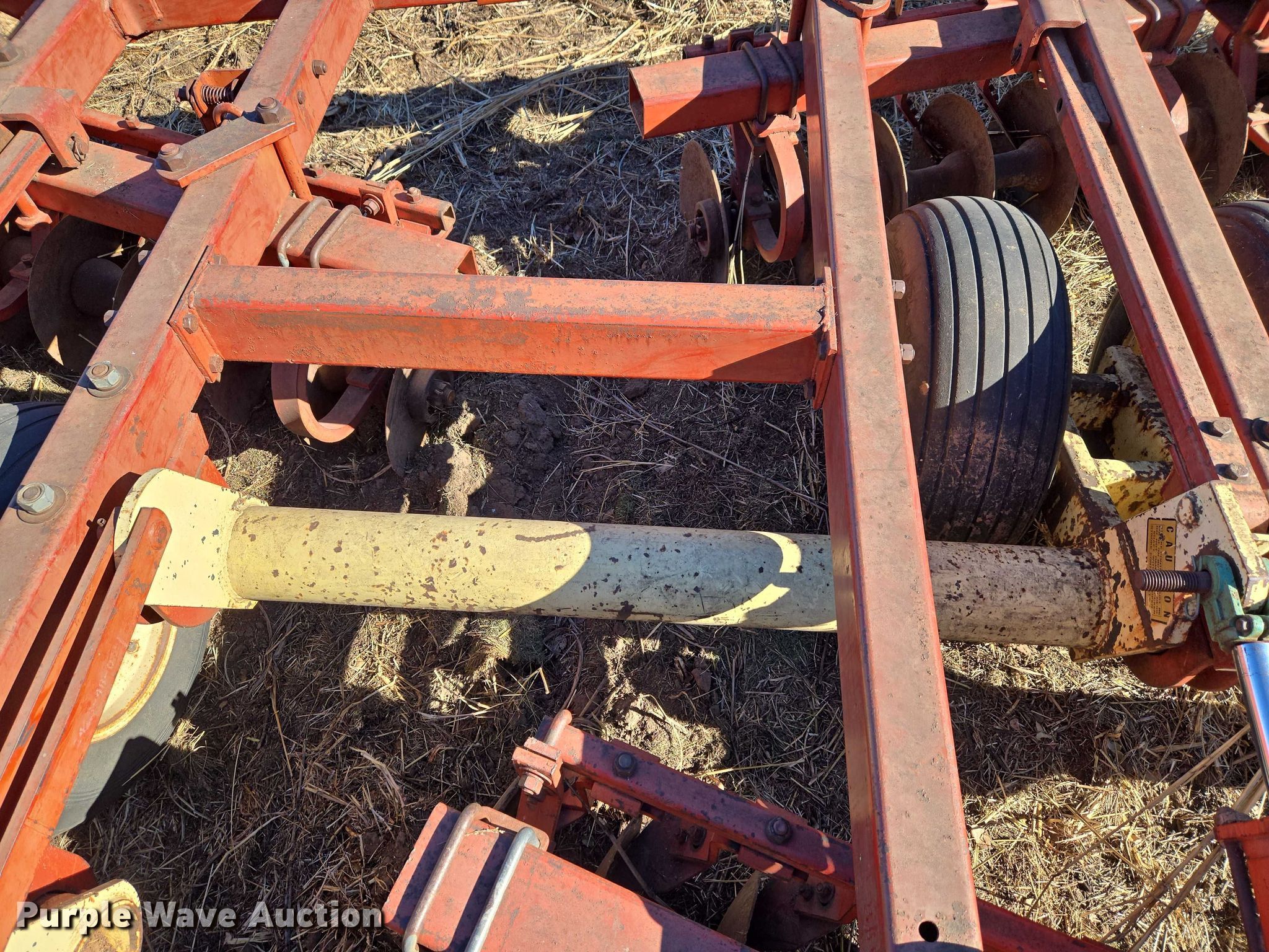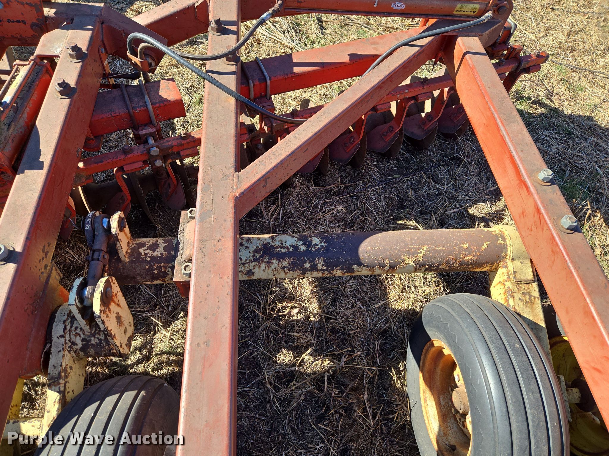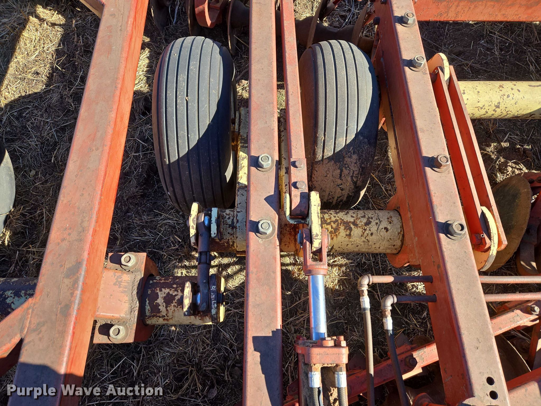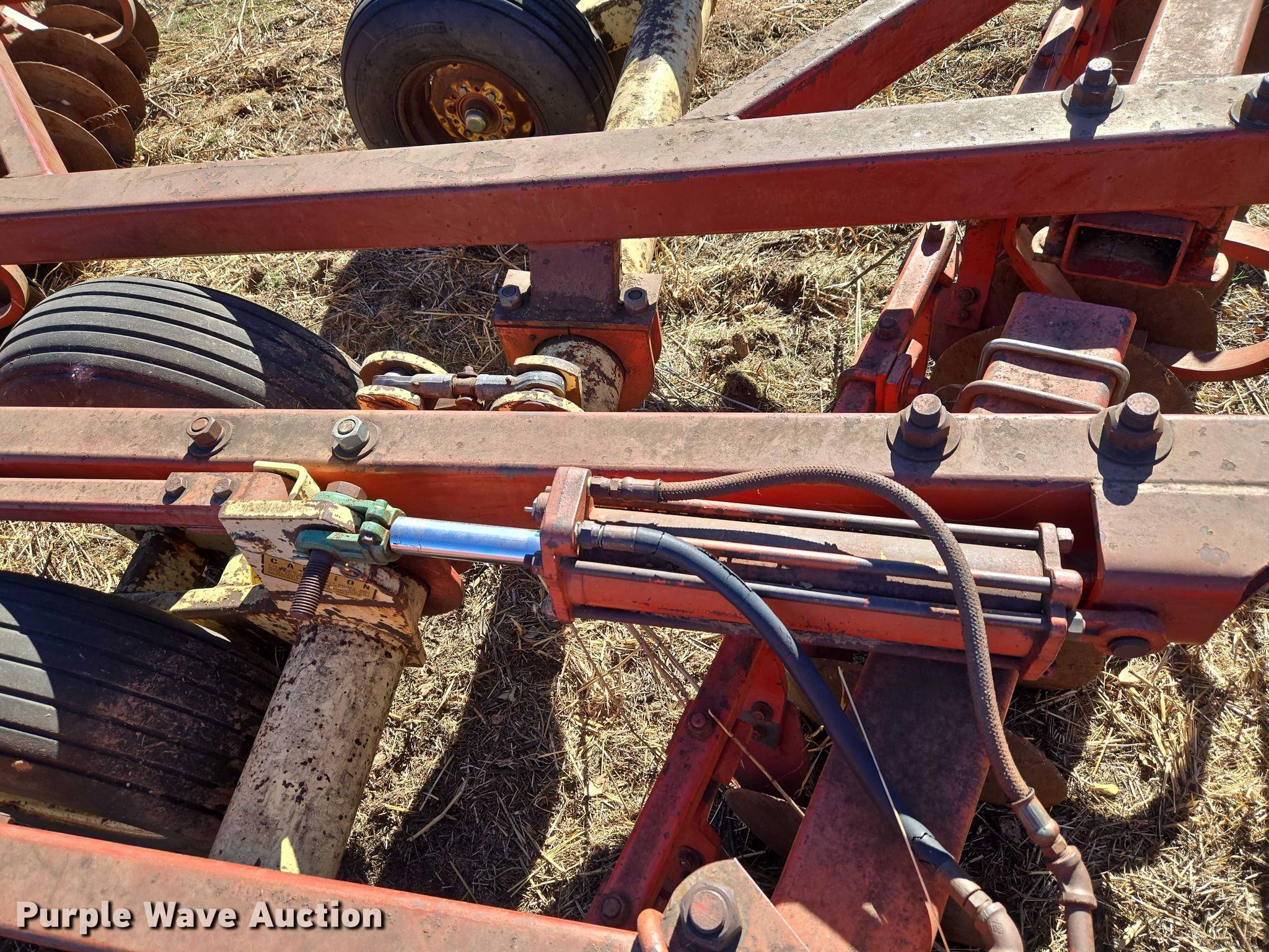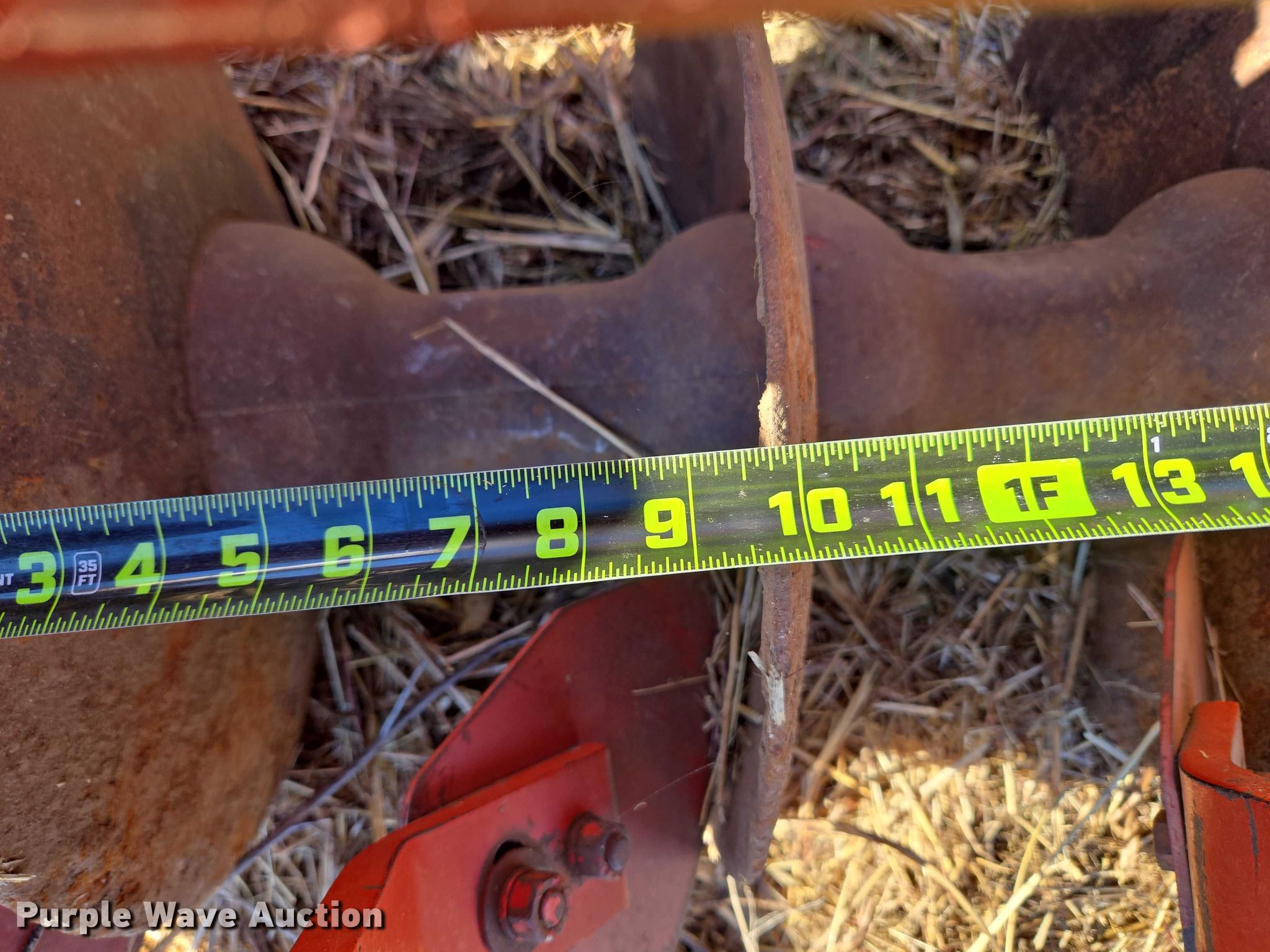 KRAUSE 2413 double off-set disk. Overall width: 25'. Features Front blades Diameter: 16", Spacing: 9", Rear blades Diameter: 16", Spacing: 10", Disk scrapers, Operation Hydraulic lift, Hydraulic fold, Leveler: Hydraulic. Tires Tire size: 11L1512.5-15. Notes Tires flat, Hydraulic leak. Hitchcock, OK 73744