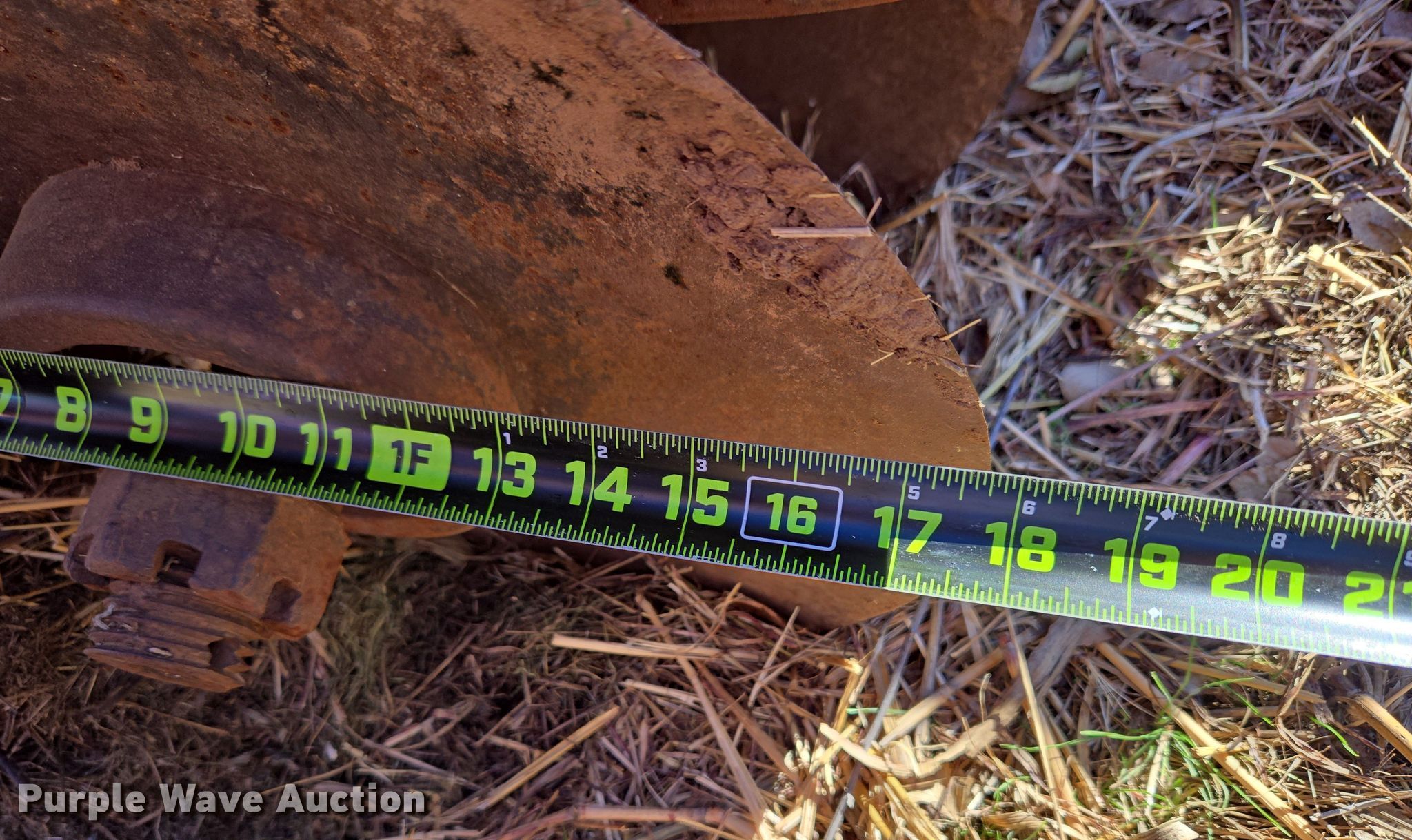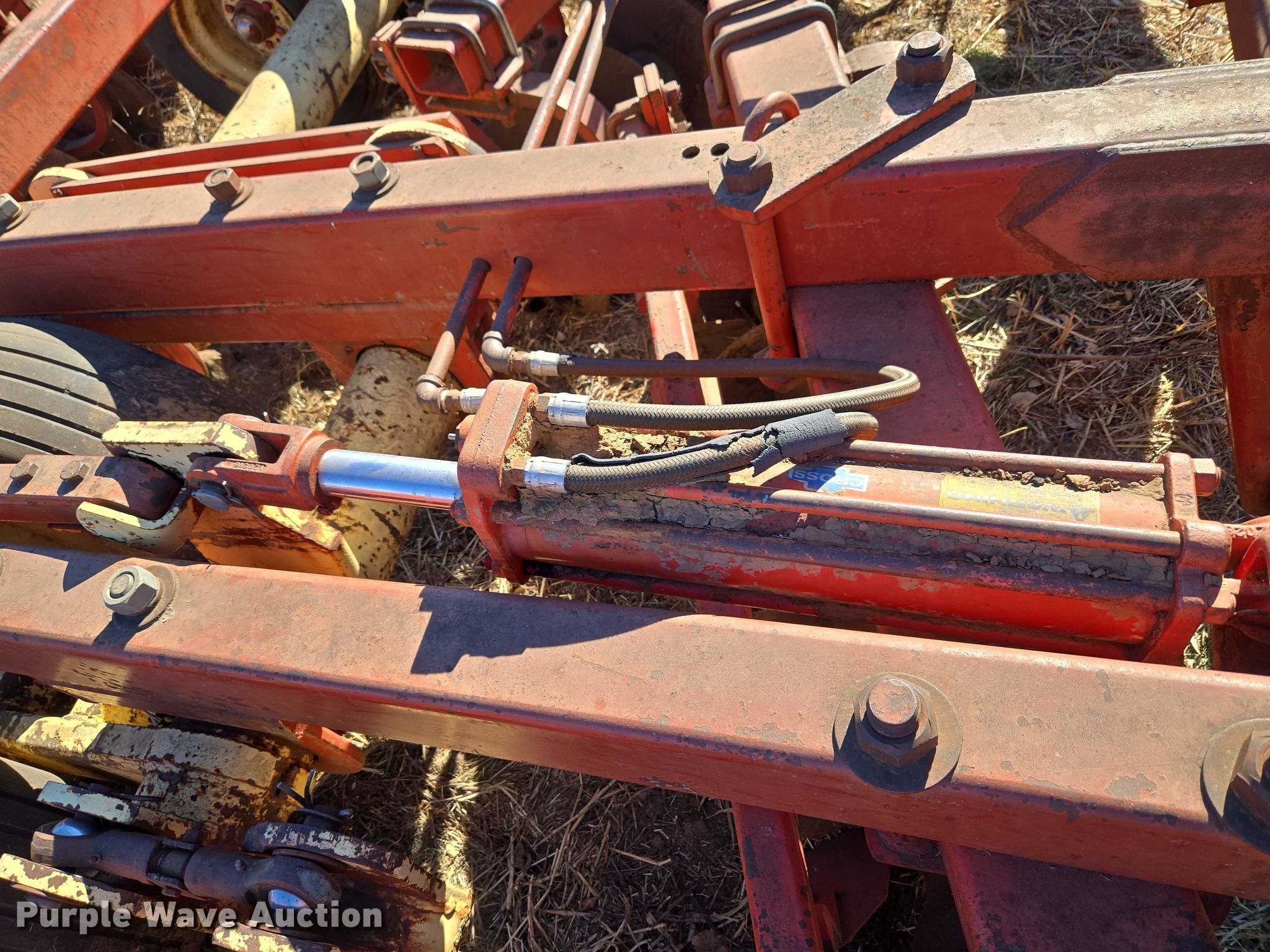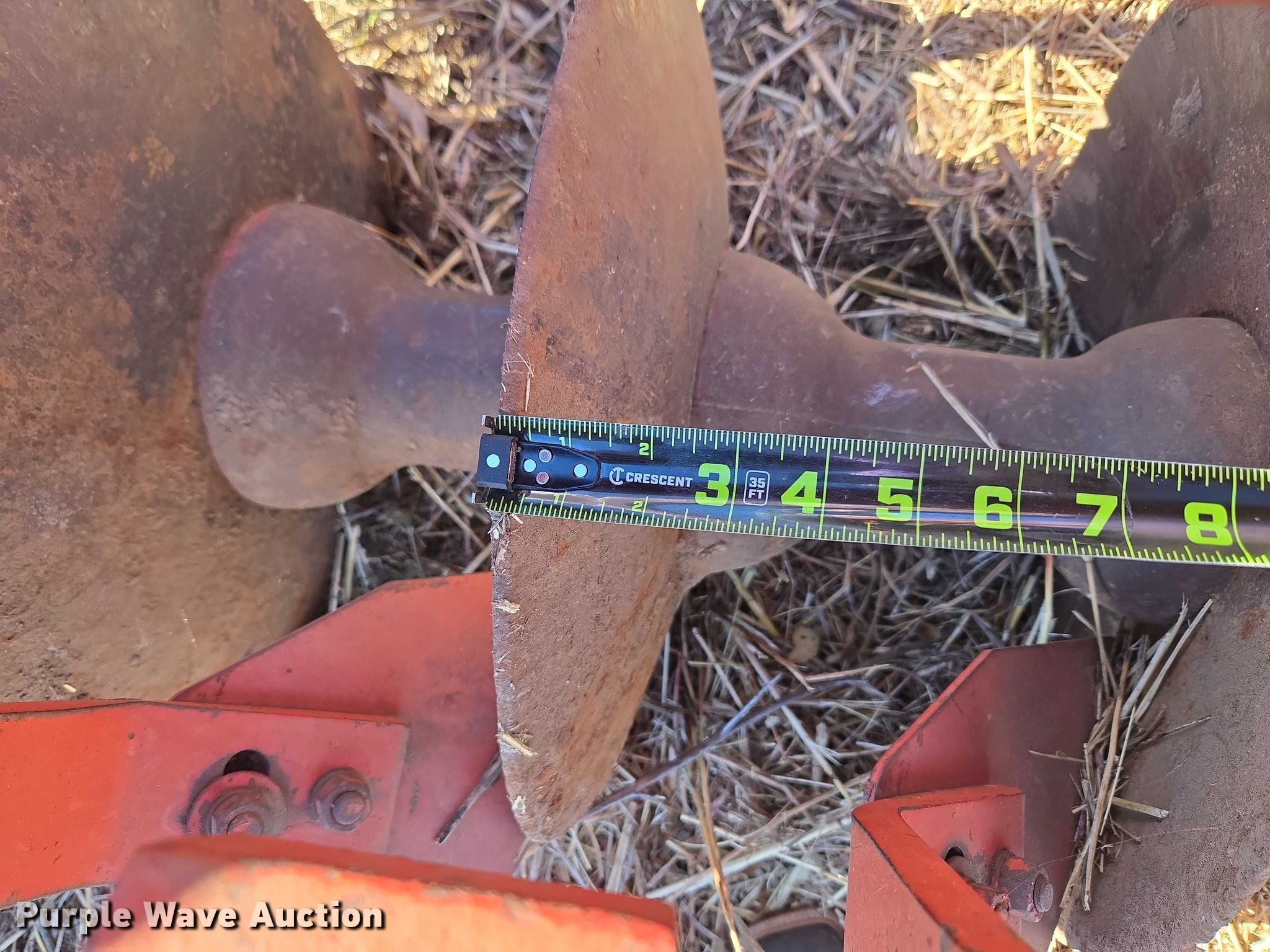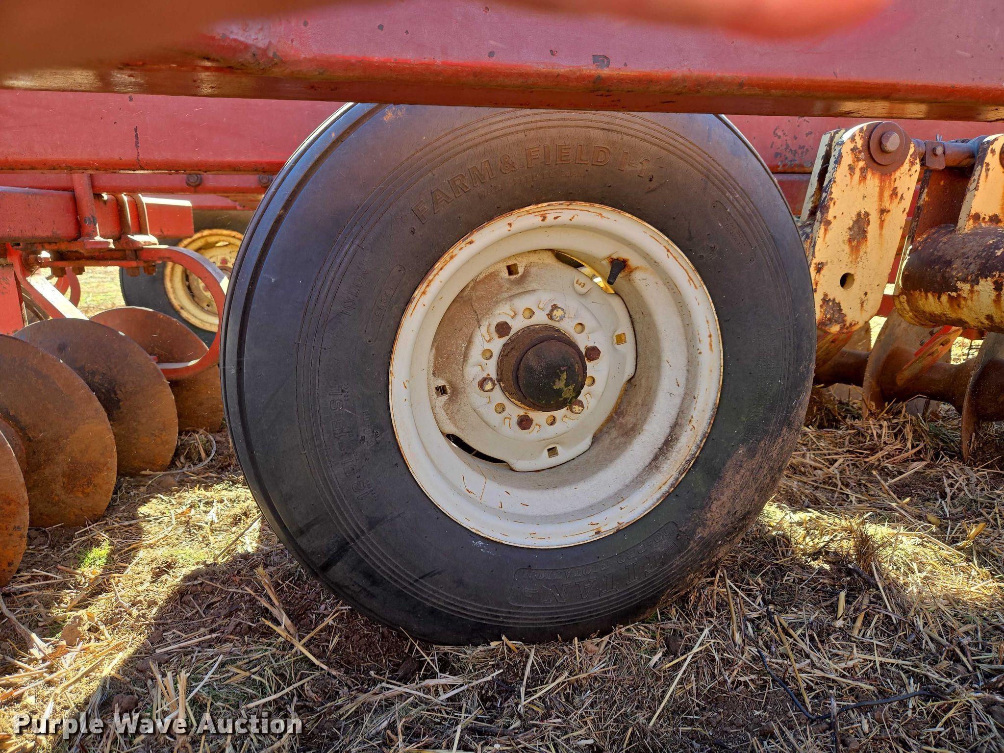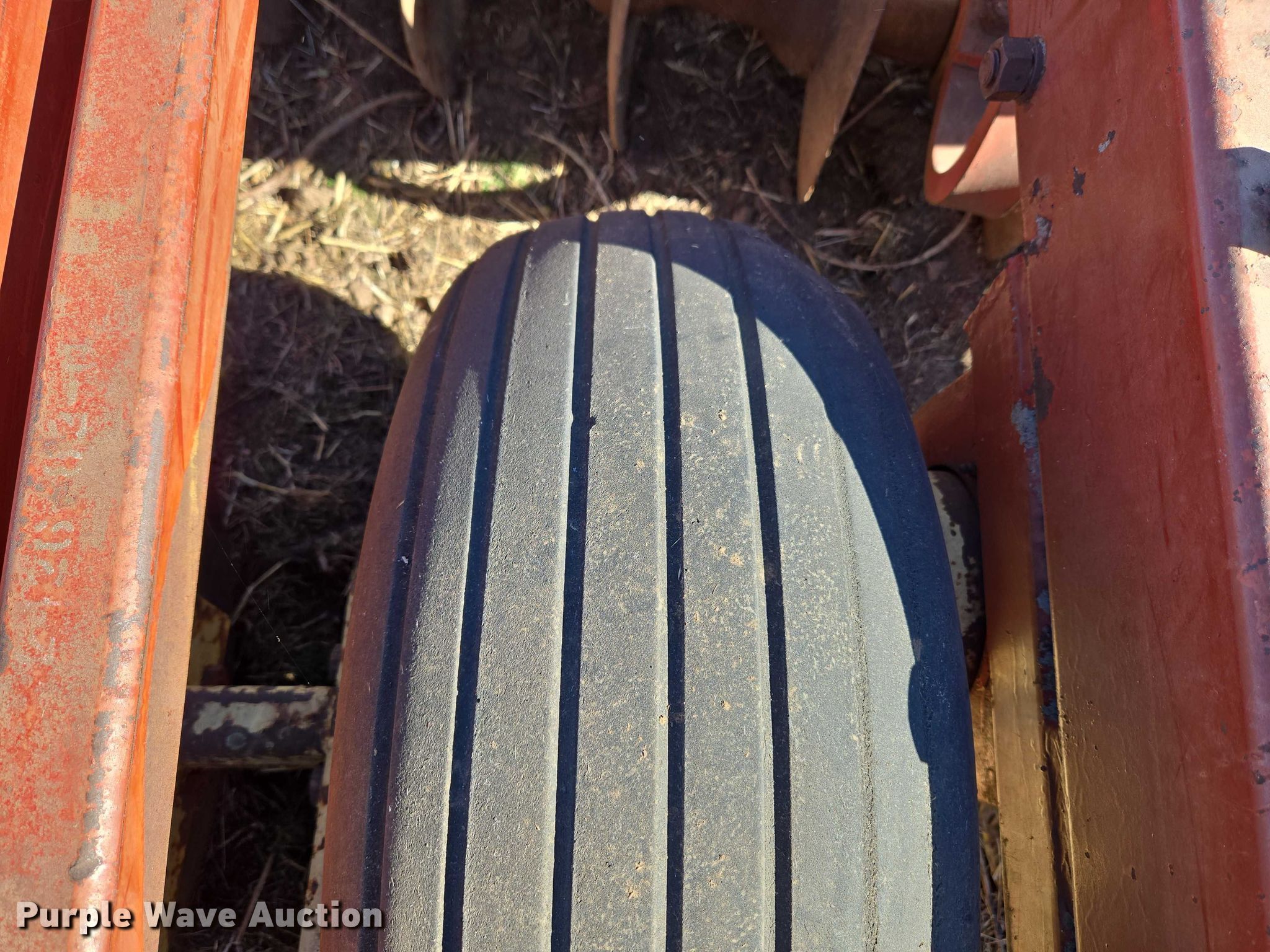 KRAUSE 2413 double off-set disk. Overall width: 25'. Features Front blades Diameter: 16", Spacing: 9", Rear blades Diameter: 16", Spacing: 10", Disk scrapers, Operation Hydraulic lift, Hydraulic fold, Leveler: Hydraulic. Tires Tire size: 11L1512.5-15. Notes Tires flat, Hydraulic leak. Hitchcock, OK 73744