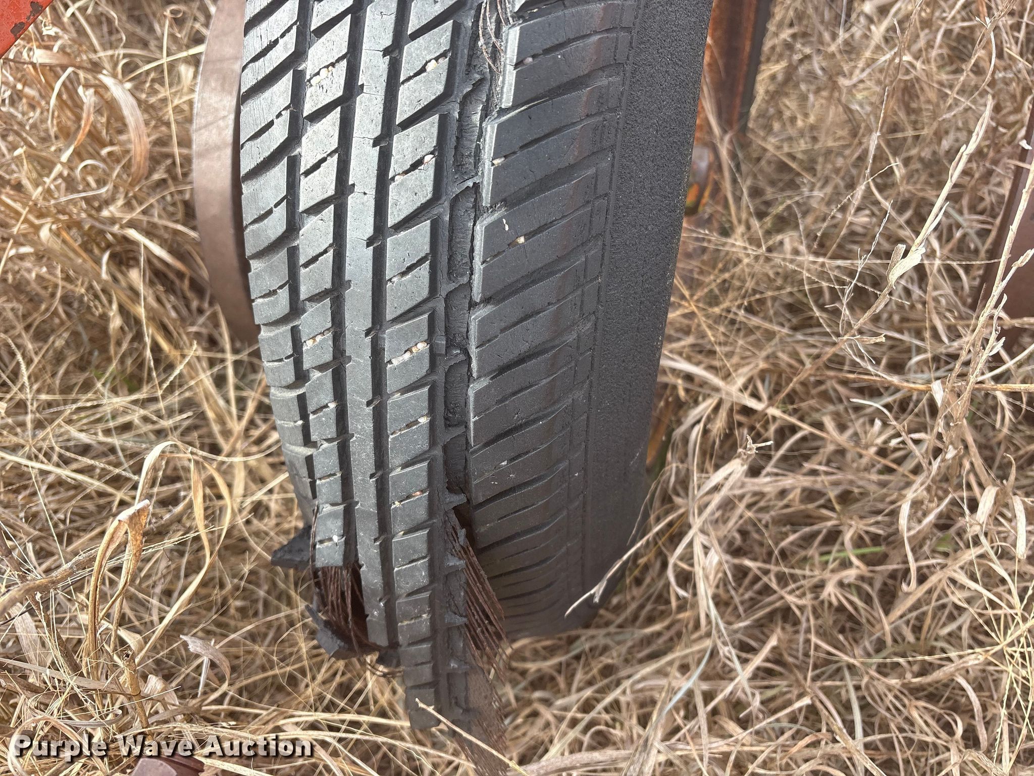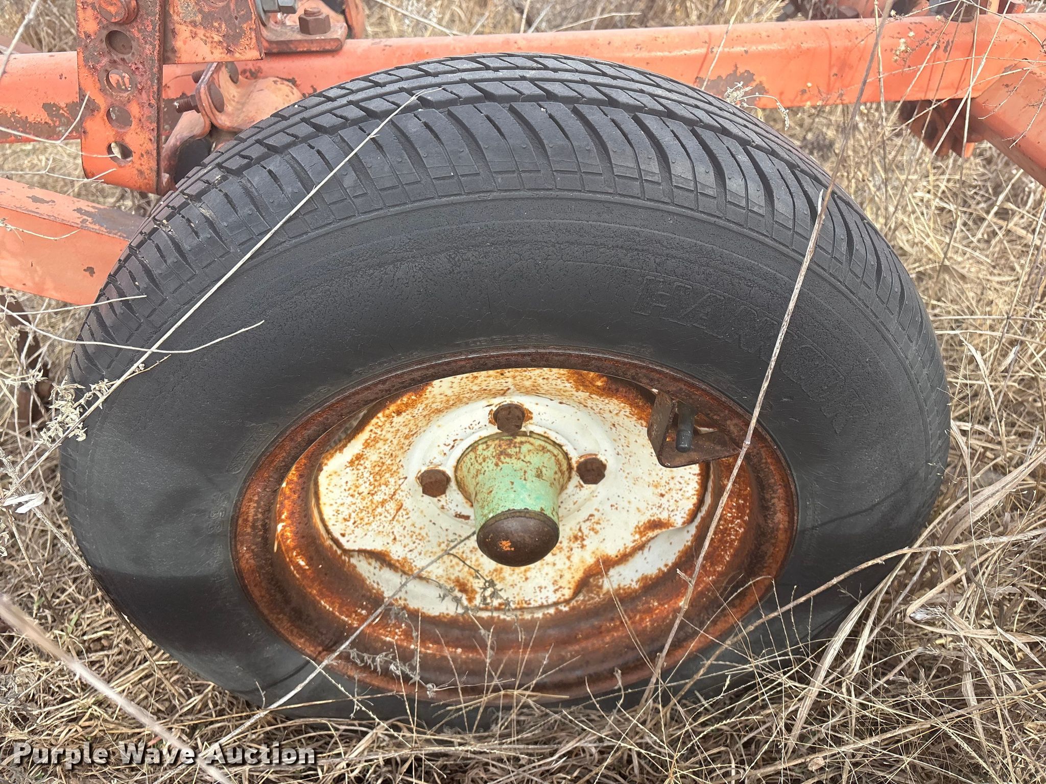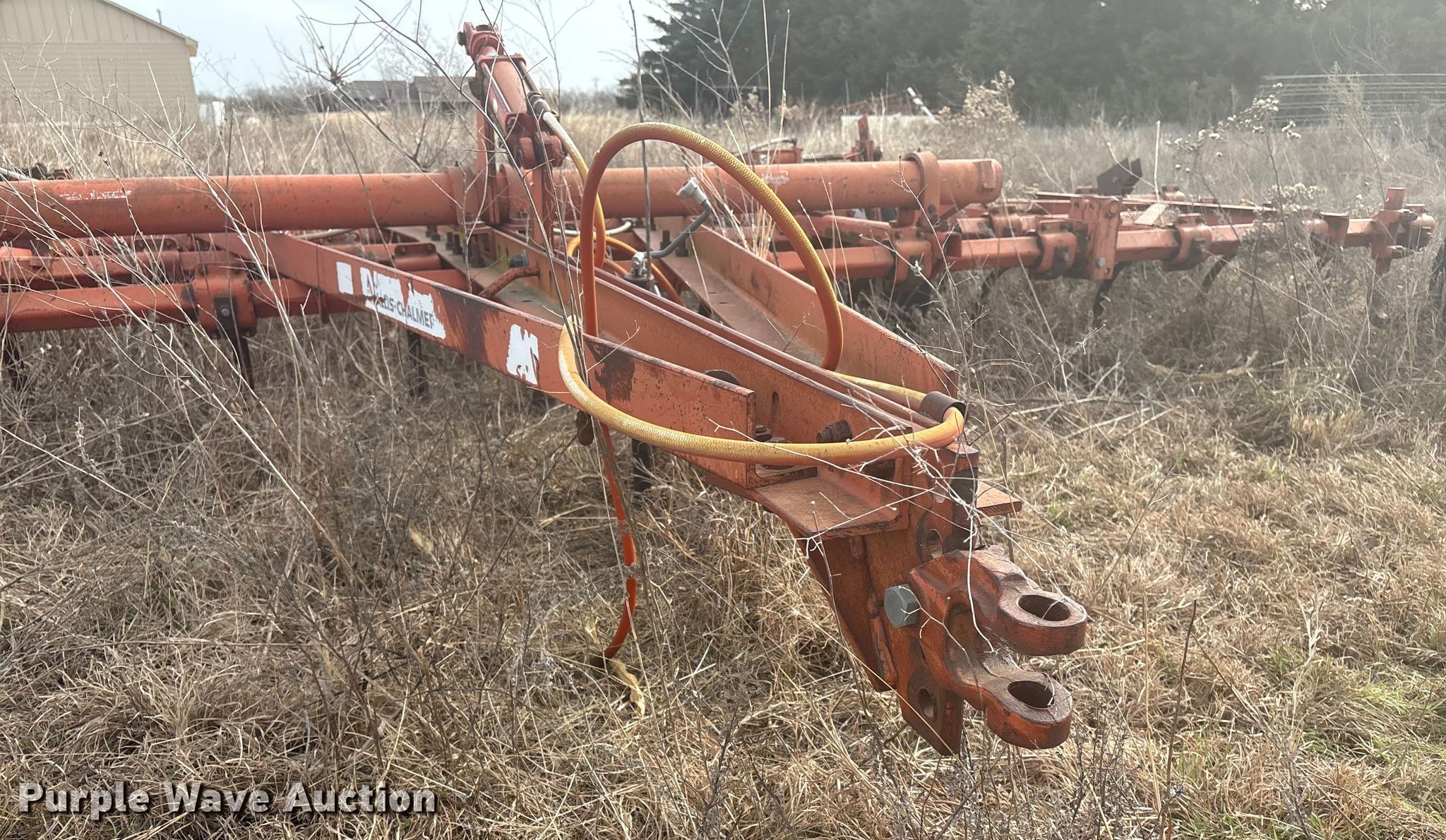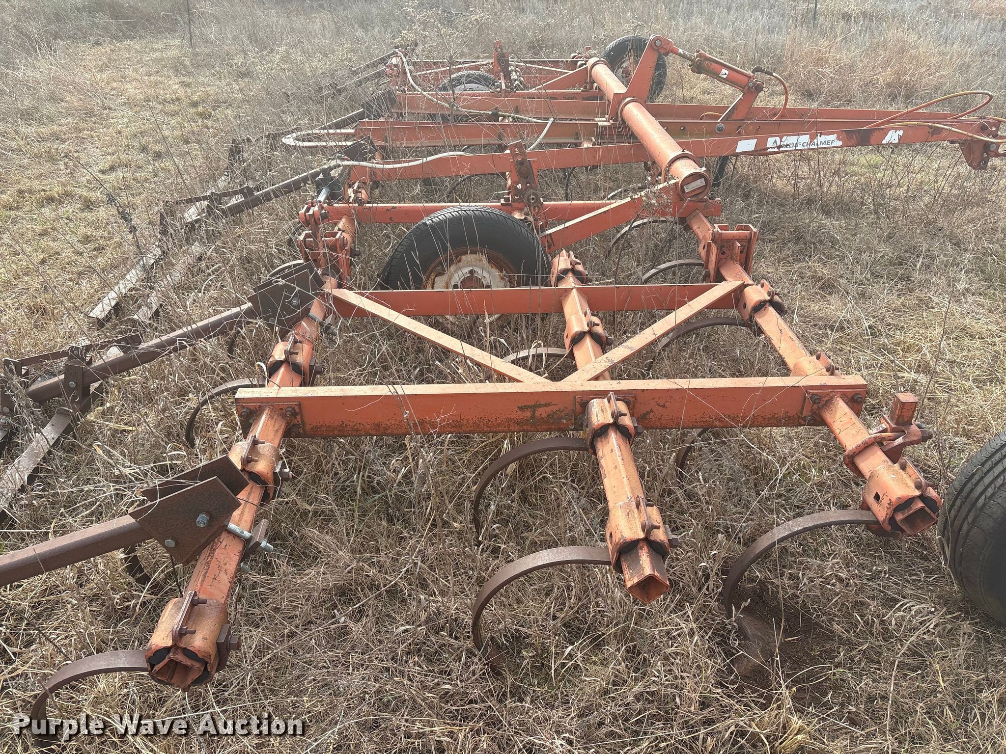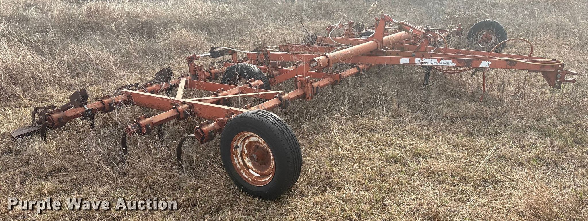 Allis Chalmers field cultivator. Overall width: 21' 6". Features Shanks: 42, Sweep width: 9", Operation Hydraulic lift, Hydraulic fold, Attachments Spike tooth harrow Harrow bars: 2.. Tires Tire size: 195/70R14. Notes Flat tires, Unknown operating condition. McDonald Services. Goddard, KS 67052