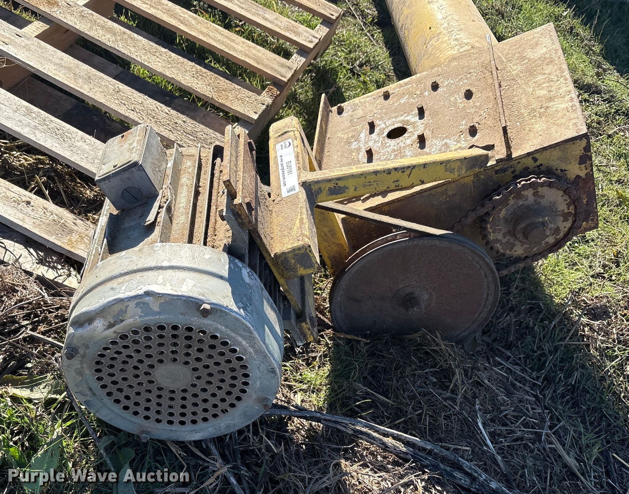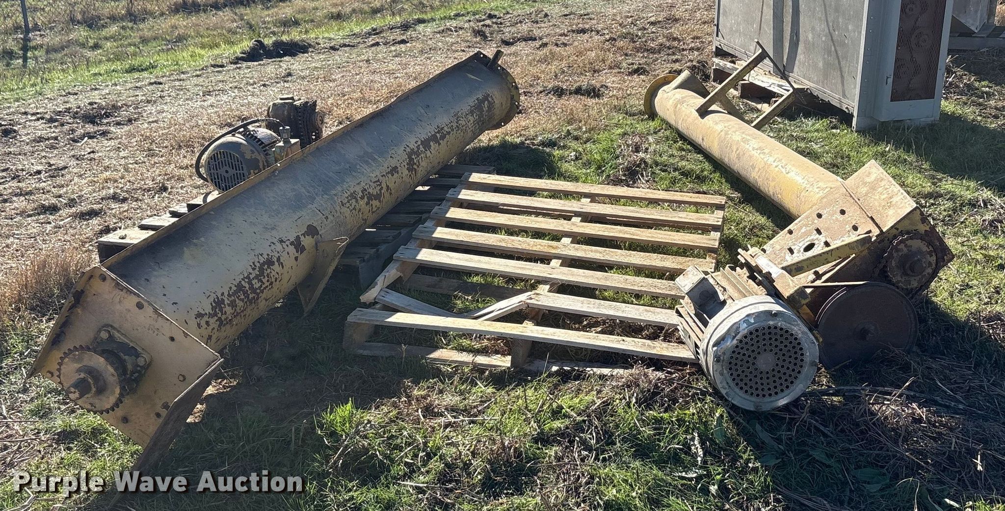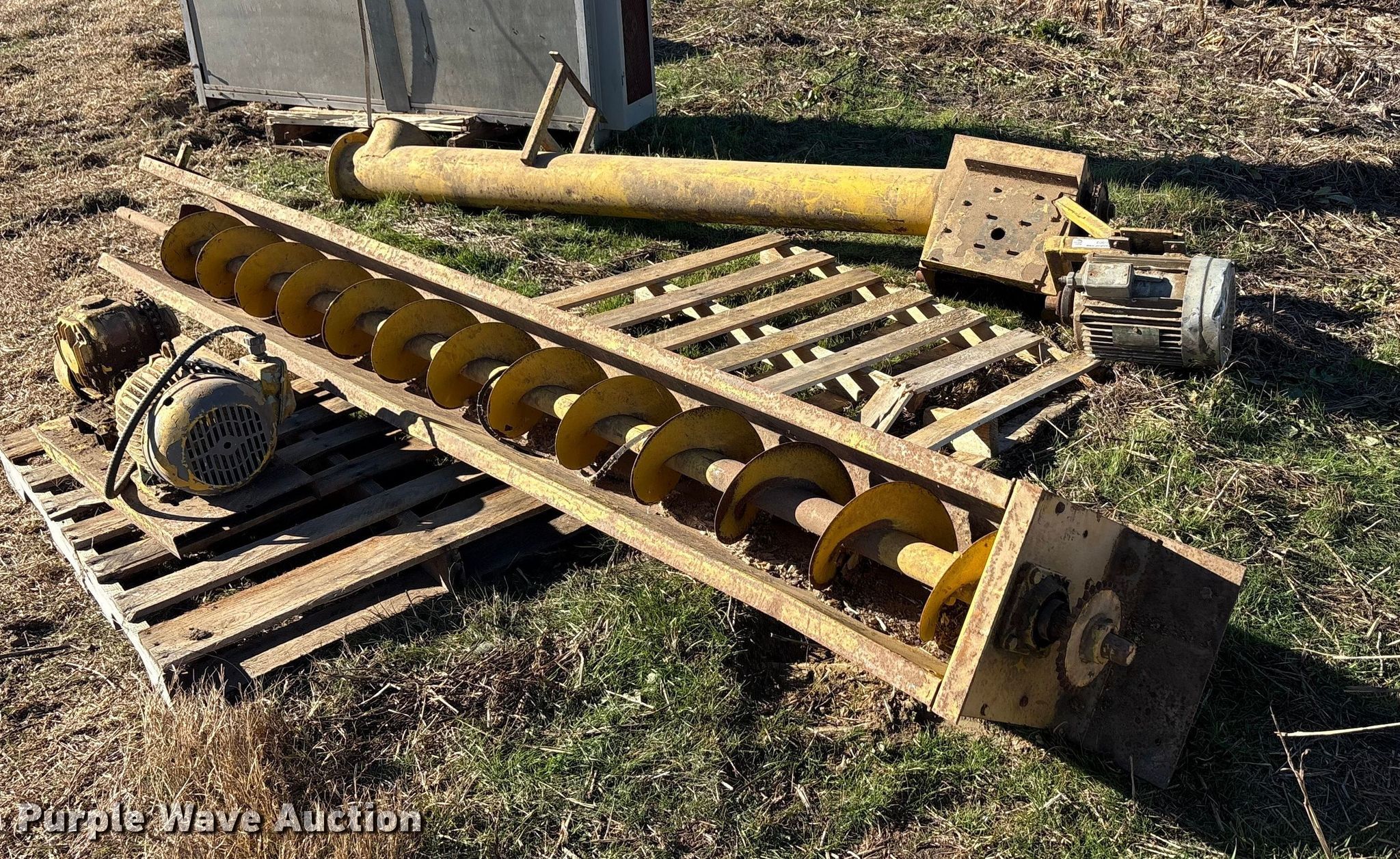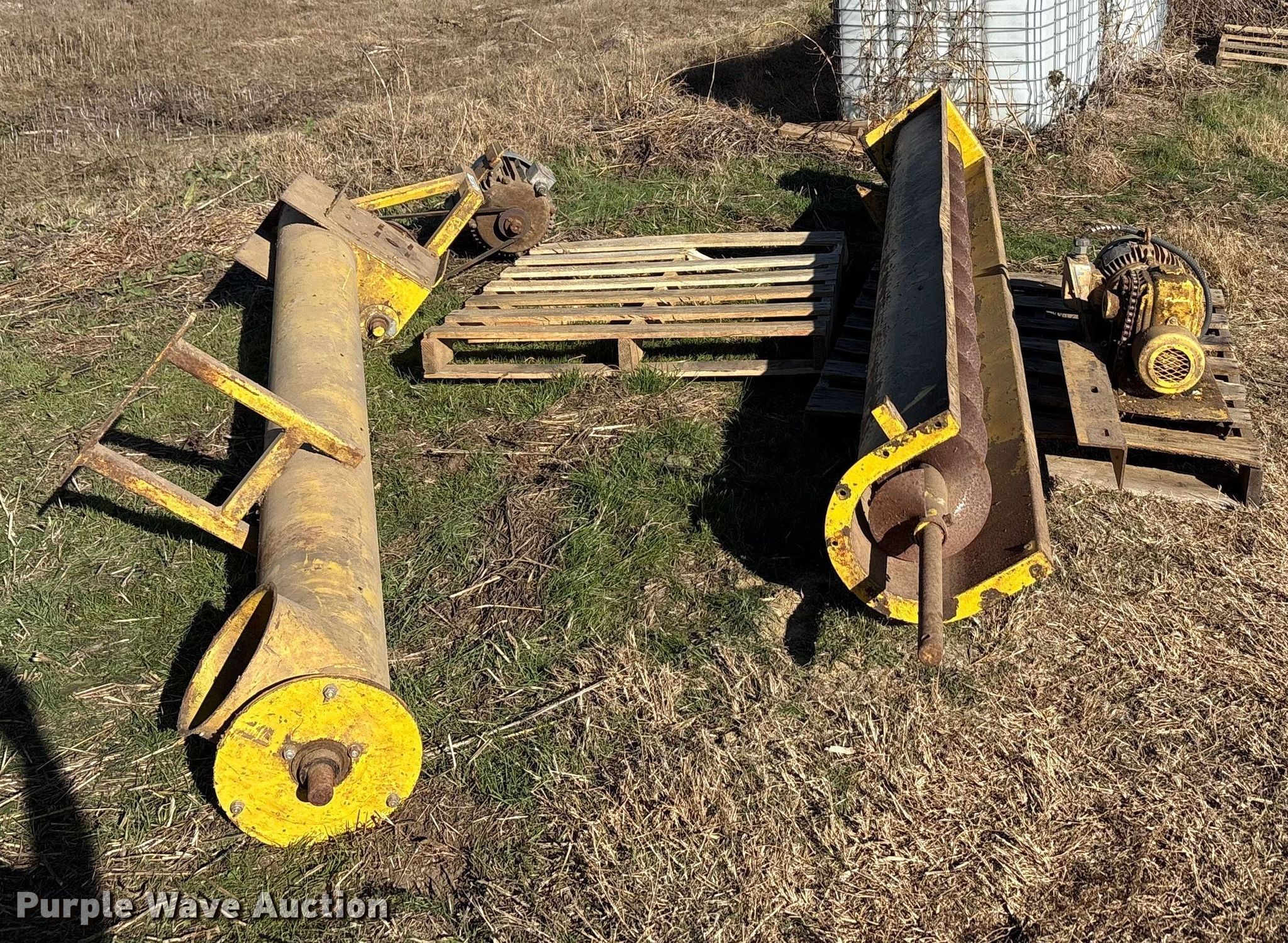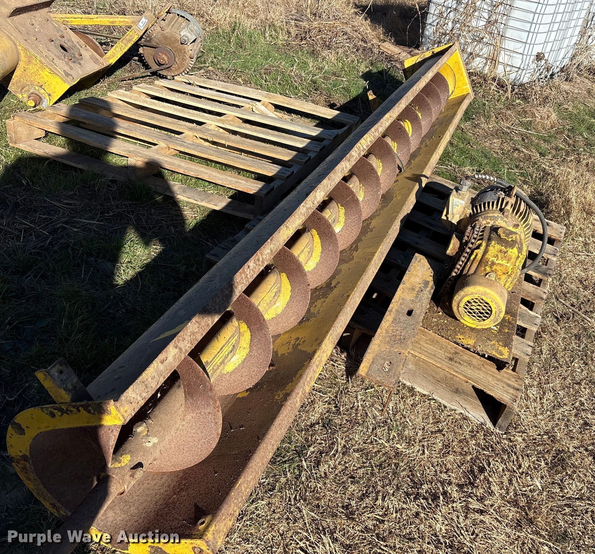 Purple Wave is selling a used Auger or Conveyor in Texas. This item is a 90 degree auger with the following: Length: 122', Diameter: 10"