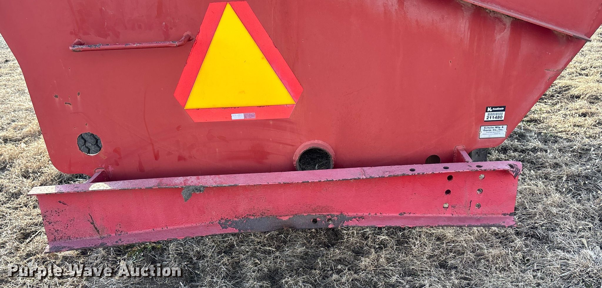 Schuler SRM 354 feed wagon. Serial: 12C1407140, Unit #: 211480. Features PTO: 540, Scales Avery Weigh Tronix 640 XL, Discharge: Side, Chain Width: 40", Chute: Hydraulic, Door: Hydraulic. Tires Size: 385 65 R22. Notes PTO issues, damaged, Possible auger issues. KanEquip Inc.. Marysville, KS 66508