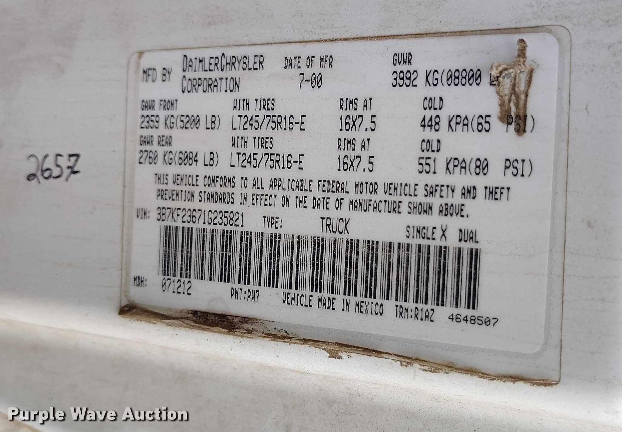 Purple Wave is selling a used 3/4 or 1 Ton Pickup or Van in Indiana. This item is a 2001 Dodge Ram 2500 Ext. Cab pickup truck with the following: Miles: 200,641 on odometer, VIN: 3B7KF23671G235821, Unit #: 103058