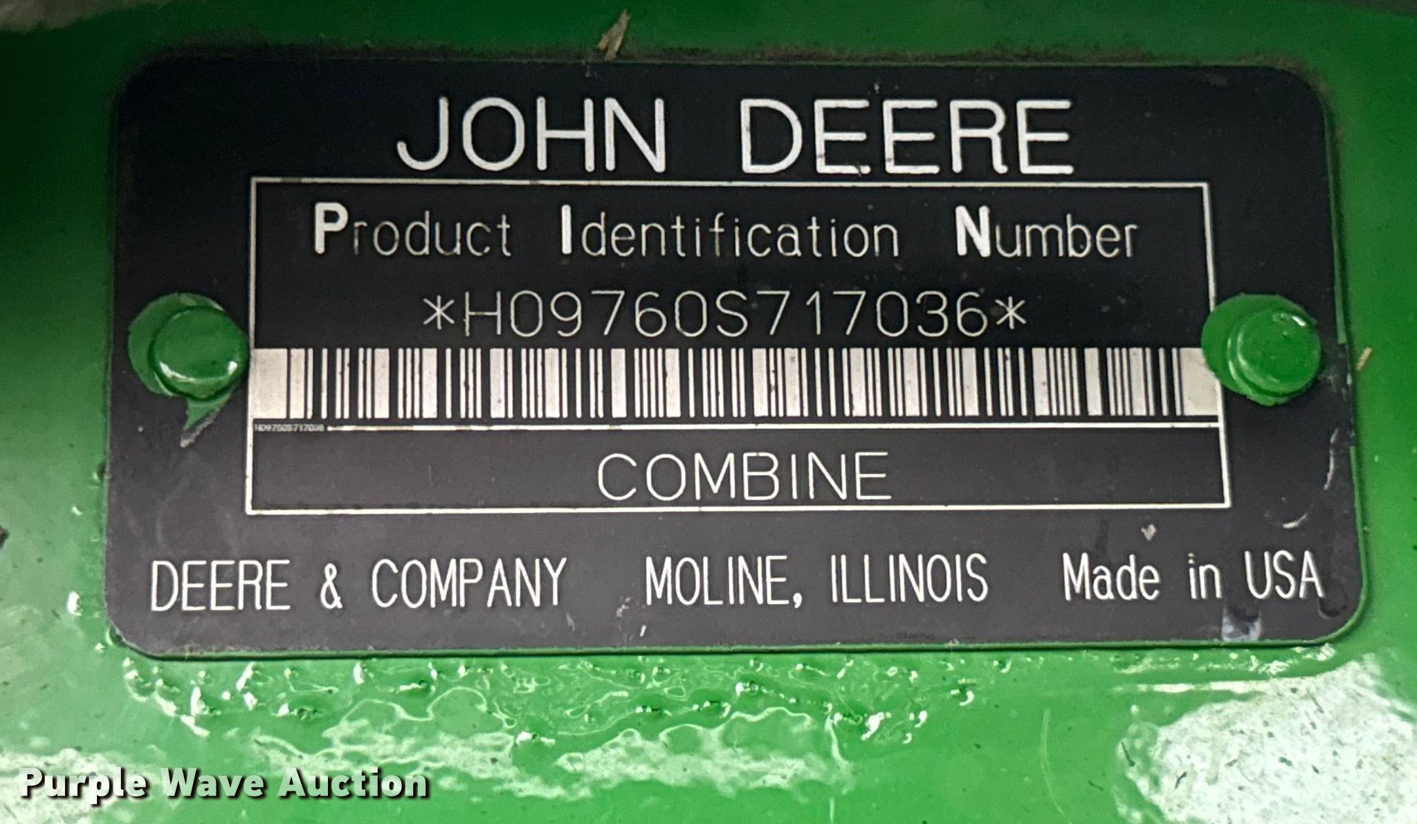 Purple Wave is selling a used Combine in Illinois. This item is a 2006 John Deere 9760 STS combine with the following: Engine hours: 3,984 on meter, Separator hours: 2,660 on meter, Serial: H09760S717036, Unit #: 97028825
