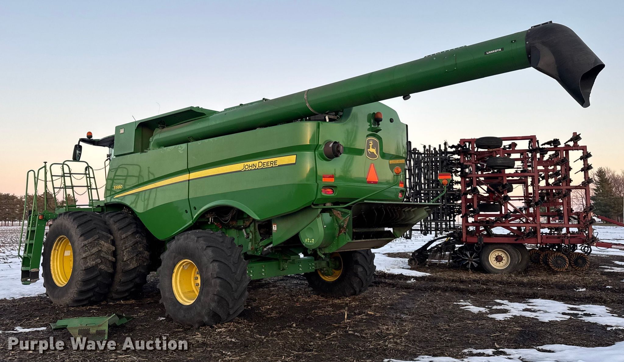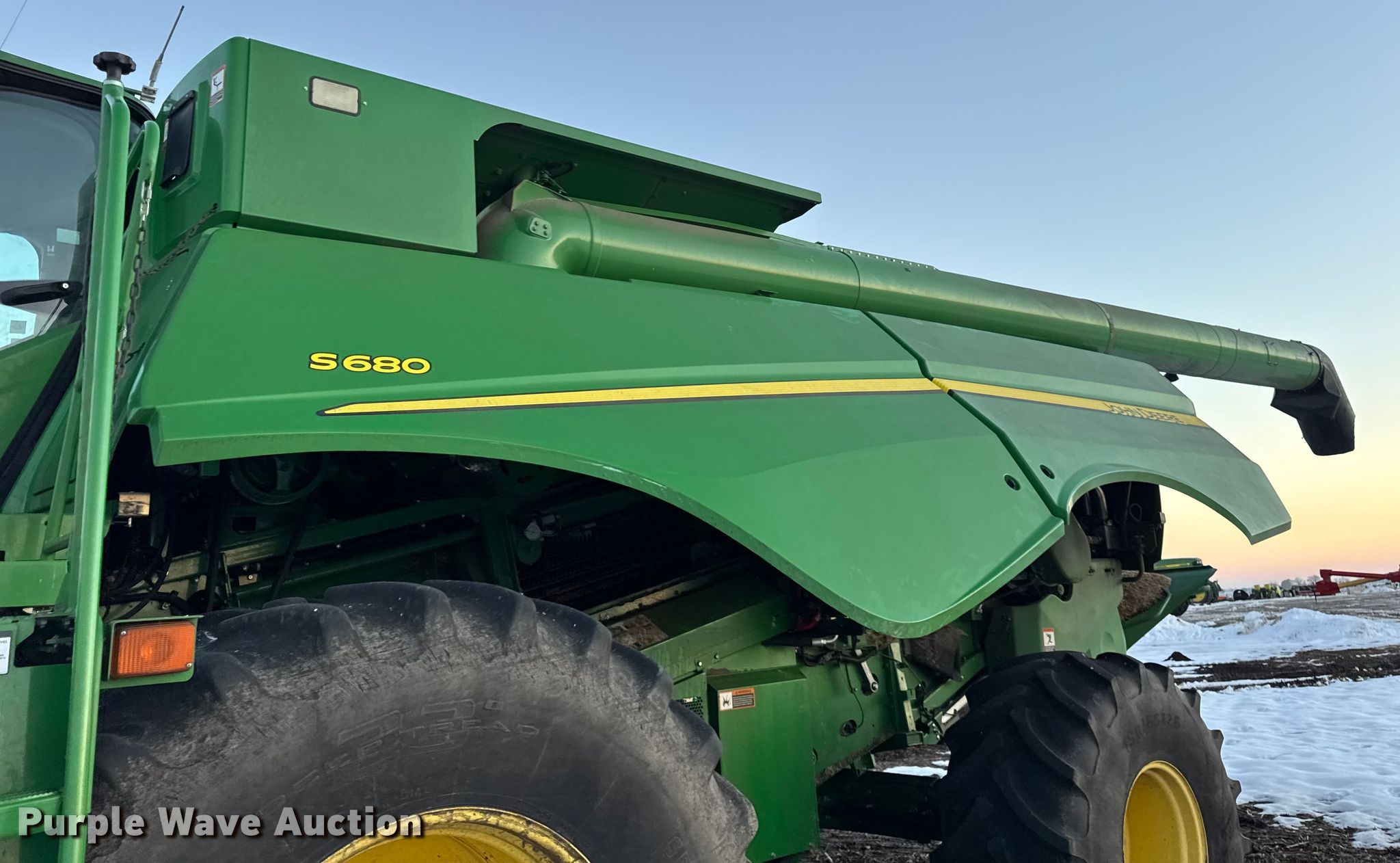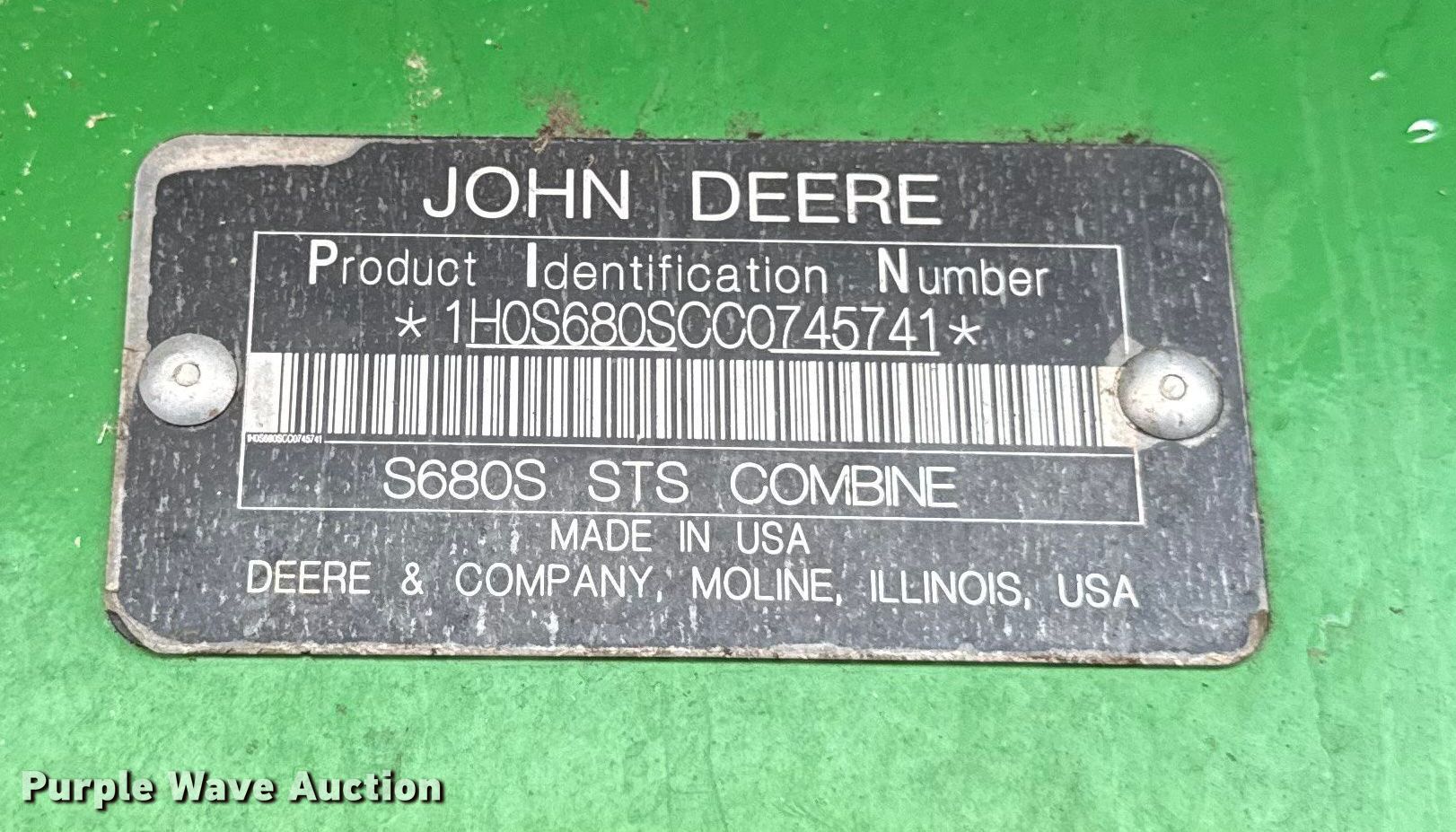 Purple Wave is selling a used Combine in Illinois. This item is a 2012 John Deere S680S STS combine with the following: Hours: Unknown, Serial: 1H0S680SCC0745741, Unit #: 96956255