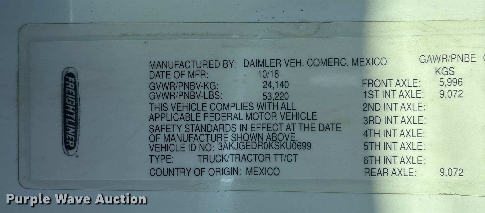 - VIN: 3AKJGEDR0KSKU0699