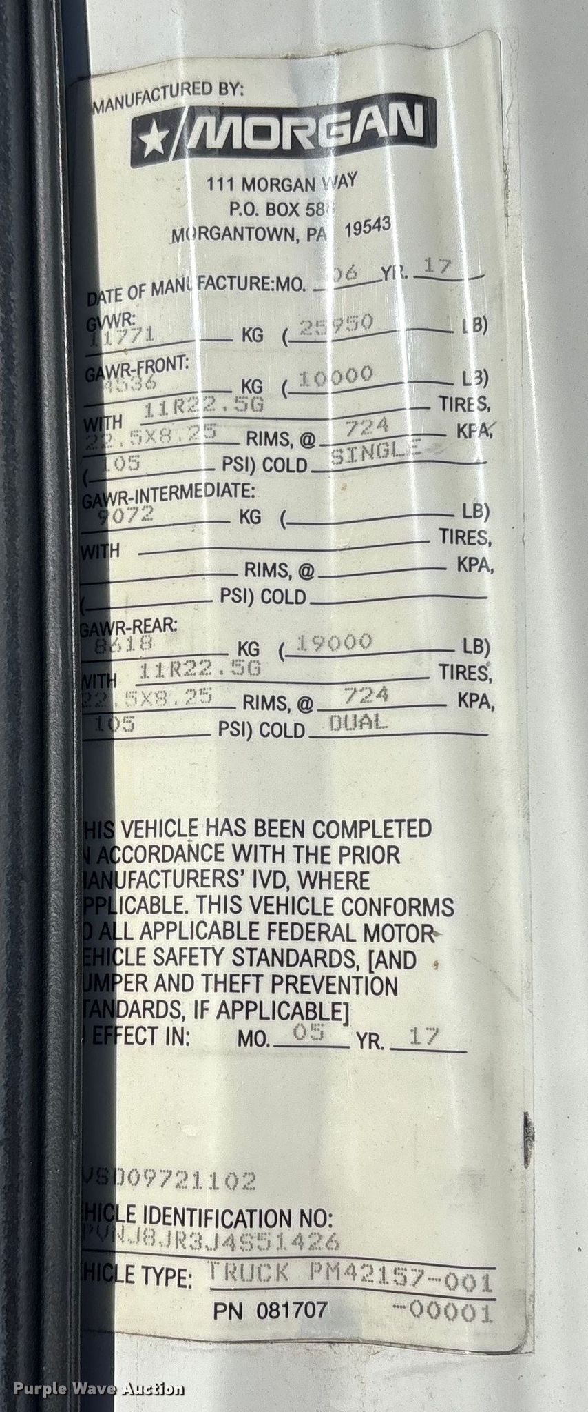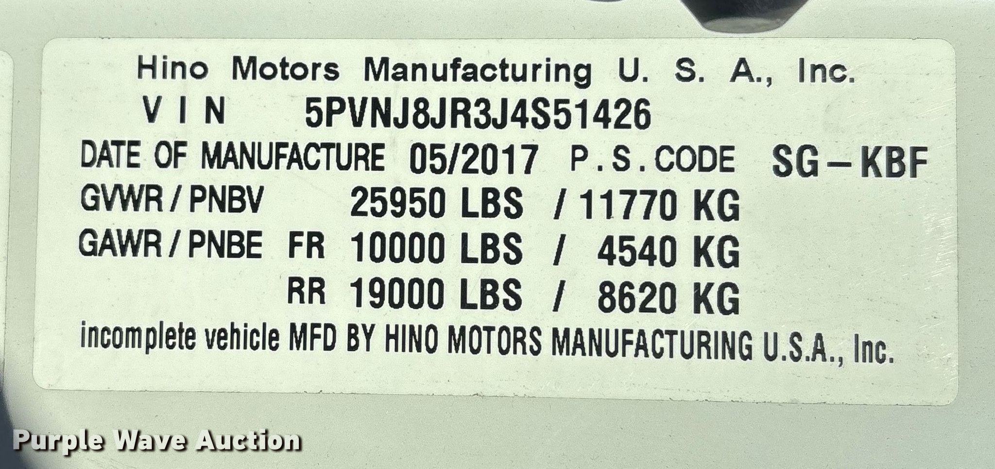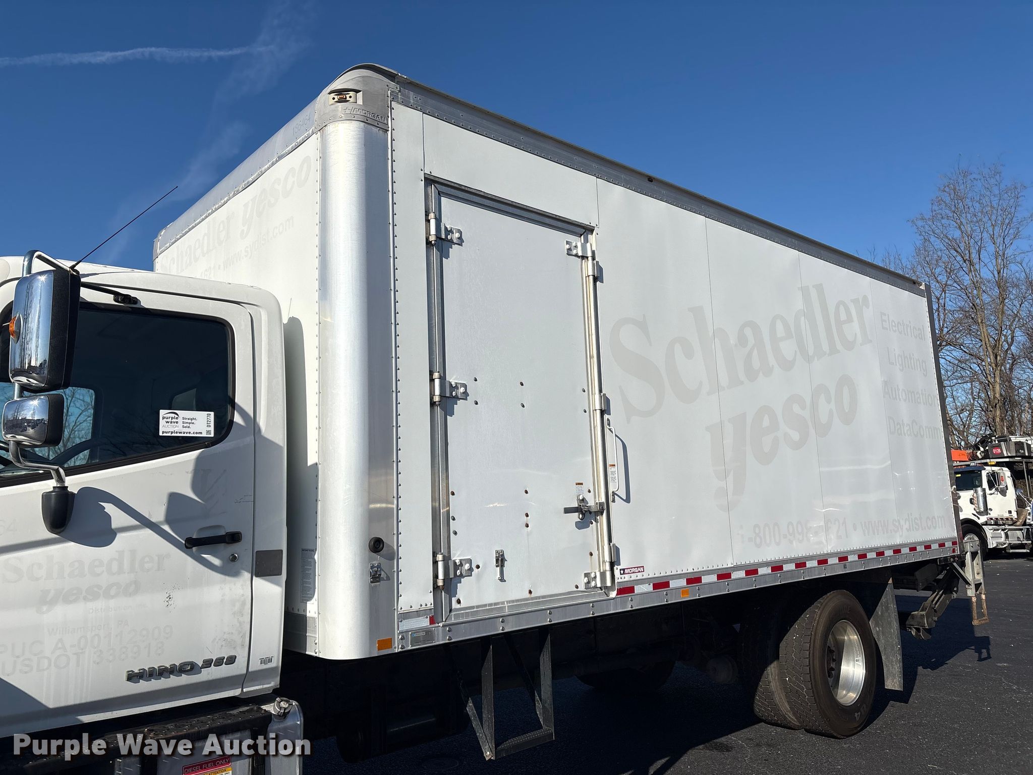 2018 Hino 268 box truck. Miles: 267,822 on odometer, VIN: 5PVNJ8JR3J4S51426. Engine Hino Motors J08E-WU, Displacement: 7.6L, Cylinders: 6, Fuel type: Diesel, HP: 230. Transmission Automatic. Chassis Axles: Single, Suspension: Air, Brakes: Air, GVWR: 25,950 lbs. Interior AC, Heat, Heated mirrors, Power windows, Power locks, Cruise control, Backup camera. Features Bed Box bed, Morgan GVSD09721102, Serial: PM42157-001, Length: 21', Width: 102", Height: 103", E-track rail system, Floor: Wood, End gate lift, Maxon GPT, Capacity: 3,000 lbs. Tires Size: 11R22.5. Titles will be distributed after confirmation of payment and removal.. Delaware buyers are responsible for paying the required Delaware document fee to Purple Wave at the time of purchase. The Delaware document fee is calculated at $13.75 up to $500.00 purchase price. Additional $5.25 added for every $100.00 of the purchase price above $500.00.. Pennsylvania title. Title distribution may be delayed up to 30 days from verification of funds. Bayshore Truck Center. New Castle, DE 19720
