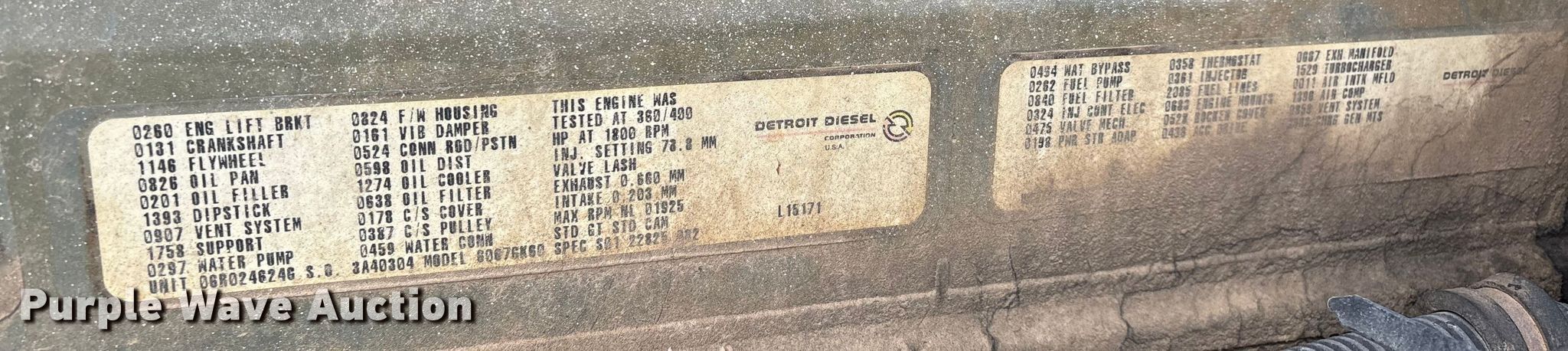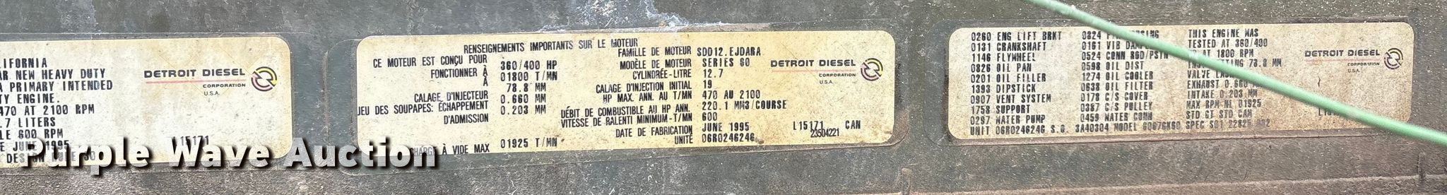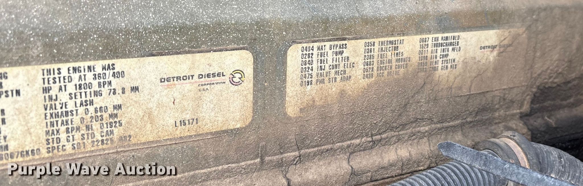 1996 Freightliner FLD120 truck cab and chassis. Miles: 28,969 on odometer Actual mileage unknown, Hours: 8,542 on meter, VIN: 2FUYDZYB9TA688311. Engine Detroit Diesel D60, Displacement: 12.7L, Cylinders: 6, Fuel type: Diesel. Transmission Eaton Fuller, Manual, Speed: 9. Chassis Axles: Tandem, Differential lock: Inter-axle, Suspension: Air, Brakes: Air, Truck chassis: 24' 1", GVWR: 52,000 lbs FAWR: 12,000 lbs, IAWR: 20,000 lbs, RAWR: 20,000 lbs. Interior AC, Heat, Air ride cab. Features Fuel tank: Single. Tires Front: 275/80R22.5, Rear: 11R22.5. Notes Windshield chipped or cracked, Jump start required during on-site data collection. Arkansas title. Title distribution may be delayed up to 30 days from verification of funds. MFA Enterprises. Piggott, AR 72454