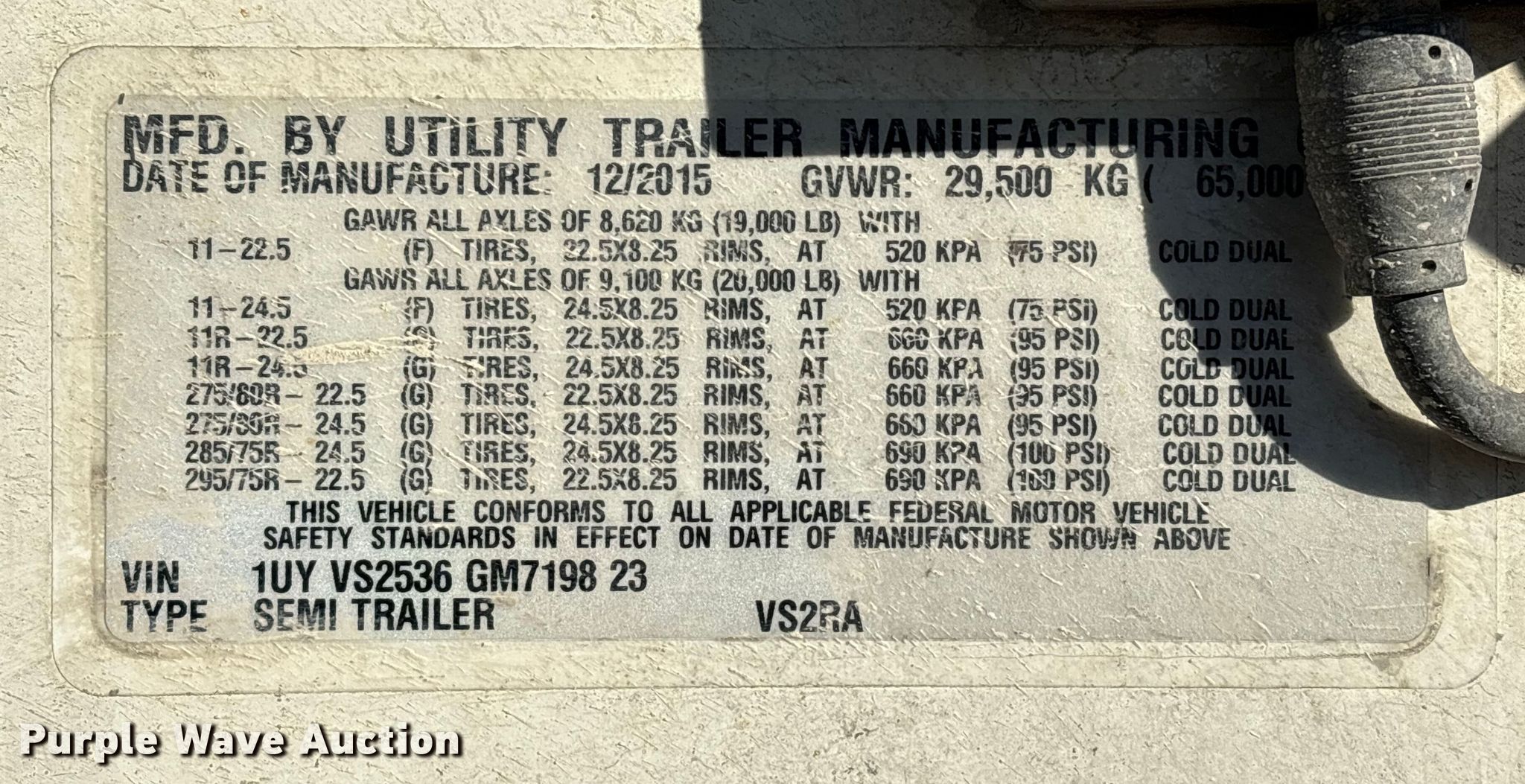 2016 Utility VS2RA refrigerated van trailer. VIN: 1UYVS2536GM719823. Dimensions Overall Length: 53', Width: 8' 6". Features Deck type: Aluminum, Refrigeration unit Carrier 7300x4. Chassis Landing gear: Dual, Suspension: Air, Brakes: Air, Axles: Tandem Sliding, GVWR: 65,000 lbs. Tires Steel wheels, Size: 295/75R22.5. Notes Non-operational display screen. Texas title. Title distribution may be delayed up to 14 days from verification of funds. B&B Ice & Water. Port Arthur, TX 77640