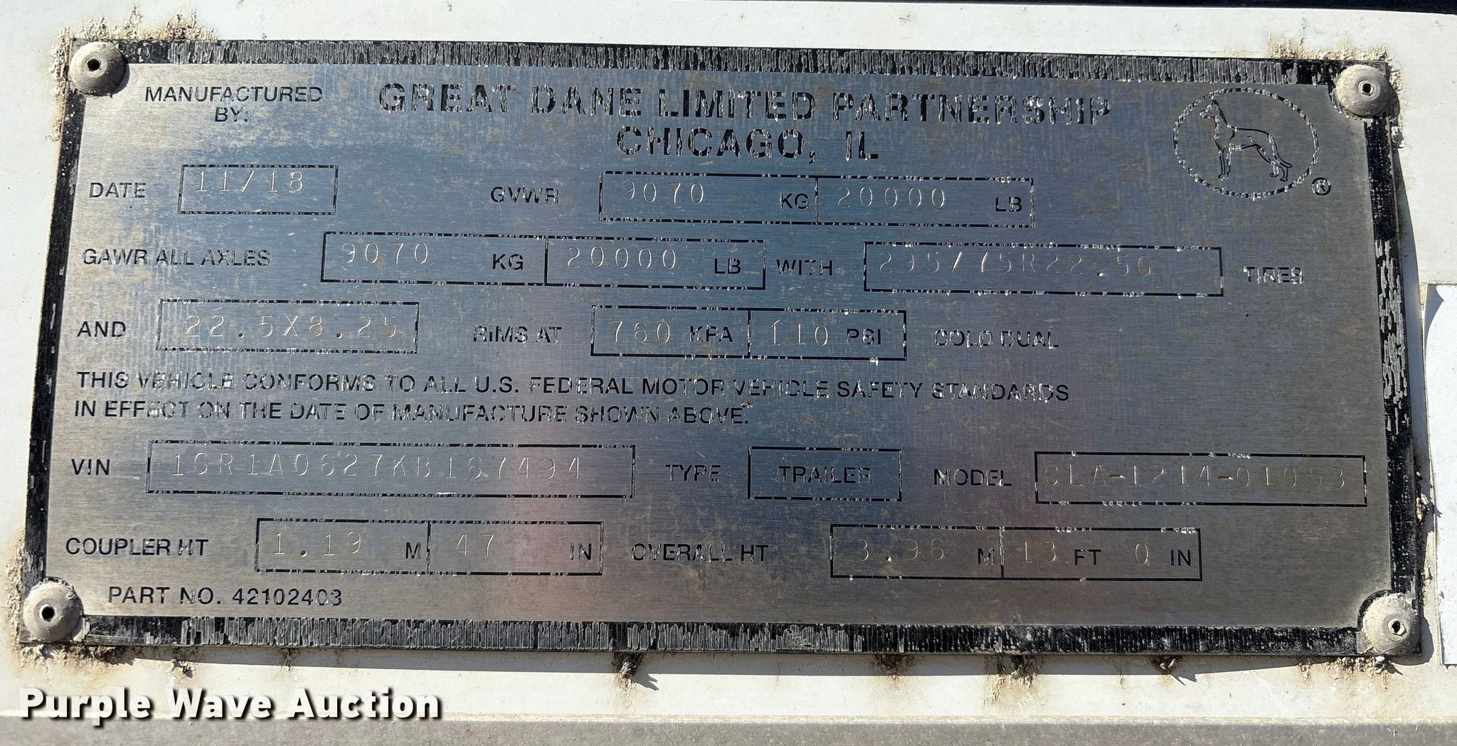 Purple Wave is selling a used Dry Van Trailer in Texas. This item is a 2019 Great Dane CLA-1214-01053 dry van trailer with the following: VIN: 1GR1AO627KB167494