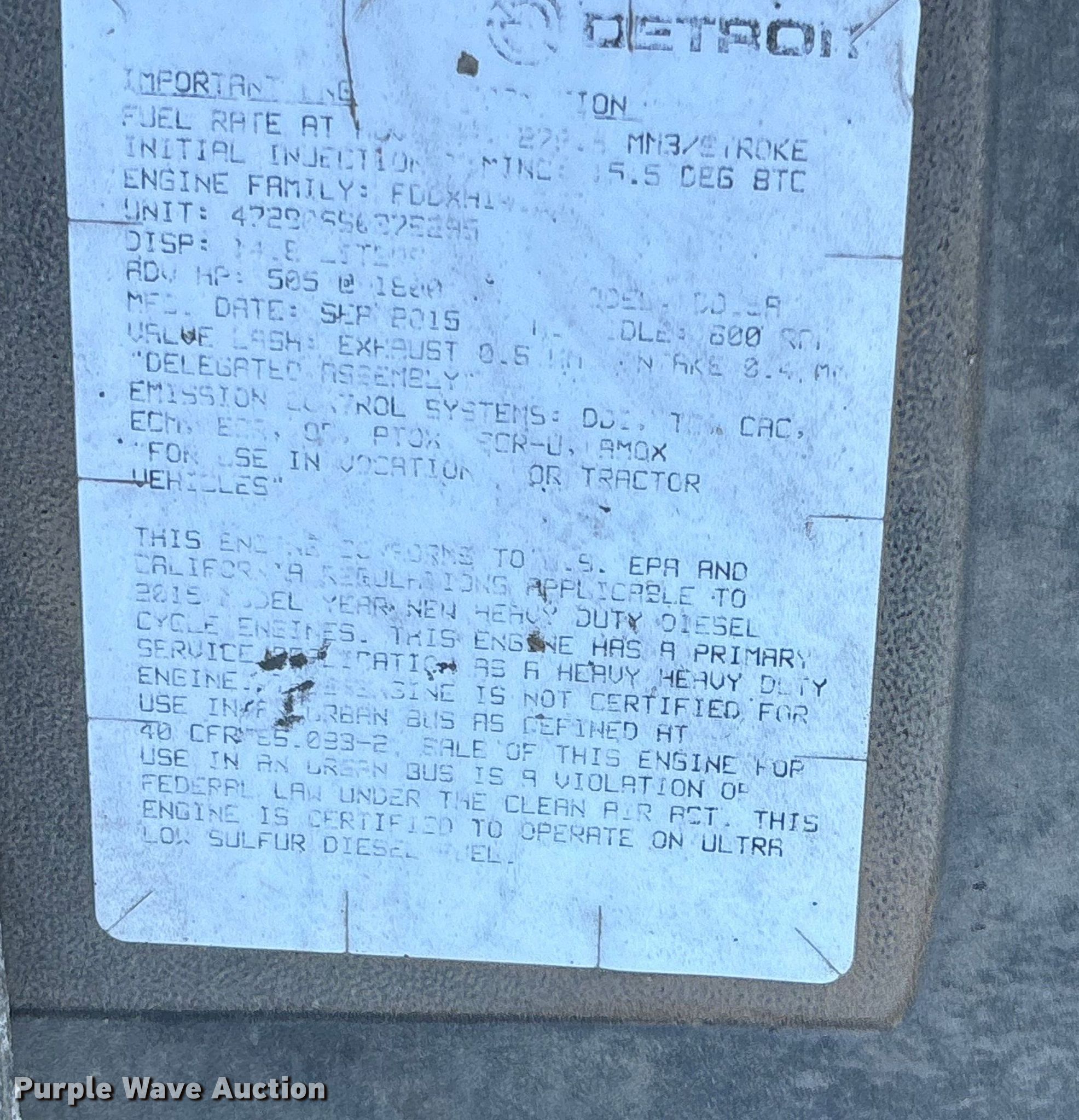 2016 Freightliner Cascadia 125 semi truck. Miles: 556,222 on odometer, VIN: 3AKJGLD52GSHD0214. Engine Detroit Diesel DD15, Displacement: 14.8L, Cylinders: 6, Fuel type: Diesel, Engine brake. Transmission Speed: 10. Chassis Axles: Tandem, Differential lock: Inter-axle, Suspension: Air Dump valves, Brakes: Air, GVWR: 52,000 lbs FAWR: 12,000 lbs, IAWR: 20,000 lbs, RAWR: 20,000 lbs. Interior AC, Heat, Heated mirrors, Power windows, Cruise control, Air ride cab, Sleeper Sleeper length: 60", Beds: Double bunk, Rear climate control. Features Fifth wheel type: Air operated, Sliding, Fuel tank: Dual. Tires Size: 295/75R22.5. Notes Windshield chipped or cracked. Oklahoma title. Seller is a licensed motor vehicle dealer. The buyer may be required to pay sales tax and/or registration fees to the dealer prior to taking possession. Buyers may be required to provide identification to the licensed dealer to comply with state laws. Title will be assigned and distributed by the dealer. Please contact the seller for distribution questions. McAlester, OK 74502